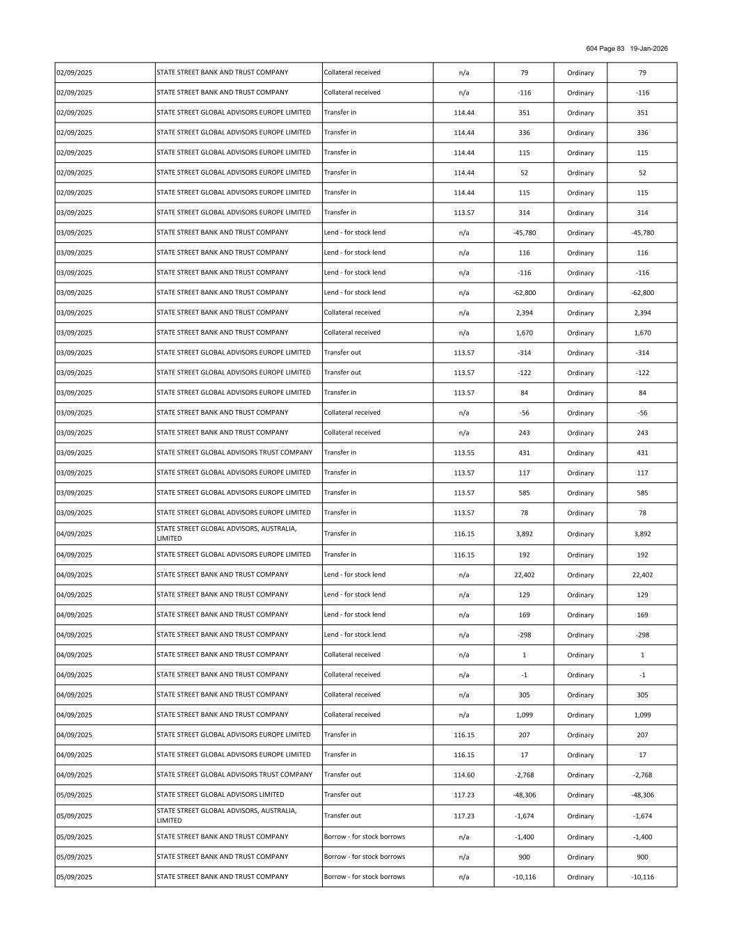 604 Page 84 19-Jan-2026 05/09/2025 n/a 10,116 Ordinary 10,116 05/09/2025 n/a -1 Ordinary -1 05/09/2025 n/a 1 Ordinary 1 05/09/2025 115.40 69 Ordinary 69 05/09/2025 117.23 48,131 Ordinary 48,131 05/09/2025 n/a -500 Ordinary -500 05/09/2025 n/a -764 Ordinary -764 05/09/2025 n/a 764 Ordinary 764 05/09/2025 n/a -378 Ordinary -378 05/09/2025 n/a 378 Ordinary 378 05/09/2025 n/a -6,418 Ordinary -6,418 05/09/2025 n/a 6,418 Ordinary 6,418 05/09/2025 n/a -3,479 Ordinary -3,479 05/09/2025 n/a 3,428 Ordinary 3,428 05/09/2025 n/a -3,379 Ordinary -3,379 05/09/2025 n/a 3,379 Ordinary 3,379 05/09/2025 n/a -43,497 Ordinary -43,497 05/09/2025 n/a 43,497 Ordinary 43,497 05/09/2025 n/a -10,905 Ordinary -10,905 05/09/2025 n/a 10,678 Ordinary 10,678 05/09/2025 n/a -1,534 Ordinary -1,534 05/09/2025 n/a 1,534 Ordinary 1,534 05/09/2025 n/a -38,292 Ordinary -38,292 05/09/2025 n/a 38,292 Ordinary 38,292 05/09/2025 n/a -34,881 Ordinary -34,881 05/09/2025 n/a 34,881 Ordinary 34,881 05/09/2025 n/a -51,118 Ordinary -51,118 05/09/2025 n/a 51,118 Ordinary 51,118 05/09/2025 117.23 115 Ordinary 115 08/09/2025 118.21 -8,958 Ordinary -8,958 08/09/2025 n/a -3,198 Ordinary -3,198 08/09/2025 n/a 3,734 Ordinary 3,734 08/09/2025 n/a 1,608 Ordinary 1,608 08/09/2025 n/a 263 Ordinary 263 08/09/2025 n/a 384 Ordinary 384 08/09/2025 n/a -66,876 Ordinary -66,876 08/09/2025 n/a -1,156 Ordinary -1,156 08/09/2025 n/a 3,198 Ordinary 3,198 08/09/2025 n/a 64,884 Ordinary 64,884 08/09/2025 n/a 122 Ordinary 122 08/09/2025 n/a 1,400 Ordinary 1,400 08/09/2025 n/a 777 Ordinary 777 STATE STREET BANK AND TRUST COMPANY STATE STREET BANK AND TRUST COMPANY Transfer in STATE STREET BANK AND TRUST COMPANY STATE STREET BANK AND TRUST COMPANY Lend - for stock lend Collateral received Collateral received STATE STREET BANK AND TRUST COMPANY Collateral received Collateral received STATE STREET BANK AND TRUST COMPANY STATE STREET GLOBAL ADVISORS TRUST COMPANY Lend - for stock lend Transfer in STATE STREET BANK AND TRUST COMPANY STATE STREET BANK AND TRUST COMPANY Lend - for stock lend Collateral received Collateral received STATE STREET BANK AND TRUST COMPANY STATE STREET BANK AND TRUST COMPANY STATE STREET BANK AND TRUST COMPANY STATE STREET BANK AND TRUST COMPANY Transfer in Collateral received STATE STREET BANK AND TRUST COMPANY Collateral received STATE STREET BANK AND TRUST COMPANY Lend - for stock lend Lend - for stock lend STATE STREET BANK AND TRUST COMPANY STATE STREET GLOBAL ADVISORS TRUST COMPANY Lend - for stock lend Lend - for stock lend STATE STREET BANK AND TRUST COMPANY STATE STREET BANK AND TRUST COMPANY Transfer out Collateral received STATE STREET BANK AND TRUST COMPANY Collateral received STATE STREET GLOBAL ADVISORS EUROPE LIMITED Lend - for stock lend Collateral received STATE STREET BANK AND TRUST COMPANY Collateral received STATE STREET BANK AND TRUST COMPANY Lend - for stock lend STATE STREET BANK AND TRUST COMPANY STATE STREET BANK AND TRUST COMPANY Collateral received STATE STREET BANK AND TRUST COMPANY Collateral received STATE STREET GLOBAL ADVISORS, AUSTRALIA, LIMITED STATE STREET BANK AND TRUST COMPANY Collateral received Collateral received STATE STREET BANK AND TRUST COMPANY STATE STREET BANK AND TRUST COMPANY STATE STREET BANK AND TRUST COMPANY Lend - for stock lend STATE STREET BANK AND TRUST COMPANY Lend - for stock lend Collateral received STATE STREET BANK AND TRUST COMPANY STATE STREET BANK AND TRUST COMPANY Collateral received Borrow - for stock borrows STATE STREET BANK AND TRUST COMPANY Collateral received Lend - for stock lend Collateral received STATE STREET BANK AND TRUST COMPANY STATE STREET BANK AND TRUST COMPANY Borrow - for stock borrows STATE STREET BANK AND TRUST COMPANY Lend - for stock lend Collateral received STATE STREET BANK AND TRUST COMPANY STATE STREET BANK AND TRUST COMPANY STATE STREET BANK AND TRUST COMPANY Collateral received STATE STREET BANK AND TRUST COMPANY Borrow - for stock borrows