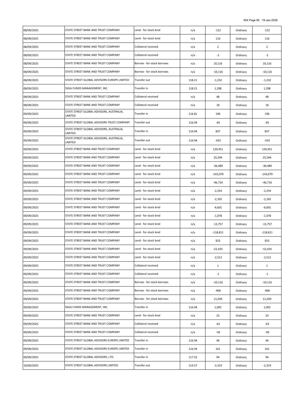 604 Page 85 19-Jan-2026 08/09/2025 n/a -122 Ordinary -122 08/09/2025 n/a 116 Ordinary 116 08/09/2025 n/a 2 Ordinary 2 08/09/2025 n/a -2 Ordinary -2 08/09/2025 n/a 10,116 Ordinary 10,116 08/09/2025 n/a -10,116 Ordinary -10,116 08/09/2025 118.21 -1,232 Ordinary -1,232 08/09/2025 118.21 1,298 Ordinary 1,298 08/09/2025 n/a 48 Ordinary 48 08/09/2025 n/a 18 Ordinary 18 09/09/2025 116.81 196 Ordinary 196 09/09/2025 116.94 -65 Ordinary -65 09/09/2025 116.94 837 Ordinary 837 09/09/2025 116.94 -433 Ordinary -433 09/09/2025 n/a 129,451 Ordinary 129,451 09/09/2025 n/a 25,594 Ordinary 25,594 09/09/2025 n/a -36,489 Ordinary -36,489 09/09/2025 n/a -143,079 Ordinary -143,079 09/09/2025 n/a -46,716 Ordinary -46,716 09/09/2025 n/a -2,254 Ordinary -2,254 09/09/2025 n/a -2,165 Ordinary -2,165 09/09/2025 n/a -6,601 Ordinary -6,601 09/09/2025 n/a -1,078 Ordinary -1,078 09/09/2025 n/a -13,757 Ordinary -13,757 09/09/2025 n/a -118,811 Ordinary -118,811 09/09/2025 n/a 923 Ordinary 923 09/09/2025 n/a -52,435 Ordinary -52,435 09/09/2025 n/a -2,512 Ordinary -2,512 09/09/2025 n/a 1 Ordinary 1 09/09/2025 n/a -1 Ordinary -1 09/09/2025 n/a -10,116 Ordinary -10,116 09/09/2025 n/a -900 Ordinary -900 09/09/2025 n/a 11,039 Ordinary 11,039 09/09/2025 116.94 1,092 Ordinary 1,092 09/09/2025 n/a 23 Ordinary 23 09/09/2025 n/a -63 Ordinary -63 09/09/2025 n/a -58 Ordinary -58 09/09/2025 116.94 46 Ordinary 46 09/09/2025 116.94 161 Ordinary 161 09/09/2025 117.55 94 Ordinary 94 10/09/2025 114.57 -2,319 Ordinary -2,319 Collateral received Lend - for stock lend STATE STREET GLOBAL ADVISORS EUROPE LIMITED Transfer out STATE STREET BANK AND TRUST COMPANY STATE STREET BANK AND TRUST COMPANY Transfer in STATE STREET BANK AND TRUST COMPANY STATE STREET BANK AND TRUST COMPANY Lend - for stock lend Lend - for stock lend STATE STREET GLOBAL ADVISORS EUROPE LIMITED Borrow - for stock borrows STATE STREET BANK AND TRUST COMPANY STATE STREET GLOBAL ADVISORS EUROPE LIMITED Lend - for stock lend STATE STREET GLOBAL ADVISORS, LTD. Transfer in STATE STREET BANK AND TRUST COMPANY Transfer out Collateral received STATE STREET BANK AND TRUST COMPANY STATE STREET BANK AND TRUST COMPANY Borrow - for stock borrows STATE STREET BANK AND TRUST COMPANY SSGA FUNDS MANAGEMENT, INC. Lend - for stock lend STATE STREET BANK AND TRUST COMPANY STATE STREET GLOBAL ADVISORS LIMITED Collateral received Borrow - for stock borrows Transfer in STATE STREET BANK AND TRUST COMPANY STATE STREET BANK AND TRUST COMPANY Borrow - for stock borrows Lend - for stock lend STATE STREET BANK AND TRUST COMPANY Lend - for stock lend Collateral received STATE STREET BANK AND TRUST COMPANY STATE STREET BANK AND TRUST COMPANY Transfer out STATE STREET BANK AND TRUST COMPANY Lend - for stock lend STATE STREET BANK AND TRUST COMPANY STATE STREET GLOBAL ADVISORS, AUSTRALIA, LIMITED Transfer in Lend - for stock lend STATE STREET BANK AND TRUST COMPANY Collateral received Lend - for stock lend Transfer out STATE STREET BANK AND TRUST COMPANY SSGA FUNDS MANAGEMENT, INC. Lend - for stock lend STATE STREET BANK AND TRUST COMPANY STATE STREET GLOBAL ADVISORS TRUST COMPANY Lend - for stock lend Lend - for stock lend Transfer in Collateral received STATE STREET BANK AND TRUST COMPANY STATE STREET GLOBAL ADVISORS, AUSTRALIA, LIMITED STATE STREET BANK AND TRUST COMPANY Collateral received Lend - for stock lend Lend - for stock lend STATE STREET BANK AND TRUST COMPANY STATE STREET BANK AND TRUST COMPANY STATE STREET BANK AND TRUST COMPANY Collateral received STATE STREET BANK AND TRUST COMPANY STATE STREET GLOBAL ADVISORS, AUSTRALIA, LIMITED Transfer in STATE STREET BANK AND TRUST COMPANY STATE STREET BANK AND TRUST COMPANY STATE STREET BANK AND TRUST COMPANY Lend - for stock lend Lend - for stock lend STATE STREET BANK AND TRUST COMPANY Borrow - for stock borrows Transfer in