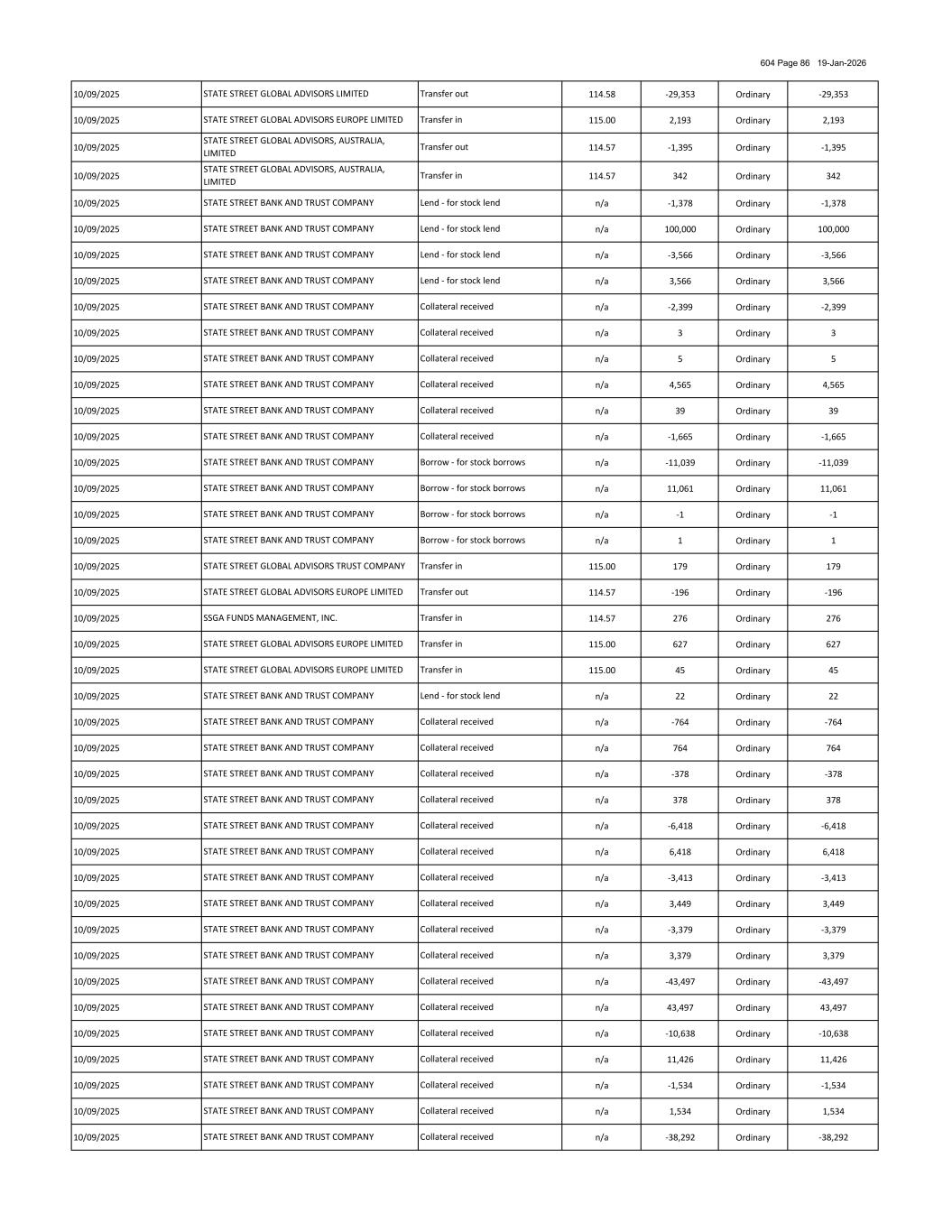 604 Page 86 19-Jan-2026 10/09/2025 114.58 -29,353 Ordinary -29,353 10/09/2025 115.00 2,193 Ordinary 2,193 10/09/2025 114.57 -1,395 Ordinary -1,395 10/09/2025 114.57 342 Ordinary 342 10/09/2025 n/a -1,378 Ordinary -1,378 10/09/2025 n/a 100,000 Ordinary 100,000 10/09/2025 n/a -3,566 Ordinary -3,566 10/09/2025 n/a 3,566 Ordinary 3,566 10/09/2025 n/a -2,399 Ordinary -2,399 10/09/2025 n/a 3 Ordinary 3 10/09/2025 n/a 5 Ordinary 5 10/09/2025 n/a 4,565 Ordinary 4,565 10/09/2025 n/a 39 Ordinary 39 10/09/2025 n/a -1,665 Ordinary -1,665 10/09/2025 n/a -11,039 Ordinary -11,039 10/09/2025 n/a 11,061 Ordinary 11,061 10/09/2025 n/a -1 Ordinary -1 10/09/2025 n/a 1 Ordinary 1 10/09/2025 115.00 179 Ordinary 179 10/09/2025 114.57 -196 Ordinary -196 10/09/2025 114.57 276 Ordinary 276 10/09/2025 115.00 627 Ordinary 627 10/09/2025 115.00 45 Ordinary 45 10/09/2025 n/a 22 Ordinary 22 10/09/2025 n/a -764 Ordinary -764 10/09/2025 n/a 764 Ordinary 764 10/09/2025 n/a -378 Ordinary -378 10/09/2025 n/a 378 Ordinary 378 10/09/2025 n/a -6,418 Ordinary -6,418 10/09/2025 n/a 6,418 Ordinary 6,418 10/09/2025 n/a -3,413 Ordinary -3,413 10/09/2025 n/a 3,449 Ordinary 3,449 10/09/2025 n/a -3,379 Ordinary -3,379 10/09/2025 n/a 3,379 Ordinary 3,379 10/09/2025 n/a -43,497 Ordinary -43,497 10/09/2025 n/a 43,497 Ordinary 43,497 10/09/2025 n/a -10,638 Ordinary -10,638 10/09/2025 n/a 11,426 Ordinary 11,426 10/09/2025 n/a -1,534 Ordinary -1,534 10/09/2025 n/a 1,534 Ordinary 1,534 10/09/2025 n/a -38,292 Ordinary -38,292 STATE STREET BANK AND TRUST COMPANY STATE STREET BANK AND TRUST COMPANY Collateral received STATE STREET BANK AND TRUST COMPANY STATE STREET GLOBAL ADVISORS EUROPE LIMITED Transfer in Collateral received STATE STREET BANK AND TRUST COMPANY Collateral received Transfer in Collateral received STATE STREET BANK AND TRUST COMPANY SSGA FUNDS MANAGEMENT, INC. Collateral received Transfer in STATE STREET BANK AND TRUST COMPANY Transfer in STATE STREET GLOBAL ADVISORS EUROPE LIMITED STATE STREET BANK AND TRUST COMPANY Collateral received Collateral received Lend - for stock lend Collateral received STATE STREET BANK AND TRUST COMPANY Transfer out STATE STREET GLOBAL ADVISORS EUROPE LIMITED STATE STREET BANK AND TRUST COMPANY STATE STREET GLOBAL ADVISORS EUROPE LIMITED Collateral received Transfer out STATE STREET BANK AND TRUST COMPANY STATE STREET BANK AND TRUST COMPANY Collateral received Collateral received Collateral received STATE STREET BANK AND TRUST COMPANY STATE STREET GLOBAL ADVISORS LIMITED Collateral received Borrow - for stock borrows STATE STREET BANK AND TRUST COMPANY Lend - for stock lend Collateral received Transfer in STATE STREET BANK AND TRUST COMPANY STATE STREET BANK AND TRUST COMPANY STATE STREET GLOBAL ADVISORS, AUSTRALIA, LIMITED Collateral received Borrow - for stock borrows STATE STREET BANK AND TRUST COMPANY STATE STREET BANK AND TRUST COMPANY STATE STREET BANK AND TRUST COMPANY Collateral received Borrow - for stock borrows STATE STREET BANK AND TRUST COMPANY Lend - for stock lend STATE STREET BANK AND TRUST COMPANY Collateral received STATE STREET BANK AND TRUST COMPANY STATE STREET BANK AND TRUST COMPANY STATE STREET GLOBAL ADVISORS, AUSTRALIA, LIMITED Collateral received Collateral received STATE STREET BANK AND TRUST COMPANY STATE STREET BANK AND TRUST COMPANY STATE STREET BANK AND TRUST COMPANY Borrow - for stock borrows Lend - for stock lend STATE STREET BANK AND TRUST COMPANY Collateral received Collateral received Transfer out STATE STREET BANK AND TRUST COMPANY Collateral received STATE STREET BANK AND TRUST COMPANY STATE STREET GLOBAL ADVISORS TRUST COMPANY Collateral received STATE STREET BANK AND TRUST COMPANY STATE STREET BANK AND TRUST COMPANY Transfer in STATE STREET BANK AND TRUST COMPANY Lend - for stock lend STATE STREET BANK AND TRUST COMPANY