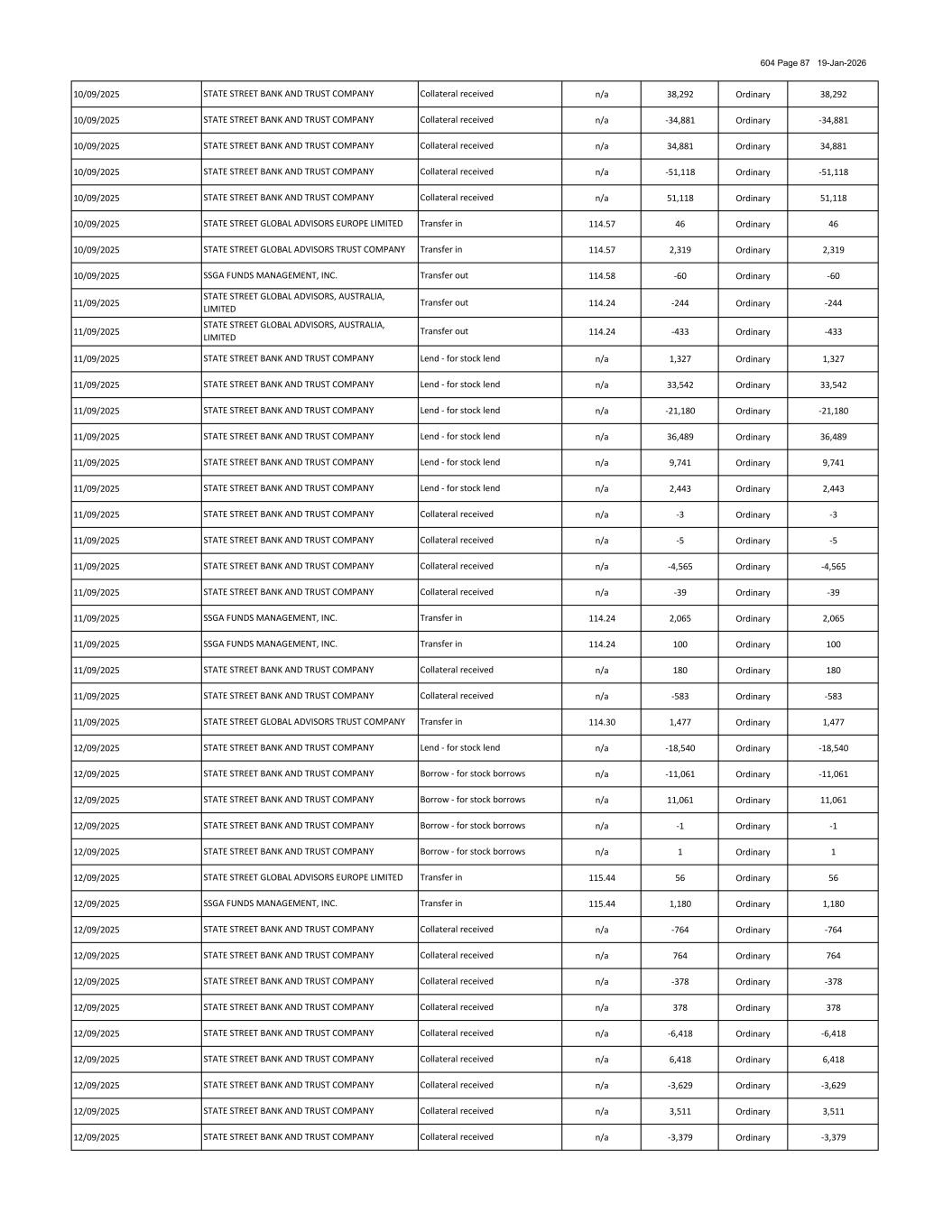604 Page 87 19-Jan-2026 10/09/2025 n/a 38,292 Ordinary 38,292 10/09/2025 n/a -34,881 Ordinary -34,881 10/09/2025 n/a 34,881 Ordinary 34,881 10/09/2025 n/a -51,118 Ordinary -51,118 10/09/2025 n/a 51,118 Ordinary 51,118 10/09/2025 114.57 46 Ordinary 46 10/09/2025 114.57 2,319 Ordinary 2,319 10/09/2025 114.58 -60 Ordinary -60 11/09/2025 114.24 -244 Ordinary -244 11/09/2025 114.24 -433 Ordinary -433 11/09/2025 n/a 1,327 Ordinary 1,327 11/09/2025 n/a 33,542 Ordinary 33,542 11/09/2025 n/a -21,180 Ordinary -21,180 11/09/2025 n/a 36,489 Ordinary 36,489 11/09/2025 n/a 9,741 Ordinary 9,741 11/09/2025 n/a 2,443 Ordinary 2,443 11/09/2025 n/a -3 Ordinary -3 11/09/2025 n/a -5 Ordinary -5 11/09/2025 n/a -4,565 Ordinary -4,565 11/09/2025 n/a -39 Ordinary -39 11/09/2025 114.24 2,065 Ordinary 2,065 11/09/2025 114.24 100 Ordinary 100 11/09/2025 n/a 180 Ordinary 180 11/09/2025 n/a -583 Ordinary -583 11/09/2025 114.30 1,477 Ordinary 1,477 12/09/2025 n/a -18,540 Ordinary -18,540 12/09/2025 n/a -11,061 Ordinary -11,061 12/09/2025 n/a 11,061 Ordinary 11,061 12/09/2025 n/a -1 Ordinary -1 12/09/2025 n/a 1 Ordinary 1 12/09/2025 115.44 56 Ordinary 56 12/09/2025 115.44 1,180 Ordinary 1,180 12/09/2025 n/a -764 Ordinary -764 12/09/2025 n/a 764 Ordinary 764 12/09/2025 n/a -378 Ordinary -378 12/09/2025 n/a 378 Ordinary 378 12/09/2025 n/a -6,418 Ordinary -6,418 12/09/2025 n/a 6,418 Ordinary 6,418 12/09/2025 n/a -3,629 Ordinary -3,629 12/09/2025 n/a 3,511 Ordinary 3,511 12/09/2025 n/a -3,379 Ordinary -3,379 Collateral received Transfer in Lend - for stock lend STATE STREET BANK AND TRUST COMPANY STATE STREET BANK AND TRUST COMPANY STATE STREET BANK AND TRUST COMPANY Collateral received STATE STREET BANK AND TRUST COMPANY STATE STREET BANK AND TRUST COMPANY Collateral received Collateral received Collateral received Lend - for stock lend STATE STREET GLOBAL ADVISORS TRUST COMPANY STATE STREET BANK AND TRUST COMPANY STATE STREET BANK AND TRUST COMPANY Lend - for stock lend Lend - for stock lend STATE STREET BANK AND TRUST COMPANY STATE STREET BANK AND TRUST COMPANY Collateral received Collateral received STATE STREET BANK AND TRUST COMPANY STATE STREET BANK AND TRUST COMPANY Collateral received STATE STREET BANK AND TRUST COMPANY STATE STREET BANK AND TRUST COMPANY STATE STREET BANK AND TRUST COMPANY Borrow - for stock borrows STATE STREET BANK AND TRUST COMPANY Lend - for stock lend Collateral received Collateral received Collateral received STATE STREET BANK AND TRUST COMPANY Transfer in STATE STREET BANK AND TRUST COMPANY Collateral received Borrow - for stock borrows STATE STREET BANK AND TRUST COMPANY Collateral received Borrow - for stock borrows STATE STREET BANK AND TRUST COMPANY STATE STREET BANK AND TRUST COMPANY Transfer in STATE STREET BANK AND TRUST COMPANY STATE STREET BANK AND TRUST COMPANY STATE STREET GLOBAL ADVISORS TRUST COMPANY Collateral received STATE STREET BANK AND TRUST COMPANY Transfer out STATE STREET BANK AND TRUST COMPANY Collateral received Borrow - for stock borrows STATE STREET BANK AND TRUST COMPANY STATE STREET GLOBAL ADVISORS EUROPE LIMITED Transfer in Transfer in SSGA FUNDS MANAGEMENT, INC. STATE STREET BANK AND TRUST COMPANY Collateral received STATE STREET BANK AND TRUST COMPANY Transfer out STATE STREET BANK AND TRUST COMPANY Transfer in Transfer in Lend - for stock lend SSGA FUNDS MANAGEMENT, INC. SSGA FUNDS MANAGEMENT, INC. Collateral received STATE STREET GLOBAL ADVISORS, AUSTRALIA, LIMITED Transfer out STATE STREET GLOBAL ADVISORS EUROPE LIMITED STATE STREET BANK AND TRUST COMPANY Lend - for stock lend STATE STREET BANK AND TRUST COMPANY Collateral received SSGA FUNDS MANAGEMENT, INC. STATE STREET BANK AND TRUST COMPANY Collateral received Collateral received STATE STREET GLOBAL ADVISORS, AUSTRALIA, LIMITED