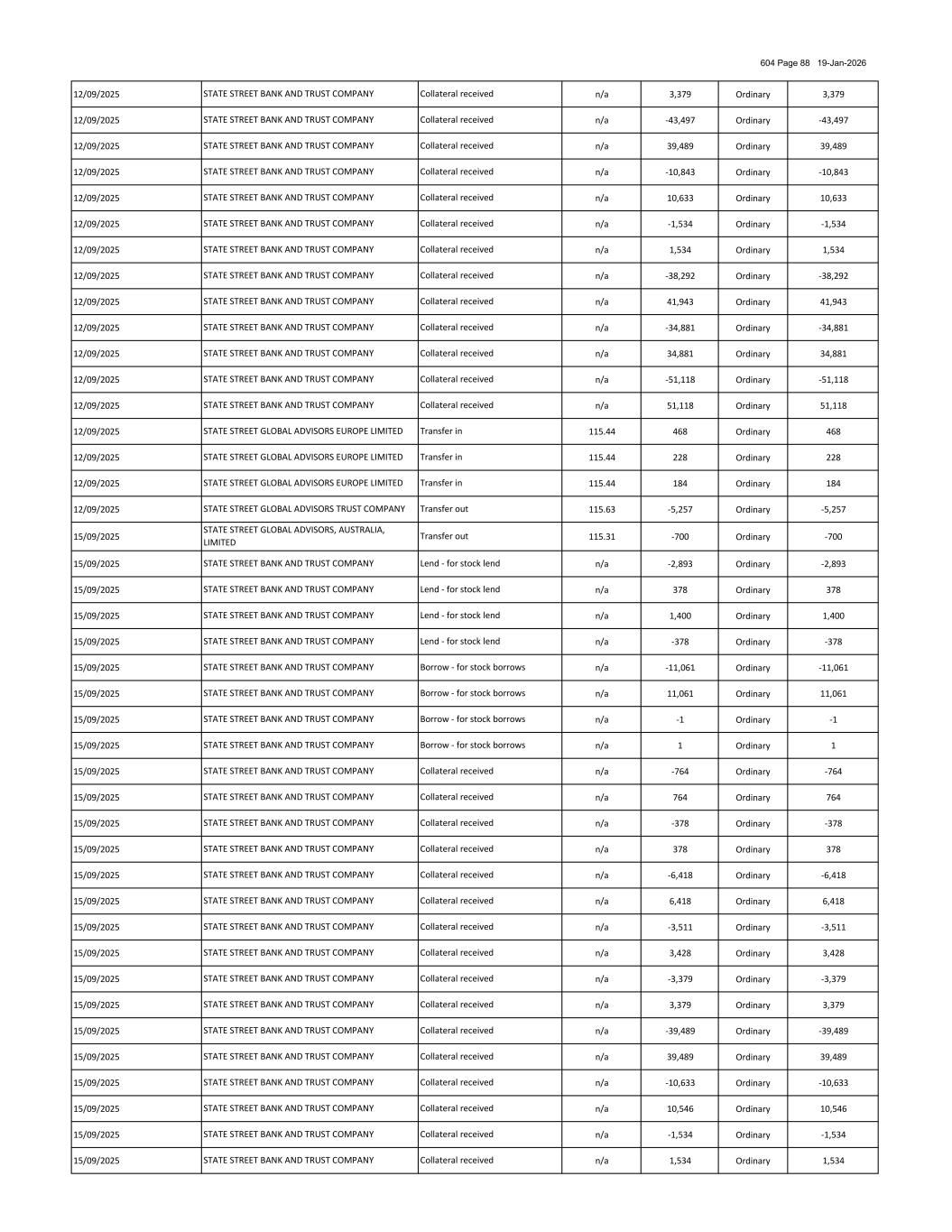 604 Page 88 19-Jan-2026 12/09/2025 n/a 3,379 Ordinary 3,379 12/09/2025 n/a -43,497 Ordinary -43,497 12/09/2025 n/a 39,489 Ordinary 39,489 12/09/2025 n/a -10,843 Ordinary -10,843 12/09/2025 n/a 10,633 Ordinary 10,633 12/09/2025 n/a -1,534 Ordinary -1,534 12/09/2025 n/a 1,534 Ordinary 1,534 12/09/2025 n/a -38,292 Ordinary -38,292 12/09/2025 n/a 41,943 Ordinary 41,943 12/09/2025 n/a -34,881 Ordinary -34,881 12/09/2025 n/a 34,881 Ordinary 34,881 12/09/2025 n/a -51,118 Ordinary -51,118 12/09/2025 n/a 51,118 Ordinary 51,118 12/09/2025 115.44 468 Ordinary 468 12/09/2025 115.44 228 Ordinary 228 12/09/2025 115.44 184 Ordinary 184 12/09/2025 115.63 -5,257 Ordinary -5,257 15/09/2025 115.31 -700 Ordinary -700 15/09/2025 n/a -2,893 Ordinary -2,893 15/09/2025 n/a 378 Ordinary 378 15/09/2025 n/a 1,400 Ordinary 1,400 15/09/2025 n/a -378 Ordinary -378 15/09/2025 n/a -11,061 Ordinary -11,061 15/09/2025 n/a 11,061 Ordinary 11,061 15/09/2025 n/a -1 Ordinary -1 15/09/2025 n/a 1 Ordinary 1 15/09/2025 n/a -764 Ordinary -764 15/09/2025 n/a 764 Ordinary 764 15/09/2025 n/a -378 Ordinary -378 15/09/2025 n/a 378 Ordinary 378 15/09/2025 n/a -6,418 Ordinary -6,418 15/09/2025 n/a 6,418 Ordinary 6,418 15/09/2025 n/a -3,511 Ordinary -3,511 15/09/2025 n/a 3,428 Ordinary 3,428 15/09/2025 n/a -3,379 Ordinary -3,379 15/09/2025 n/a 3,379 Ordinary 3,379 15/09/2025 n/a -39,489 Ordinary -39,489 15/09/2025 n/a 39,489 Ordinary 39,489 15/09/2025 n/a -10,633 Ordinary -10,633 15/09/2025 n/a 10,546 Ordinary 10,546 15/09/2025 n/a -1,534 Ordinary -1,534 15/09/2025 n/a 1,534 Ordinary 1,534 STATE STREET GLOBAL ADVISORS EUROPE LIMITED STATE STREET BANK AND TRUST COMPANY Collateral received Transfer out STATE STREET BANK AND TRUST COMPANY Collateral received STATE STREET BANK AND TRUST COMPANY Collateral received STATE STREET BANK AND TRUST COMPANY STATE STREET GLOBAL ADVISORS EUROPE LIMITED STATE STREET BANK AND TRUST COMPANY Collateral received Collateral received STATE STREET GLOBAL ADVISORS TRUST COMPANY STATE STREET BANK AND TRUST COMPANY Transfer out STATE STREET BANK AND TRUST COMPANY Collateral received STATE STREET BANK AND TRUST COMPANY Collateral received STATE STREET BANK AND TRUST COMPANY Collateral received Collateral received STATE STREET BANK AND TRUST COMPANY STATE STREET BANK AND TRUST COMPANY Collateral received Collateral received Lend - for stock lend STATE STREET BANK AND TRUST COMPANY Lend - for stock lend STATE STREET BANK AND TRUST COMPANY STATE STREET BANK AND TRUST COMPANY STATE STREET BANK AND TRUST COMPANY Collateral received STATE STREET GLOBAL ADVISORS, AUSTRALIA, LIMITED STATE STREET BANK AND TRUST COMPANY Collateral received STATE STREET BANK AND TRUST COMPANY STATE STREET BANK AND TRUST COMPANY Collateral received Lend - for stock lend Collateral received STATE STREET BANK AND TRUST COMPANY Collateral received Borrow - for stock borrows Collateral received STATE STREET BANK AND TRUST COMPANY STATE STREET BANK AND TRUST COMPANY STATE STREET BANK AND TRUST COMPANY Collateral received Lend - for stock lend STATE STREET BANK AND TRUST COMPANY Collateral received STATE STREET BANK AND TRUST COMPANY STATE STREET BANK AND TRUST COMPANY Collateral received Borrow - for stock borrows Collateral received STATE STREET BANK AND TRUST COMPANY Collateral received STATE STREET BANK AND TRUST COMPANY STATE STREET BANK AND TRUST COMPANY Collateral received STATE STREET BANK AND TRUST COMPANY Collateral received STATE STREET BANK AND TRUST COMPANY STATE STREET BANK AND TRUST COMPANY Collateral received Borrow - for stock borrows Transfer in STATE STREET BANK AND TRUST COMPANY STATE STREET BANK AND TRUST COMPANY Collateral received STATE STREET BANK AND TRUST COMPANY Transfer in Collateral received Collateral received STATE STREET BANK AND TRUST COMPANY STATE STREET GLOBAL ADVISORS EUROPE LIMITED STATE STREET BANK AND TRUST COMPANY Borrow - for stock borrows Collateral received STATE STREET BANK AND TRUST COMPANY Transfer in
