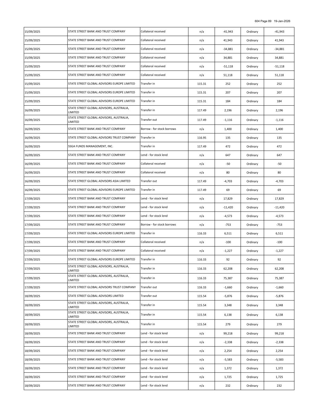 604 Page 89 19-Jan-2026 15/09/2025 n/a -41,943 Ordinary -41,943 15/09/2025 n/a 41,943 Ordinary 41,943 15/09/2025 n/a -34,881 Ordinary -34,881 15/09/2025 n/a 34,881 Ordinary 34,881 15/09/2025 n/a -51,118 Ordinary -51,118 15/09/2025 n/a 51,118 Ordinary 51,118 15/09/2025 115.31 252 Ordinary 252 15/09/2025 115.31 207 Ordinary 207 15/09/2025 115.31 184 Ordinary 184 16/09/2025 117.49 2,196 Ordinary 2,196 16/09/2025 117.49 -1,116 Ordinary -1,116 16/09/2025 n/a 1,400 Ordinary 1,400 16/09/2025 116.95 135 Ordinary 135 16/09/2025 117.49 472 Ordinary 472 16/09/2025 n/a 647 Ordinary 647 16/09/2025 n/a -50 Ordinary -50 16/09/2025 n/a 80 Ordinary 80 16/09/2025 117.49 -4,703 Ordinary -4,703 16/09/2025 117.49 69 Ordinary 69 17/09/2025 n/a 17,829 Ordinary 17,829 17/09/2025 n/a -11,420 Ordinary -11,420 17/09/2025 n/a -4,573 Ordinary -4,573 17/09/2025 n/a -753 Ordinary -753 17/09/2025 116.33 6,511 Ordinary 6,511 17/09/2025 n/a -100 Ordinary -100 17/09/2025 n/a -1,227 Ordinary -1,227 17/09/2025 116.33 92 Ordinary 92 17/09/2025 116.33 62,208 Ordinary 62,208 17/09/2025 116.33 75,387 Ordinary 75,387 17/09/2025 116.33 -1,660 Ordinary -1,660 18/09/2025 115.54 -5,876 Ordinary -5,876 18/09/2025 115.54 3,348 Ordinary 3,348 18/09/2025 115.54 6,138 Ordinary 6,138 18/09/2025 115.54 279 Ordinary 279 18/09/2025 n/a 99,218 Ordinary 99,218 18/09/2025 n/a -2,338 Ordinary -2,338 18/09/2025 n/a 2,254 Ordinary 2,254 18/09/2025 n/a -5,583 Ordinary -5,583 18/09/2025 n/a 1,372 Ordinary 1,372 18/09/2025 n/a 1,725 Ordinary 1,725 18/09/2025 n/a 232 Ordinary 232 Transfer out Lend - for stock lend STATE STREET BANK AND TRUST COMPANY STATE STREET GLOBAL ADVISORS EUROPE LIMITED Transfer in STATE STREET BANK AND TRUST COMPANY STATE STREET GLOBAL ADVISORS, AUSTRALIA, LIMITED STATE STREET GLOBAL ADVISORS ASIA LIMITED Lend - for stock lend Transfer out Transfer in Transfer in STATE STREET GLOBAL ADVISORS LIMITED STATE STREET BANK AND TRUST COMPANY STATE STREET GLOBAL ADVISORS EUROPE LIMITED Transfer in STATE STREET GLOBAL ADVISORS EUROPE LIMITED Lend - for stock lend STATE STREET GLOBAL ADVISORS TRUST COMPANY STATE STREET GLOBAL ADVISORS EUROPE LIMITED Transfer in STATE STREET GLOBAL ADVISORS, AUSTRALIA, LIMITED STATE STREET BANK AND TRUST COMPANY STATE STREET GLOBAL ADVISORS, AUSTRALIA, LIMITED Transfer in Lend - for stock lend Transfer out Transfer in STATE STREET GLOBAL ADVISORS, AUSTRALIA, LIMITED Transfer in Lend - for stock lend Collateral received STATE STREET BANK AND TRUST COMPANY STATE STREET GLOBAL ADVISORS, AUSTRALIA, LIMITED Borrow - for stock borrows Transfer in STATE STREET GLOBAL ADVISORS EUROPE LIMITED Borrow - for stock borrows STATE STREET GLOBAL ADVISORS, AUSTRALIA, LIMITED STATE STREET GLOBAL ADVISORS TRUST COMPANY STATE STREET BANK AND TRUST COMPANY Collateral received Transfer in STATE STREET BANK AND TRUST COMPANY Collateral received Lend - for stock lend STATE STREET BANK AND TRUST COMPANY Collateral received STATE STREET BANK AND TRUST COMPANY STATE STREET BANK AND TRUST COMPANY Lend - for stock lend Transfer in SSGA FUNDS MANAGEMENT, INC. STATE STREET BANK AND TRUST COMPANY Collateral received Lend - for stock lend STATE STREET BANK AND TRUST COMPANY Collateral received STATE STREET BANK AND TRUST COMPANY Lend - for stock lend Collateral received STATE STREET BANK AND TRUST COMPANY STATE STREET GLOBAL ADVISORS EUROPE LIMITED Collateral received Lend - for stock lend Transfer in STATE STREET BANK AND TRUST COMPANY STATE STREET BANK AND TRUST COMPANY Collateral received STATE STREET BANK AND TRUST COMPANY STATE STREET BANK AND TRUST COMPANY Collateral received STATE STREET BANK AND TRUST COMPANY Transfer out STATE STREET BANK AND TRUST COMPANY Transfer in STATE STREET BANK AND TRUST COMPANY STATE STREET GLOBAL ADVISORS, AUSTRALIA, LIMITED Lend - for stock lend Transfer in STATE STREET BANK AND TRUST COMPANY STATE STREET BANK AND TRUST COMPANY