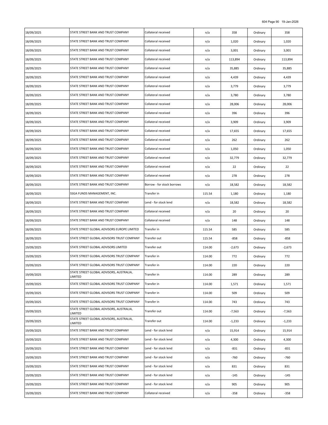 604 Page 90 19-Jan-2026 18/09/2025 n/a 358 Ordinary 358 18/09/2025 n/a 1,020 Ordinary 1,020 18/09/2025 n/a 3,001 Ordinary 3,001 18/09/2025 n/a 113,894 Ordinary 113,894 18/09/2025 n/a 35,885 Ordinary 35,885 18/09/2025 n/a 4,439 Ordinary 4,439 18/09/2025 n/a 3,779 Ordinary 3,779 18/09/2025 n/a 3,780 Ordinary 3,780 18/09/2025 n/a 28,006 Ordinary 28,006 18/09/2025 n/a 396 Ordinary 396 18/09/2025 n/a 3,909 Ordinary 3,909 18/09/2025 n/a 17,655 Ordinary 17,655 18/09/2025 n/a 262 Ordinary 262 18/09/2025 n/a 1,050 Ordinary 1,050 18/09/2025 n/a 32,779 Ordinary 32,779 18/09/2025 n/a 22 Ordinary 22 18/09/2025 n/a 278 Ordinary 278 18/09/2025 n/a 18,582 Ordinary 18,582 18/09/2025 115.54 1,180 Ordinary 1,180 18/09/2025 n/a 18,582 Ordinary 18,582 18/09/2025 n/a 20 Ordinary 20 18/09/2025 n/a 148 Ordinary 148 18/09/2025 115.54 585 Ordinary 585 18/09/2025 115.54 -858 Ordinary -858 19/09/2025 114.00 -2,673 Ordinary -2,673 19/09/2025 114.00 772 Ordinary 772 19/09/2025 114.00 220 Ordinary 220 19/09/2025 114.00 289 Ordinary 289 19/09/2025 114.00 1,571 Ordinary 1,571 19/09/2025 114.00 509 Ordinary 509 19/09/2025 114.00 743 Ordinary 743 19/09/2025 114.00 -7,563 Ordinary -7,563 19/09/2025 114.00 -1,233 Ordinary -1,233 19/09/2025 n/a 15,914 Ordinary 15,914 19/09/2025 n/a 4,300 Ordinary 4,300 19/09/2025 n/a -831 Ordinary -831 19/09/2025 n/a -760 Ordinary -760 19/09/2025 n/a 831 Ordinary 831 19/09/2025 n/a -145 Ordinary -145 19/09/2025 n/a 905 Ordinary 905 19/09/2025 n/a -358 Ordinary -358 STATE STREET GLOBAL ADVISORS, AUSTRALIA, LIMITED Collateral received Collateral received Transfer in Lend - for stock lend STATE STREET BANK AND TRUST COMPANY STATE STREET BANK AND TRUST COMPANY STATE STREET BANK AND TRUST COMPANY STATE STREET BANK AND TRUST COMPANY STATE STREET GLOBAL ADVISORS, AUSTRALIA, LIMITED STATE STREET BANK AND TRUST COMPANY STATE STREET GLOBAL ADVISORS EUROPE LIMITED Lend - for stock lend STATE STREET BANK AND TRUST COMPANY Lend - for stock lend Collateral received STATE STREET BANK AND TRUST COMPANY Collateral received Transfer out Lend - for stock lend Collateral received STATE STREET GLOBAL ADVISORS LIMITED STATE STREET BANK AND TRUST COMPANY Collateral received Transfer in STATE STREET BANK AND TRUST COMPANY STATE STREET BANK AND TRUST COMPANY Collateral received Transfer out STATE STREET BANK AND TRUST COMPANY STATE STREET GLOBAL ADVISORS TRUST COMPANY Collateral received STATE STREET GLOBAL ADVISORS TRUST COMPANY STATE STREET BANK AND TRUST COMPANY STATE STREET BANK AND TRUST COMPANY Collateral received Collateral received STATE STREET BANK AND TRUST COMPANY STATE STREET BANK AND TRUST COMPANY Lend - for stock lend Transfer in STATE STREET BANK AND TRUST COMPANY STATE STREET BANK AND TRUST COMPANY Transfer in STATE STREET BANK AND TRUST COMPANY Lend - for stock lend Transfer in Collateral received Lend - for stock lend STATE STREET GLOBAL ADVISORS TRUST COMPANY STATE STREET BANK AND TRUST COMPANY Transfer in Collateral received Collateral received Transfer in Collateral received STATE STREET BANK AND TRUST COMPANY STATE STREET GLOBAL ADVISORS TRUST COMPANY STATE STREET BANK AND TRUST COMPANY STATE STREET BANK AND TRUST COMPANY STATE STREET BANK AND TRUST COMPANY STATE STREET GLOBAL ADVISORS, AUSTRALIA, LIMITED STATE STREET BANK AND TRUST COMPANY Borrow - for stock borrows Collateral received STATE STREET BANK AND TRUST COMPANY SSGA FUNDS MANAGEMENT, INC. STATE STREET GLOBAL ADVISORS TRUST COMPANY Collateral received STATE STREET BANK AND TRUST COMPANY STATE STREET BANK AND TRUST COMPANY Lend - for stock lend Transfer in Collateral received Collateral received Transfer out Collateral received Transfer out STATE STREET BANK AND TRUST COMPANY STATE STREET GLOBAL ADVISORS TRUST COMPANY Collateral received STATE STREET BANK AND TRUST COMPANY