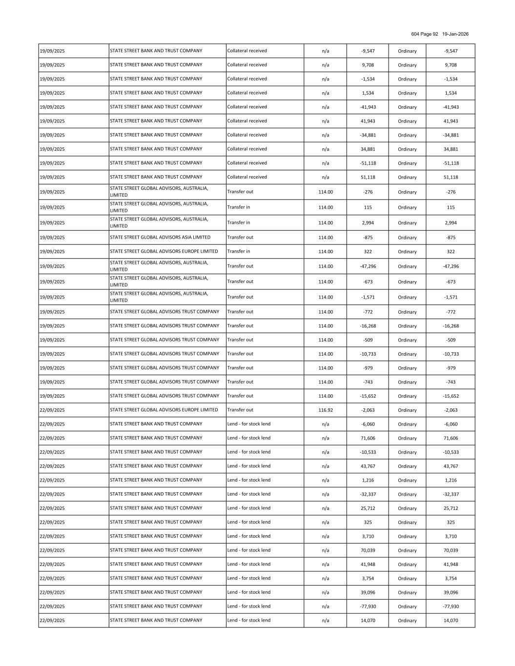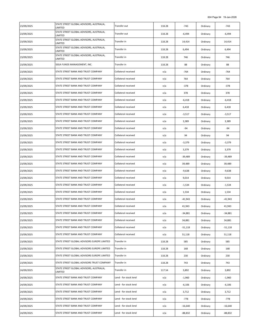 604 Page 92 19-Jan-2026 19/09/2025 n/a -9,547 Ordinary -9,547 19/09/2025 n/a 9,708 Ordinary 9,708 19/09/2025 n/a -1,534 Ordinary -1,534 19/09/2025 n/a 1,534 Ordinary 1,534 19/09/2025 n/a -41,943 Ordinary -41,943 19/09/2025 n/a 41,943 Ordinary 41,943 19/09/2025 n/a -34,881 Ordinary -34,881 19/09/2025 n/a 34,881 Ordinary 34,881 19/09/2025 n/a -51,118 Ordinary -51,118 19/09/2025 n/a 51,118 Ordinary 51,118 19/09/2025 114.00 -276 Ordinary -276 19/09/2025 114.00 115 Ordinary 115 19/09/2025 114.00 2,994 Ordinary 2,994 19/09/2025 114.00 -875 Ordinary -875 19/09/2025 114.00 322 Ordinary 322 19/09/2025 114.00 -47,296 Ordinary -47,296 19/09/2025 114.00 -673 Ordinary -673 19/09/2025 114.00 -1,571 Ordinary -1,571 19/09/2025 114.00 -772 Ordinary -772 19/09/2025 114.00 -16,268 Ordinary -16,268 19/09/2025 114.00 -509 Ordinary -509 19/09/2025 114.00 -10,733 Ordinary -10,733 19/09/2025 114.00 -979 Ordinary -979 19/09/2025 114.00 -743 Ordinary -743 19/09/2025 114.00 -15,652 Ordinary -15,652 22/09/2025 116.92 -2,063 Ordinary -2,063 22/09/2025 n/a -6,060 Ordinary -6,060 22/09/2025 n/a 71,606 Ordinary 71,606 22/09/2025 n/a -10,533 Ordinary -10,533 22/09/2025 n/a 43,767 Ordinary 43,767 22/09/2025 n/a 1,216 Ordinary 1,216 22/09/2025 n/a -32,337 Ordinary -32,337 22/09/2025 n/a 25,712 Ordinary 25,712 22/09/2025 n/a 325 Ordinary 325 22/09/2025 n/a 3,710 Ordinary 3,710 22/09/2025 n/a 70,039 Ordinary 70,039 22/09/2025 n/a 41,948 Ordinary 41,948 22/09/2025 n/a 3,754 Ordinary 3,754 22/09/2025 n/a 39,096 Ordinary 39,096 22/09/2025 n/a -77,930 Ordinary -77,930 22/09/2025 n/a 14,070 Ordinary 14,070 STATE STREET BANK AND TRUST COMPANY Transfer out Collateral received Lend - for stock lend STATE STREET GLOBAL ADVISORS, AUSTRALIA, LIMITED Lend - for stock lend STATE STREET BANK AND TRUST COMPANY STATE STREET GLOBAL ADVISORS, AUSTRALIA, LIMITED Collateral received STATE STREET BANK AND TRUST COMPANY Collateral received STATE STREET BANK AND TRUST COMPANY STATE STREET BANK AND TRUST COMPANY STATE STREET BANK AND TRUST COMPANY STATE STREET GLOBAL ADVISORS TRUST COMPANY STATE STREET BANK AND TRUST COMPANY STATE STREET BANK AND TRUST COMPANY Transfer out STATE STREET BANK AND TRUST COMPANY Lend - for stock lend STATE STREET BANK AND TRUST COMPANY Lend - for stock lend Transfer out Transfer out Collateral received Lend - for stock lend Transfer out STATE STREET BANK AND TRUST COMPANY STATE STREET GLOBAL ADVISORS TRUST COMPANY STATE STREET BANK AND TRUST COMPANY STATE STREET BANK AND TRUST COMPANY Transfer in Transfer out STATE STREET GLOBAL ADVISORS, AUSTRALIA, LIMITED STATE STREET GLOBAL ADVISORS TRUST COMPANY Collateral received STATE STREET BANK AND TRUST COMPANY STATE STREET GLOBAL ADVISORS TRUST COMPANY Lend - for stock lend STATE STREET BANK AND TRUST COMPANY STATE STREET GLOBAL ADVISORS, AUSTRALIA, LIMITED STATE STREET GLOBAL ADVISORS TRUST COMPANY Lend - for stock lend Lend - for stock lend Collateral received STATE STREET BANK AND TRUST COMPANY Transfer in Transfer out Transfer out Lend - for stock lend STATE STREET GLOBAL ADVISORS TRUST COMPANY Collateral received STATE STREET BANK AND TRUST COMPANY Transfer in STATE STREET GLOBAL ADVISORS TRUST COMPANY Collateral received STATE STREET BANK AND TRUST COMPANY Transfer out Transfer out STATE STREET GLOBAL ADVISORS, AUSTRALIA, LIMITED STATE STREET BANK AND TRUST COMPANY STATE STREET GLOBAL ADVISORS EUROPE LIMITED Collateral received STATE STREET BANK AND TRUST COMPANY Transfer out STATE STREET BANK AND TRUST COMPANY STATE STREET GLOBAL ADVISORS EUROPE LIMITED STATE STREET BANK AND TRUST COMPANY STATE STREET GLOBAL ADVISORS ASIA LIMITED Lend - for stock lend Lend - for stock lend STATE STREET BANK AND TRUST COMPANY Transfer out Lend - for stock lend Lend - for stock lend Lend - for stock lend Lend - for stock lend STATE STREET GLOBAL ADVISORS, AUSTRALIA, LIMITED STATE STREET BANK AND TRUST COMPANY STATE STREET BANK AND TRUST COMPANY Transfer out Collateral received