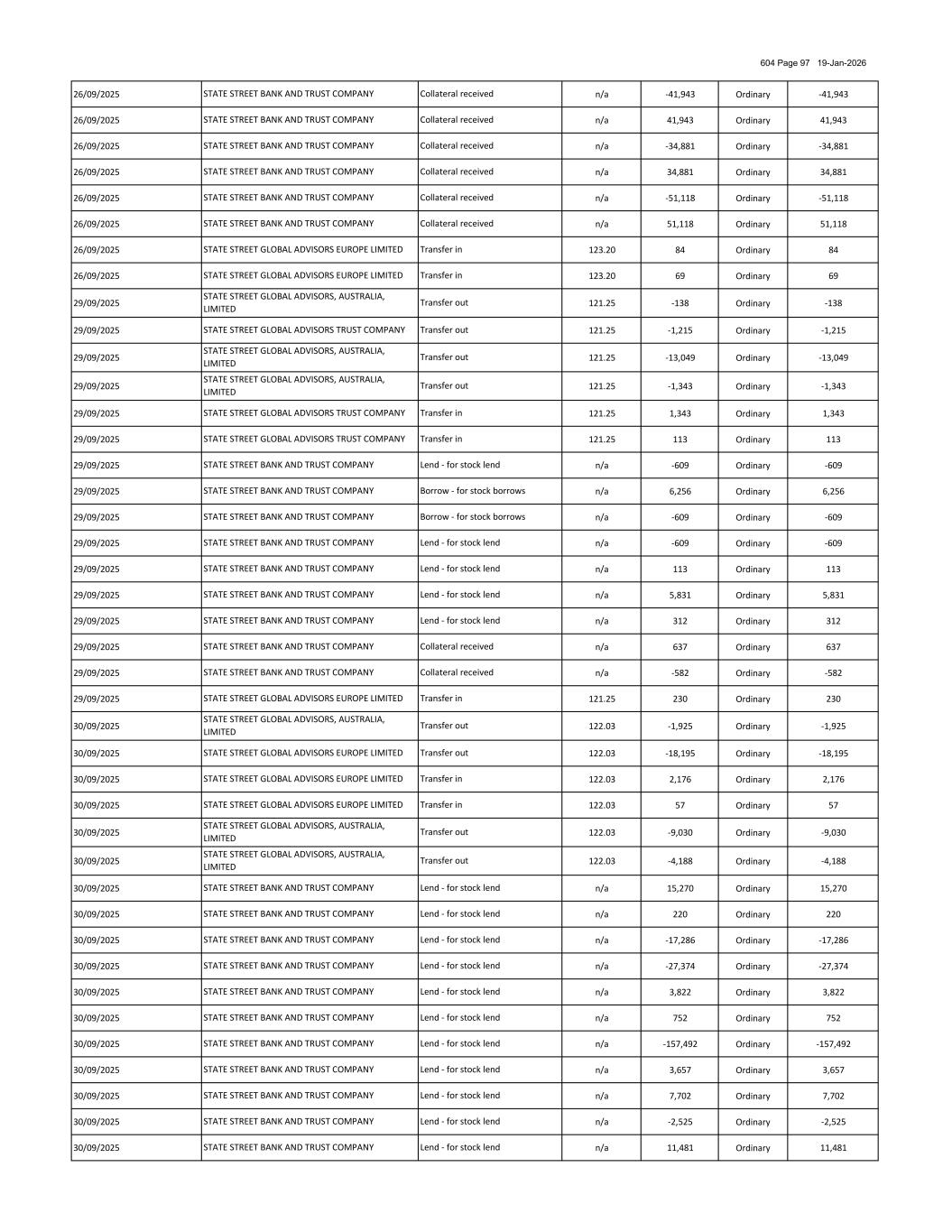 604 Page 93 19-Jan-2026 22/09/2025 n/a 109,257 Ordinary 109,257 22/09/2025 n/a 61 Ordinary 61 22/09/2025 n/a 467 Ordinary 467 22/09/2025 n/a -28,102 Ordinary -28,102 22/09/2025 n/a 2,217 Ordinary 2,217 22/09/2025 n/a -91,818 Ordinary -91,818 22/09/2025 n/a 1,023 Ordinary 1,023 22/09/2025 n/a -14,131 Ordinary -14,131 22/09/2025 n/a -1,490 Ordinary -1,490 22/09/2025 n/a 2,512 Ordinary 2,512 22/09/2025 n/a -681 Ordinary -681 22/09/2025 n/a -9,649 Ordinary -9,649 22/09/2025 n/a -3,657 Ordinary -3,657 22/09/2025 n/a -3,754 Ordinary -3,754 22/09/2025 n/a -2,711 Ordinary -2,711 22/09/2025 n/a -70,039 Ordinary -70,039 22/09/2025 n/a -82,516 Ordinary -82,516 22/09/2025 n/a -3,822 Ordinary -3,822 22/09/2025 n/a 80,533 Ordinary 80,533 22/09/2025 n/a -28,102 Ordinary -28,102 22/09/2025 n/a 25,712 Ordinary 25,712 22/09/2025 n/a -1 Ordinary -1 22/09/2025 116.92 2,063 Ordinary 2,063 22/09/2025 116.92 100 Ordinary 100 22/09/2025 n/a -2,391 Ordinary -2,391 22/09/2025 n/a 23 Ordinary 23 22/09/2025 n/a -70 Ordinary -70 22/09/2025 116.92 585 Ordinary 585 22/09/2025 116.92 468 Ordinary 468 23/09/2025 118.28 -746 Ordinary -746 23/09/2025 n/a 199,680 Ordinary 199,680 23/09/2025 n/a 4,069 Ordinary 4,069 23/09/2025 n/a -6,951 Ordinary -6,951 23/09/2025 n/a 6,951 Ordinary 6,951 23/09/2025 n/a -29,467 Ordinary -29,467 23/09/2025 n/a -2,188 Ordinary -2,188 23/09/2025 n/a 2,188 Ordinary 2,188 23/09/2025 n/a -25,712 Ordinary -25,712 23/09/2025 n/a 25,712 Ordinary 25,712 23/09/2025 118.00 4,254 Ordinary 4,254 23/09/2025 118.28 -16,599 Ordinary -16,599 STATE STREET BANK AND TRUST COMPANY STATE STREET BANK AND TRUST COMPANY Lend - for stock lend STATE STREET BANK AND TRUST COMPANY Lend - for stock lend Borrow - for stock borrows Lend - for stock lend Collateral received Lend - for stock lend STATE STREET BANK AND TRUST COMPANY Lend - for stock lend Lend - for stock lend Transfer in STATE STREET BANK AND TRUST COMPANY Lend - for stock lend Transfer in STATE STREET BANK AND TRUST COMPANY STATE STREET BANK AND TRUST COMPANY SSGA FUNDS MANAGEMENT, INC. Lend - for stock lend STATE STREET BANK AND TRUST COMPANY Lend - for stock lend Lend - for stock lend STATE STREET BANK AND TRUST COMPANY STATE STREET BANK AND TRUST COMPANY STATE STREET BANK AND TRUST COMPANY STATE STREET BANK AND TRUST COMPANY STATE STREET GLOBAL ADVISORS EUROPE LIMITED Borrow - for stock borrows STATE STREET BANK AND TRUST COMPANY STATE STREET BANK AND TRUST COMPANY Collateral received Borrow - for stock borrows Borrow - for stock borrows Collateral received STATE STREET BANK AND TRUST COMPANY Lend - for stock lend STATE STREET BANK AND TRUST COMPANY Lend - for stock lend Transfer in Borrow - for stock borrows STATE STREET BANK AND TRUST COMPANY STATE STREET BANK AND TRUST COMPANY Lend - for stock lend STATE STREET BANK AND TRUST COMPANY Lend - for stock lend STATE STREET BANK AND TRUST COMPANY Lend - for stock lend Lend - for stock lend STATE STREET BANK AND TRUST COMPANY STATE STREET BANK AND TRUST COMPANY STATE STREET BANK AND TRUST COMPANY STATE STREET BANK AND TRUST COMPANY STATE STREET GLOBAL ADVISORS EUROPE LIMITED Lend - for stock lend STATE STREET BANK AND TRUST COMPANY Lend - for stock lend STATE STREET BANK AND TRUST COMPANY STATE STREET BANK AND TRUST COMPANY Transfer in Transfer in STATE STREET GLOBAL ADVISORS, AUSTRALIA, LIMITED Lend - for stock lend Borrow - for stock borrows Lend - for stock lend STATE STREET GLOBAL ADVISORS TRUST COMPANY Collateral received Transfer out Transfer out STATE STREET BANK AND TRUST COMPANY STATE STREET BANK AND TRUST COMPANY STATE STREET GLOBAL ADVISORS EUROPE LIMITED Lend - for stock lend Lend - for stock lend Borrow - for stock borrows STATE STREET BANK AND TRUST COMPANY Lend - for stock lend STATE STREET BANK AND TRUST COMPANY STATE STREET BANK AND TRUST COMPANY STATE STREET BANK AND TRUST COMPANY STATE STREET GLOBAL ADVISORS TRUST COMPANY STATE STREET BANK AND TRUST COMPANY