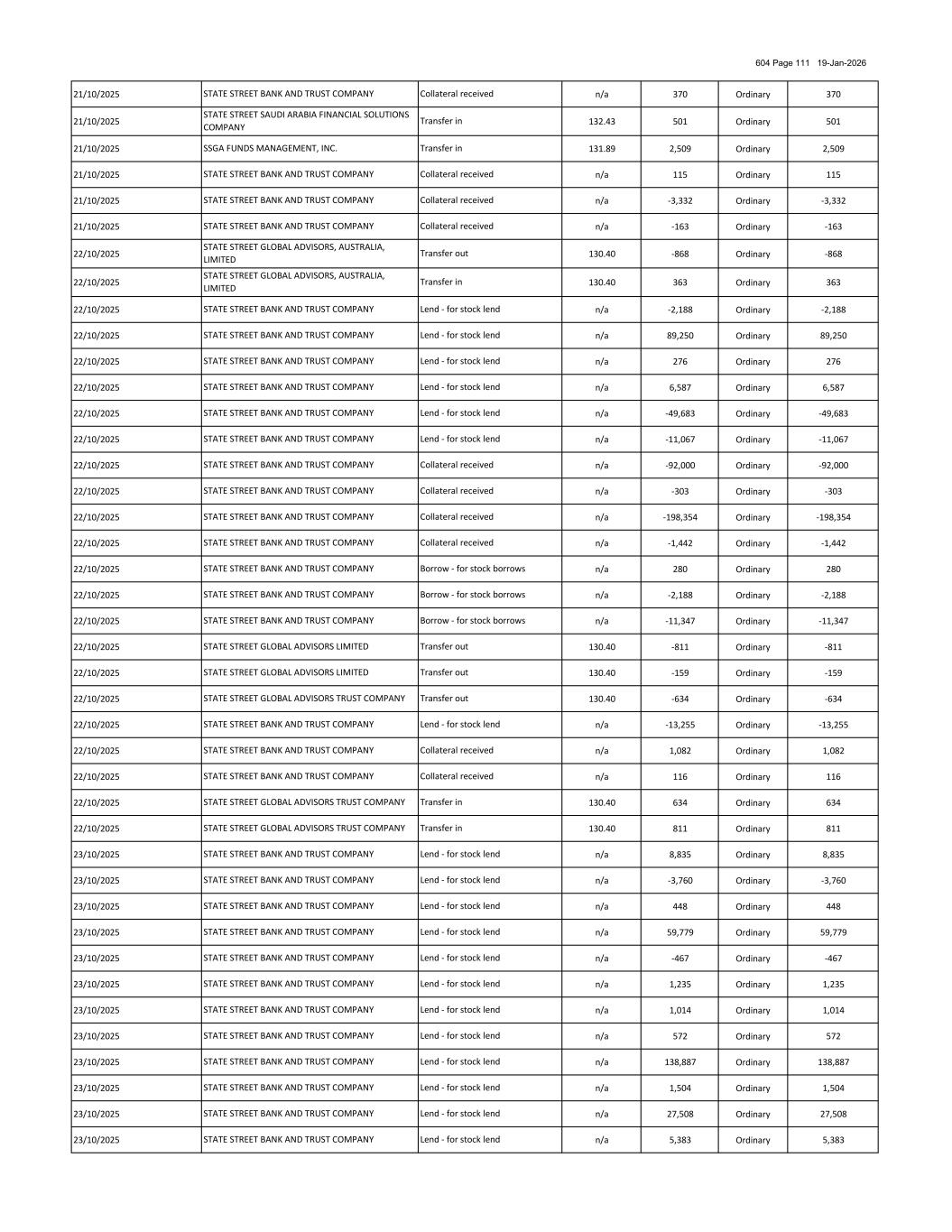 604 Page 111 19-Jan-2026 21/10/2025 n/a 370 Ordinary 370 21/10/2025 132.43 501 Ordinary 501 21/10/2025 131.89 2,509 Ordinary 2,509 21/10/2025 n/a 115 Ordinary 115 21/10/2025 n/a -3,332 Ordinary -3,332 21/10/2025 n/a -163 Ordinary -163 22/10/2025 130.40 -868 Ordinary -868 22/10/2025 130.40 363 Ordinary 363 22/10/2025 n/a -2,188 Ordinary -2,188 22/10/2025 n/a 89,250 Ordinary 89,250 22/10/2025 n/a 276 Ordinary 276 22/10/2025 n/a 6,587 Ordinary 6,587 22/10/2025 n/a -49,683 Ordinary -49,683 22/10/2025 n/a -11,067 Ordinary -11,067 22/10/2025 n/a -92,000 Ordinary -92,000 22/10/2025 n/a -303 Ordinary -303 22/10/2025 n/a -198,354 Ordinary -198,354 22/10/2025 n/a -1,442 Ordinary -1,442 22/10/2025 n/a 280 Ordinary 280 22/10/2025 n/a -2,188 Ordinary -2,188 22/10/2025 n/a -11,347 Ordinary -11,347 22/10/2025 130.40 -811 Ordinary -811 22/10/2025 130.40 -159 Ordinary -159 22/10/2025 130.40 -634 Ordinary -634 22/10/2025 n/a -13,255 Ordinary -13,255 22/10/2025 n/a 1,082 Ordinary 1,082 22/10/2025 n/a 116 Ordinary 116 22/10/2025 130.40 634 Ordinary 634 22/10/2025 130.40 811 Ordinary 811 23/10/2025 n/a 8,835 Ordinary 8,835 23/10/2025 n/a -3,760 Ordinary -3,760 23/10/2025 n/a 448 Ordinary 448 23/10/2025 n/a 59,779 Ordinary 59,779 23/10/2025 n/a -467 Ordinary -467 23/10/2025 n/a 1,235 Ordinary 1,235 23/10/2025 n/a 1,014 Ordinary 1,014 23/10/2025 n/a 572 Ordinary 572 23/10/2025 n/a 138,887 Ordinary 138,887 23/10/2025 n/a 1,504 Ordinary 1,504 23/10/2025 n/a 27,508 Ordinary 27,508 23/10/2025 n/a 5,383 Ordinary 5,383Lend - for stock lend Borrow - for stock borrows STATE STREET BANK AND TRUST COMPANY Transfer in Lend - for stock lend Collateral received STATE STREET BANK AND TRUST COMPANY STATE STREET BANK AND TRUST COMPANY Lend - for stock lend Transfer in STATE STREET BANK AND TRUST COMPANY STATE STREET BANK AND TRUST COMPANY Transfer out STATE STREET GLOBAL ADVISORS TRUST COMPANY Lend - for stock lend Lend - for stock lend Borrow - for stock borrows STATE STREET GLOBAL ADVISORS, AUSTRALIA, LIMITED STATE STREET BANK AND TRUST COMPANY STATE STREET BANK AND TRUST COMPANY STATE STREET GLOBAL ADVISORS, AUSTRALIA, LIMITED STATE STREET GLOBAL ADVISORS TRUST COMPANY STATE STREET BANK AND TRUST COMPANY STATE STREET BANK AND TRUST COMPANY STATE STREET BANK AND TRUST COMPANY Lend - for stock lend Lend - for stock lend STATE STREET BANK AND TRUST COMPANY Lend - for stock lend Borrow - for stock borrows Lend - for stock lend STATE STREET BANK AND TRUST COMPANY Collateral received STATE STREET GLOBAL ADVISORS LIMITED Transfer out Lend - for stock lend Lend - for stock lend STATE STREET BANK AND TRUST COMPANY Transfer out STATE STREET BANK AND TRUST COMPANY STATE STREET BANK AND TRUST COMPANY STATE STREET BANK AND TRUST COMPANY Transfer in STATE STREET GLOBAL ADVISORS LIMITED Lend - for stock lend STATE STREET BANK AND TRUST COMPANY STATE STREET BANK AND TRUST COMPANY STATE STREET BANK AND TRUST COMPANY Lend - for stock lend Transfer out STATE STREET SAUDI ARABIA FINANCIAL SOLUTIONS COMPANY STATE STREET BANK AND TRUST COMPANY Collateral received Transfer in Lend - for stock lend Lend - for stock lend Lend - for stock lend STATE STREET GLOBAL ADVISORS TRUST COMPANY Lend - for stock lend STATE STREET BANK AND TRUST COMPANY Collateral received Collateral received Lend - for stock lend STATE STREET BANK AND TRUST COMPANY STATE STREET BANK AND TRUST COMPANY Collateral received STATE STREET BANK AND TRUST COMPANY STATE STREET BANK AND TRUST COMPANY STATE STREET BANK AND TRUST COMPANY Collateral received Collateral received STATE STREET BANK AND TRUST COMPANY STATE STREET BANK AND TRUST COMPANY SSGA FUNDS MANAGEMENT, INC. STATE STREET BANK AND TRUST COMPANY Collateral received STATE STREET BANK AND TRUST COMPANY STATE STREET BANK AND TRUST COMPANY STATE STREET BANK AND TRUST COMPANY Collateral received Lend - for stock lend Transfer in