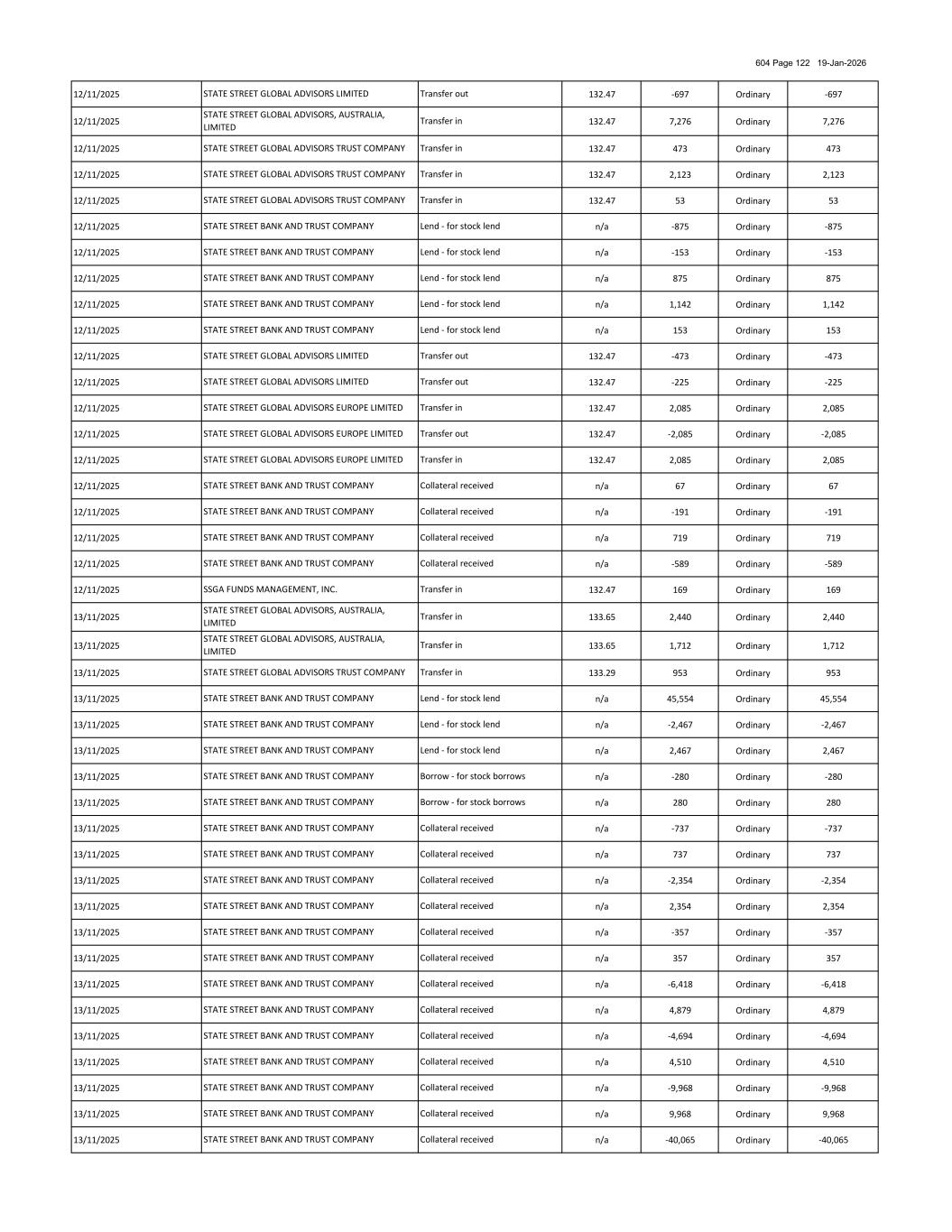 604 Page 122 19-Jan-2026 12/11/2025 132.47 -697 Ordinary -697 12/11/2025 132.47 7,276 Ordinary 7,276 12/11/2025 132.47 473 Ordinary 473 12/11/2025 132.47 2,123 Ordinary 2,123 12/11/2025 132.47 53 Ordinary 53 12/11/2025 n/a -875 Ordinary -875 12/11/2025 n/a -153 Ordinary -153 12/11/2025 n/a 875 Ordinary 875 12/11/2025 n/a 1,142 Ordinary 1,142 12/11/2025 n/a 153 Ordinary 153 12/11/2025 132.47 -473 Ordinary -473 12/11/2025 132.47 -225 Ordinary -225 12/11/2025 132.47 2,085 Ordinary 2,085 12/11/2025 132.47 -2,085 Ordinary -2,085 12/11/2025 132.47 2,085 Ordinary 2,085 12/11/2025 n/a 67 Ordinary 67 12/11/2025 n/a -191 Ordinary -191 12/11/2025 n/a 719 Ordinary 719 12/11/2025 n/a -589 Ordinary -589 12/11/2025 132.47 169 Ordinary 169 13/11/2025 133.65 2,440 Ordinary 2,440 13/11/2025 133.65 1,712 Ordinary 1,712 13/11/2025 133.29 953 Ordinary 953 13/11/2025 n/a 45,554 Ordinary 45,554 13/11/2025 n/a -2,467 Ordinary -2,467 13/11/2025 n/a 2,467 Ordinary 2,467 13/11/2025 n/a -280 Ordinary -280 13/11/2025 n/a 280 Ordinary 280 13/11/2025 n/a -737 Ordinary -737 13/11/2025 n/a 737 Ordinary 737 13/11/2025 n/a -2,354 Ordinary -2,354 13/11/2025 n/a 2,354 Ordinary 2,354 13/11/2025 n/a -357 Ordinary -357 13/11/2025 n/a 357 Ordinary 357 13/11/2025 n/a -6,418 Ordinary -6,418 13/11/2025 n/a 4,879 Ordinary 4,879 13/11/2025 n/a -4,694 Ordinary -4,694 13/11/2025 n/a 4,510 Ordinary 4,510 13/11/2025 n/a -9,968 Ordinary -9,968 13/11/2025 n/a 9,968 Ordinary 9,968 13/11/2025 n/a -40,065 Ordinary -40,065Collateral received Collateral received Collateral received Lend - for stock lend STATE STREET BANK AND TRUST COMPANY Collateral received Lend - for stock lend STATE STREET BANK AND TRUST COMPANY Collateral received STATE STREET BANK AND TRUST COMPANY STATE STREET BANK AND TRUST COMPANY STATE STREET BANK AND TRUST COMPANY Transfer in Collateral received STATE STREET BANK AND TRUST COMPANY Lend - for stock lend STATE STREET BANK AND TRUST COMPANY STATE STREET BANK AND TRUST COMPANY STATE STREET BANK AND TRUST COMPANY STATE STREET BANK AND TRUST COMPANY STATE STREET BANK AND TRUST COMPANY STATE STREET BANK AND TRUST COMPANY STATE STREET BANK AND TRUST COMPANY SSGA FUNDS MANAGEMENT, INC. Collateral received Collateral received Transfer in STATE STREET BANK AND TRUST COMPANY Lend - for stock lend Collateral received Transfer out Transfer in STATE STREET GLOBAL ADVISORS, AUSTRALIA, LIMITED STATE STREET BANK AND TRUST COMPANY Transfer out STATE STREET BANK AND TRUST COMPANY Transfer out Transfer in STATE STREET GLOBAL ADVISORS, AUSTRALIA, LIMITED STATE STREET BANK AND TRUST COMPANY STATE STREET BANK AND TRUST COMPANY Transfer in STATE STREET GLOBAL ADVISORS TRUST COMPANY Transfer in STATE STREET GLOBAL ADVISORS LIMITED STATE STREET GLOBAL ADVISORS LIMITED STATE STREET GLOBAL ADVISORS LIMITED Lend - for stock lend Collateral received STATE STREET GLOBAL ADVISORS, AUSTRALIA, LIMITED Collateral received Transfer in Lend - for stock lend Collateral received Lend - for stock lend Transfer in STATE STREET BANK AND TRUST COMPANY STATE STREET BANK AND TRUST COMPANY Transfer out STATE STREET GLOBAL ADVISORS EUROPE LIMITED Collateral received Collateral received Borrow - for stock borrows STATE STREET BANK AND TRUST COMPANY Transfer in STATE STREET BANK AND TRUST COMPANY STATE STREET GLOBAL ADVISORS EUROPE LIMITED Transfer in STATE STREET BANK AND TRUST COMPANY STATE STREET GLOBAL ADVISORS EUROPE LIMITED STATE STREET BANK AND TRUST COMPANY STATE STREET GLOBAL ADVISORS TRUST COMPANY STATE STREET BANK AND TRUST COMPANY Lend - for stock lend STATE STREET BANK AND TRUST COMPANY STATE STREET GLOBAL ADVISORS TRUST COMPANY Collateral received STATE STREET GLOBAL ADVISORS TRUST COMPANY Borrow - for stock borrows Collateral received STATE STREET BANK AND TRUST COMPANY Collateral received