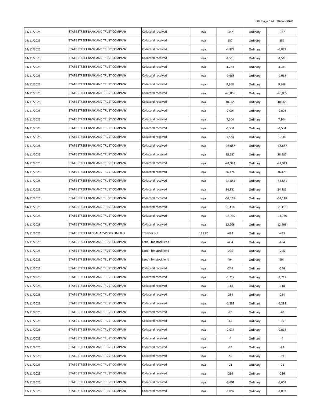 604 Page 124 19-Jan-2026 14/11/2025 n/a -357 Ordinary -357 14/11/2025 n/a 357 Ordinary 357 14/11/2025 n/a -4,879 Ordinary -4,879 14/11/2025 n/a -4,510 Ordinary -4,510 14/11/2025 n/a 4,283 Ordinary 4,283 14/11/2025 n/a -9,968 Ordinary -9,968 14/11/2025 n/a 9,968 Ordinary 9,968 14/11/2025 n/a -40,065 Ordinary -40,065 14/11/2025 n/a 40,065 Ordinary 40,065 14/11/2025 n/a -7,004 Ordinary -7,004 14/11/2025 n/a 7,104 Ordinary 7,104 14/11/2025 n/a -1,534 Ordinary -1,534 14/11/2025 n/a 1,534 Ordinary 1,534 14/11/2025 n/a -38,687 Ordinary -38,687 14/11/2025 n/a 38,687 Ordinary 38,687 14/11/2025 n/a -41,943 Ordinary -41,943 14/11/2025 n/a 36,426 Ordinary 36,426 14/11/2025 n/a -34,881 Ordinary -34,881 14/11/2025 n/a 34,881 Ordinary 34,881 14/11/2025 n/a -51,118 Ordinary -51,118 14/11/2025 n/a 51,118 Ordinary 51,118 14/11/2025 n/a -13,730 Ordinary -13,730 14/11/2025 n/a 12,206 Ordinary 12,206 17/11/2025 131.80 -483 Ordinary -483 17/11/2025 n/a -494 Ordinary -494 17/11/2025 n/a -206 Ordinary -206 17/11/2025 n/a 494 Ordinary 494 17/11/2025 n/a -246 Ordinary -246 17/11/2025 n/a -1,717 Ordinary -1,717 17/11/2025 n/a -118 Ordinary -118 17/11/2025 n/a -254 Ordinary -254 17/11/2025 n/a -1,283 Ordinary -1,283 17/11/2025 n/a -20 Ordinary -20 17/11/2025 n/a -65 Ordinary -65 17/11/2025 n/a -2,014 Ordinary -2,014 17/11/2025 n/a -4 Ordinary -4 17/11/2025 n/a -23 Ordinary -23 17/11/2025 n/a -59 Ordinary -59 17/11/2025 n/a -21 Ordinary -21 17/11/2025 n/a -216 Ordinary -216 17/11/2025 n/a -9,601 Ordinary -9,601 17/11/2025 n/a -1,092 Ordinary -1,092 STATE STREET BANK AND TRUST COMPANY Collateral received Collateral received Lend - for stock lend Collateral received Transfer out Collateral received Collateral received STATE STREET BANK AND TRUST COMPANY STATE STREET BANK AND TRUST COMPANY STATE STREET BANK AND TRUST COMPANY Lend - for stock lend Collateral received Collateral received STATE STREET BANK AND TRUST COMPANY STATE STREET BANK AND TRUST COMPANY Collateral received STATE STREET BANK AND TRUST COMPANY STATE STREET GLOBAL ADVISORS LIMITED STATE STREET BANK AND TRUST COMPANY Collateral received STATE STREET BANK AND TRUST COMPANY STATE STREET BANK AND TRUST COMPANY Collateral received STATE STREET BANK AND TRUST COMPANY STATE STREET BANK AND TRUST COMPANY STATE STREET BANK AND TRUST COMPANY Collateral received STATE STREET BANK AND TRUST COMPANY Collateral received Lend - for stock lend STATE STREET BANK AND TRUST COMPANY Collateral received Collateral received Collateral received Collateral received Collateral received STATE STREET BANK AND TRUST COMPANY Collateral received STATE STREET BANK AND TRUST COMPANY Collateral received Collateral received STATE STREET BANK AND TRUST COMPANY STATE STREET BANK AND TRUST COMPANY STATE STREET BANK AND TRUST COMPANY STATE STREET BANK AND TRUST COMPANY Collateral received STATE STREET BANK AND TRUST COMPANY STATE STREET BANK AND TRUST COMPANY STATE STREET BANK AND TRUST COMPANY Collateral received STATE STREET BANK AND TRUST COMPANY STATE STREET BANK AND TRUST COMPANY STATE STREET BANK AND TRUST COMPANY Collateral received Collateral received STATE STREET BANK AND TRUST COMPANY STATE STREET BANK AND TRUST COMPANY STATE STREET BANK AND TRUST COMPANY Collateral received Collateral received Collateral received Collateral received Collateral received STATE STREET BANK AND TRUST COMPANY Collateral received Collateral received STATE STREET BANK AND TRUST COMPANY STATE STREET BANK AND TRUST COMPANY Collateral received STATE STREET BANK AND TRUST COMPANY Collateral received Collateral received STATE STREET BANK AND TRUST COMPANY STATE STREET BANK AND TRUST COMPANY STATE STREET BANK AND TRUST COMPANY Collateral received STATE STREET BANK AND TRUST COMPANY Collateral received STATE STREET BANK AND TRUST COMPANY STATE STREET BANK AND TRUST COMPANY STATE STREET BANK AND TRUST COMPANY Collateral received Collateral received