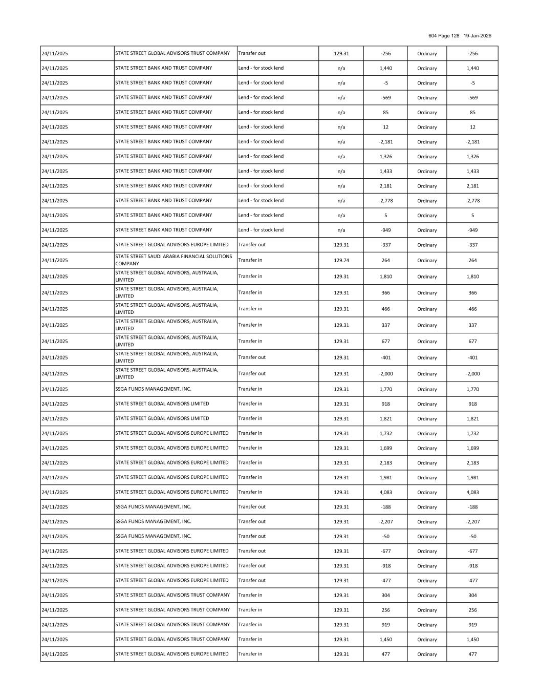 604 Page 128 19-Jan-2026 24/11/2025 129.31 -256 Ordinary -256 24/11/2025 n/a 1,440 Ordinary 1,440 24/11/2025 n/a -5 Ordinary -5 24/11/2025 n/a -569 Ordinary -569 24/11/2025 n/a 85 Ordinary 85 24/11/2025 n/a 12 Ordinary 12 24/11/2025 n/a -2,181 Ordinary -2,181 24/11/2025 n/a 1,326 Ordinary 1,326 24/11/2025 n/a 1,433 Ordinary 1,433 24/11/2025 n/a 2,181 Ordinary 2,181 24/11/2025 n/a -2,778 Ordinary -2,778 24/11/2025 n/a 5 Ordinary 5 24/11/2025 n/a -949 Ordinary -949 24/11/2025 129.31 -337 Ordinary -337 24/11/2025 129.74 264 Ordinary 264 24/11/2025 129.31 1,810 Ordinary 1,810 24/11/2025 129.31 366 Ordinary 366 24/11/2025 129.31 466 Ordinary 466 24/11/2025 129.31 337 Ordinary 337 24/11/2025 129.31 677 Ordinary 677 24/11/2025 129.31 -401 Ordinary -401 24/11/2025 129.31 -2,000 Ordinary -2,000 24/11/2025 129.31 1,770 Ordinary 1,770 24/11/2025 129.31 918 Ordinary 918 24/11/2025 129.31 1,821 Ordinary 1,821 24/11/2025 129.31 1,732 Ordinary 1,732 24/11/2025 129.31 1,699 Ordinary 1,699 24/11/2025 129.31 2,183 Ordinary 2,183 24/11/2025 129.31 1,981 Ordinary 1,981 24/11/2025 129.31 4,083 Ordinary 4,083 24/11/2025 129.31 -188 Ordinary -188 24/11/2025 129.31 -2,207 Ordinary -2,207 24/11/2025 129.31 -50 Ordinary -50 24/11/2025 129.31 -677 Ordinary -677 24/11/2025 129.31 -918 Ordinary -918 24/11/2025 129.31 -477 Ordinary -477 24/11/2025 129.31 304 Ordinary 304 24/11/2025 129.31 256 Ordinary 256 24/11/2025 129.31 919 Ordinary 919 24/11/2025 129.31 1,450 Ordinary 1,450 24/11/2025 129.31 477 Ordinary 477 STATE STREET BANK AND TRUST COMPANY STATE STREET BANK AND TRUST COMPANY Transfer in Transfer in Transfer out Transfer out Transfer in Lend - for stock lend STATE STREET GLOBAL ADVISORS LIMITED STATE STREET GLOBAL ADVISORS EUROPE LIMITED Transfer in Transfer in STATE STREET GLOBAL ADVISORS TRUST COMPANY Transfer in STATE STREET GLOBAL ADVISORS EUROPE LIMITED Lend - for stock lend Transfer in STATE STREET GLOBAL ADVISORS LIMITED Lend - for stock lend STATE STREET GLOBAL ADVISORS EUROPE LIMITED STATE STREET GLOBAL ADVISORS EUROPE LIMITED STATE STREET BANK AND TRUST COMPANY STATE STREET GLOBAL ADVISORS TRUST COMPANY Lend - for stock lend Transfer in STATE STREET GLOBAL ADVISORS, AUSTRALIA, LIMITED STATE STREET GLOBAL ADVISORS EUROPE LIMITED STATE STREET BANK AND TRUST COMPANY STATE STREET BANK AND TRUST COMPANY STATE STREET SAUDI ARABIA FINANCIAL SOLUTIONS COMPANY Transfer in Transfer in STATE STREET BANK AND TRUST COMPANY Transfer in Transfer in Transfer in Transfer in Transfer in STATE STREET GLOBAL ADVISORS TRUST COMPANY Transfer in Lend - for stock lend STATE STREET GLOBAL ADVISORS, AUSTRALIA, LIMITED STATE STREET GLOBAL ADVISORS EUROPE LIMITED Transfer out STATE STREET GLOBAL ADVISORS EUROPE LIMITED Transfer in STATE STREET GLOBAL ADVISORS EUROPE LIMITED Lend - for stock lend STATE STREET BANK AND TRUST COMPANY STATE STREET GLOBAL ADVISORS, AUSTRALIA, LIMITED STATE STREET GLOBAL ADVISORS EUROPE LIMITED Lend - for stock lend STATE STREET GLOBAL ADVISORS TRUST COMPANY STATE STREET GLOBAL ADVISORS, AUSTRALIA, LIMITED STATE STREET BANK AND TRUST COMPANY STATE STREET GLOBAL ADVISORS, AUSTRALIA, LIMITED SSGA FUNDS MANAGEMENT, INC. STATE STREET BANK AND TRUST COMPANY Transfer out Lend - for stock lend Transfer out Transfer in Transfer out SSGA FUNDS MANAGEMENT, INC. Lend - for stock lend Transfer out Transfer out Lend - for stock lend STATE STREET GLOBAL ADVISORS, AUSTRALIA, LIMITED SSGA FUNDS MANAGEMENT, INC. STATE STREET BANK AND TRUST COMPANY Transfer in STATE STREET GLOBAL ADVISORS EUROPE LIMITED Lend - for stock lend Lend - for stock lend STATE STREET BANK AND TRUST COMPANY SSGA FUNDS MANAGEMENT, INC. STATE STREET GLOBAL ADVISORS TRUST COMPANY Transfer out STATE STREET GLOBAL ADVISORS, AUSTRALIA, LIMITED STATE STREET BANK AND TRUST COMPANY Transfer out