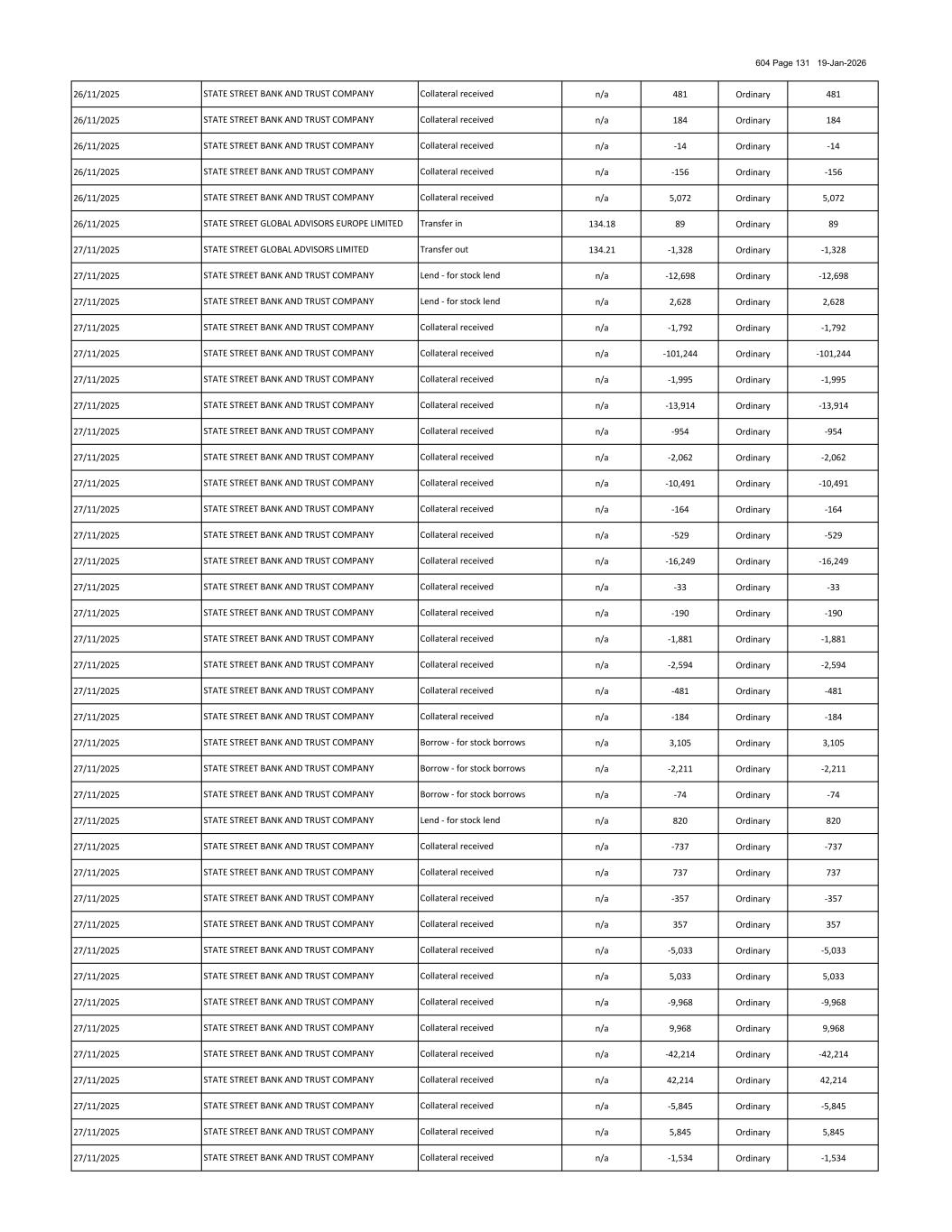 604 Page 131 19-Jan-2026 26/11/2025 n/a 481 Ordinary 481 26/11/2025 n/a 184 Ordinary 184 26/11/2025 n/a -14 Ordinary -14 26/11/2025 n/a -156 Ordinary -156 26/11/2025 n/a 5,072 Ordinary 5,072 26/11/2025 134.18 89 Ordinary 89 27/11/2025 134.21 -1,328 Ordinary -1,328 27/11/2025 n/a -12,698 Ordinary -12,698 27/11/2025 n/a 2,628 Ordinary 2,628 27/11/2025 n/a -1,792 Ordinary -1,792 27/11/2025 n/a -101,244 Ordinary -101,244 27/11/2025 n/a -1,995 Ordinary -1,995 27/11/2025 n/a -13,914 Ordinary -13,914 27/11/2025 n/a -954 Ordinary -954 27/11/2025 n/a -2,062 Ordinary -2,062 27/11/2025 n/a -10,491 Ordinary -10,491 27/11/2025 n/a -164 Ordinary -164 27/11/2025 n/a -529 Ordinary -529 27/11/2025 n/a -16,249 Ordinary -16,249 27/11/2025 n/a -33 Ordinary -33 27/11/2025 n/a -190 Ordinary -190 27/11/2025 n/a -1,881 Ordinary -1,881 27/11/2025 n/a -2,594 Ordinary -2,594 27/11/2025 n/a -481 Ordinary -481 27/11/2025 n/a -184 Ordinary -184 27/11/2025 n/a 3,105 Ordinary 3,105 27/11/2025 n/a -2,211 Ordinary -2,211 27/11/2025 n/a -74 Ordinary -74 27/11/2025 n/a 820 Ordinary 820 27/11/2025 n/a -737 Ordinary -737 27/11/2025 n/a 737 Ordinary 737 27/11/2025 n/a -357 Ordinary -357 27/11/2025 n/a 357 Ordinary 357 27/11/2025 n/a -5,033 Ordinary -5,033 27/11/2025 n/a 5,033 Ordinary 5,033 27/11/2025 n/a -9,968 Ordinary -9,968 27/11/2025 n/a 9,968 Ordinary 9,968 27/11/2025 n/a -42,214 Ordinary -42,214 27/11/2025 n/a 42,214 Ordinary 42,214 27/11/2025 n/a -5,845 Ordinary -5,845 27/11/2025 n/a 5,845 Ordinary 5,845 27/11/2025 n/a -1,534 Ordinary -1,534 Collateral received Collateral received Collateral received STATE STREET BANK AND TRUST COMPANY Collateral received STATE STREET BANK AND TRUST COMPANY Collateral received Collateral received STATE STREET BANK AND TRUST COMPANY STATE STREET BANK AND TRUST COMPANY Collateral received STATE STREET BANK AND TRUST COMPANY STATE STREET BANK AND TRUST COMPANY Collateral received STATE STREET BANK AND TRUST COMPANY STATE STREET BANK AND TRUST COMPANY Collateral received STATE STREET BANK AND TRUST COMPANY STATE STREET BANK AND TRUST COMPANY STATE STREET BANK AND TRUST COMPANY STATE STREET BANK AND TRUST COMPANY Collateral received Borrow - for stock borrows STATE STREET BANK AND TRUST COMPANY Collateral received Collateral received Borrow - for stock borrows Collateral received Borrow - for stock borrows Collateral received Collateral received Transfer out STATE STREET BANK AND TRUST COMPANY STATE STREET BANK AND TRUST COMPANY STATE STREET BANK AND TRUST COMPANY Collateral received Lend - for stock lend Collateral received STATE STREET BANK AND TRUST COMPANY STATE STREET BANK AND TRUST COMPANY STATE STREET BANK AND TRUST COMPANY STATE STREET BANK AND TRUST COMPANY STATE STREET BANK AND TRUST COMPANY Transfer in STATE STREET BANK AND TRUST COMPANY STATE STREET BANK AND TRUST COMPANY STATE STREET BANK AND TRUST COMPANY Lend - for stock lend STATE STREET BANK AND TRUST COMPANY STATE STREET GLOBAL ADVISORS LIMITED Collateral received STATE STREET GLOBAL ADVISORS EUROPE LIMITED Collateral received Collateral received Collateral received STATE STREET BANK AND TRUST COMPANY Collateral received Collateral received STATE STREET BANK AND TRUST COMPANY STATE STREET BANK AND TRUST COMPANY Collateral received Collateral received Collateral received Lend - for stock lend STATE STREET BANK AND TRUST COMPANY STATE STREET BANK AND TRUST COMPANY STATE STREET BANK AND TRUST COMPANY STATE STREET BANK AND TRUST COMPANY Collateral received Collateral received STATE STREET BANK AND TRUST COMPANY STATE STREET BANK AND TRUST COMPANY STATE STREET BANK AND TRUST COMPANY STATE STREET BANK AND TRUST COMPANY STATE STREET BANK AND TRUST COMPANY Collateral received STATE STREET BANK AND TRUST COMPANY STATE STREET BANK AND TRUST COMPANY Collateral received Collateral received Collateral received Collateral received Collateral received STATE STREET BANK AND TRUST COMPANY