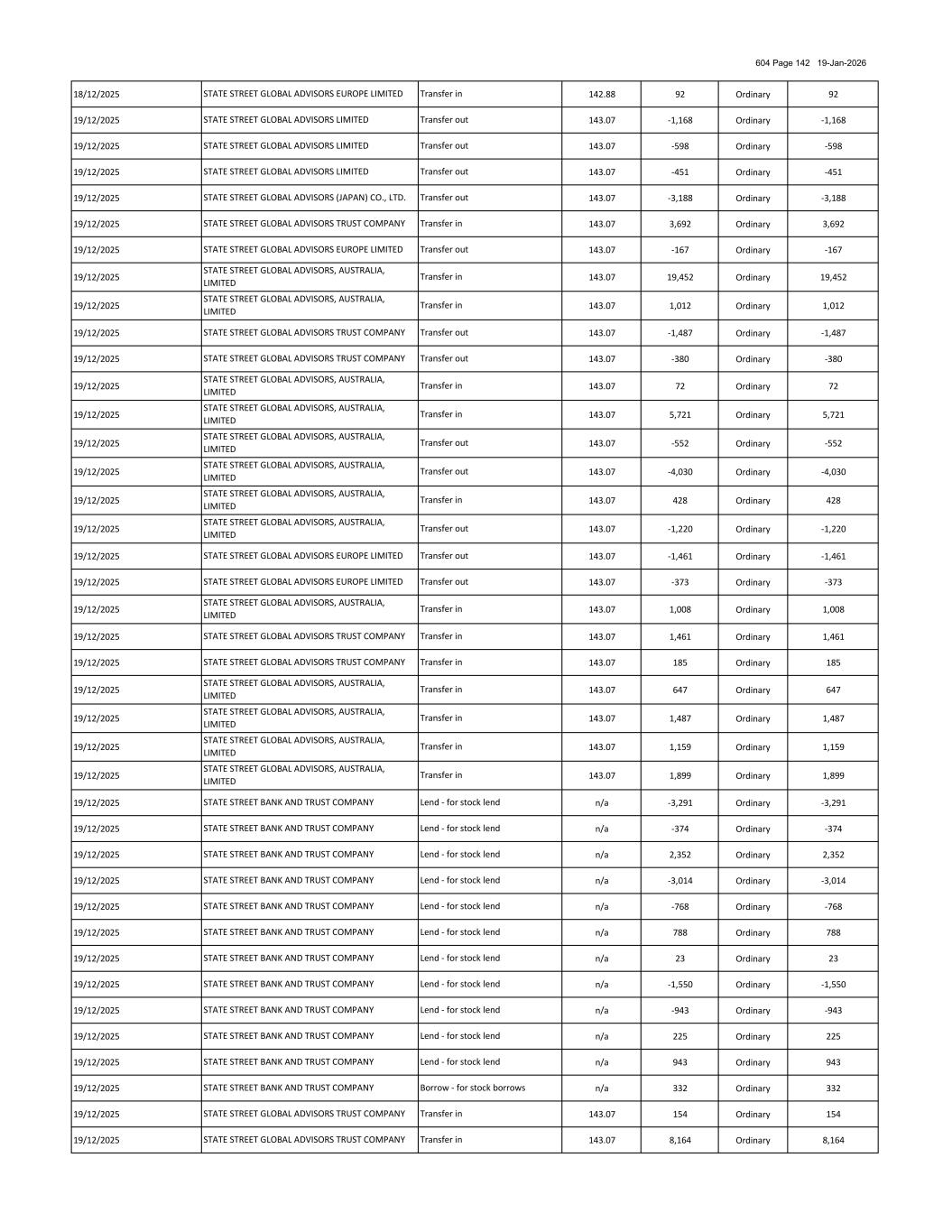 604 Page 142 19-Jan-2026 18/12/2025 142.88 92 Ordinary 92 19/12/2025 143.07 -1,168 Ordinary -1,168 19/12/2025 143.07 -598 Ordinary -598 19/12/2025 143.07 -451 Ordinary -451 19/12/2025 143.07 -3,188 Ordinary -3,188 19/12/2025 143.07 3,692 Ordinary 3,692 19/12/2025 143.07 -167 Ordinary -167 19/12/2025 143.07 19,452 Ordinary 19,452 19/12/2025 143.07 1,012 Ordinary 1,012 19/12/2025 143.07 -1,487 Ordinary -1,487 19/12/2025 143.07 -380 Ordinary -380 19/12/2025 143.07 72 Ordinary 72 19/12/2025 143.07 5,721 Ordinary 5,721 19/12/2025 143.07 -552 Ordinary -552 19/12/2025 143.07 -4,030 Ordinary -4,030 19/12/2025 143.07 428 Ordinary 428 19/12/2025 143.07 -1,220 Ordinary -1,220 19/12/2025 143.07 -1,461 Ordinary -1,461 19/12/2025 143.07 -373 Ordinary -373 19/12/2025 143.07 1,008 Ordinary 1,008 19/12/2025 143.07 1,461 Ordinary 1,461 19/12/2025 143.07 185 Ordinary 185 19/12/2025 143.07 647 Ordinary 647 19/12/2025 143.07 1,487 Ordinary 1,487 19/12/2025 143.07 1,159 Ordinary 1,159 19/12/2025 143.07 1,899 Ordinary 1,899 19/12/2025 n/a -3,291 Ordinary -3,291 19/12/2025 n/a -374 Ordinary -374 19/12/2025 n/a 2,352 Ordinary 2,352 19/12/2025 n/a -3,014 Ordinary -3,014 19/12/2025 n/a -768 Ordinary -768 19/12/2025 n/a 788 Ordinary 788 19/12/2025 n/a 23 Ordinary 23 19/12/2025 n/a -1,550 Ordinary -1,550 19/12/2025 n/a -943 Ordinary -943 19/12/2025 n/a 225 Ordinary 225 19/12/2025 n/a 943 Ordinary 943 19/12/2025 n/a 332 Ordinary 332 19/12/2025 143.07 154 Ordinary 154 19/12/2025 143.07 8,164 Ordinary 8,164 Lend - for stock lend Transfer in STATE STREET BANK AND TRUST COMPANY Transfer in Transfer out STATE STREET GLOBAL ADVISORS, AUSTRALIA, LIMITED Transfer in Transfer out STATE STREET BANK AND TRUST COMPANY STATE STREET GLOBAL ADVISORS TRUST COMPANY STATE STREET BANK AND TRUST COMPANY Transfer in STATE STREET GLOBAL ADVISORS TRUST COMPANY Transfer out STATE STREET GLOBAL ADVISORS, AUSTRALIA, LIMITED STATE STREET GLOBAL ADVISORS, AUSTRALIA, LIMITED STATE STREET GLOBAL ADVISORS LIMITED STATE STREET GLOBAL ADVISORS EUROPE LIMITED STATE STREET GLOBAL ADVISORS, AUSTRALIA, LIMITED Lend - for stock lend Transfer in STATE STREET GLOBAL ADVISORS LIMITED Borrow - for stock borrows Transfer in Lend - for stock lend Lend - for stock lend Transfer in Transfer out STATE STREET BANK AND TRUST COMPANY Transfer out STATE STREET GLOBAL ADVISORS, AUSTRALIA, LIMITED STATE STREET GLOBAL ADVISORS, AUSTRALIA, LIMITED Transfer in Lend - for stock lend Transfer out STATE STREET BANK AND TRUST COMPANY Transfer in STATE STREET BANK AND TRUST COMPANY STATE STREET GLOBAL ADVISORS, AUSTRALIA, LIMITED STATE STREET GLOBAL ADVISORS (JAPAN) CO., LTD. STATE STREET BANK AND TRUST COMPANY Transfer out STATE STREET GLOBAL ADVISORS, AUSTRALIA, LIMITED STATE STREET GLOBAL ADVISORS, AUSTRALIA, LIMITED STATE STREET GLOBAL ADVISORS LIMITED STATE STREET BANK AND TRUST COMPANY STATE STREET GLOBAL ADVISORS, AUSTRALIA, LIMITED STATE STREET GLOBAL ADVISORS TRUST COMPANY Transfer in Lend - for stock lend Transfer out STATE STREET GLOBAL ADVISORS TRUST COMPANY Transfer out Lend - for stock lend Transfer in Lend - for stock lend STATE STREET GLOBAL ADVISORS TRUST COMPANY STATE STREET BANK AND TRUST COMPANY Transfer in STATE STREET BANK AND TRUST COMPANY Transfer out Transfer in STATE STREET GLOBAL ADVISORS EUROPE LIMITED STATE STREET GLOBAL ADVISORS EUROPE LIMITED Transfer in Transfer out STATE STREET BANK AND TRUST COMPANY STATE STREET GLOBAL ADVISORS, AUSTRALIA, LIMITED STATE STREET GLOBAL ADVISORS, AUSTRALIA, LIMITED STATE STREET GLOBAL ADVISORS EUROPE LIMITED STATE STREET GLOBAL ADVISORS, AUSTRALIA, LIMITED Lend - for stock lend STATE STREET GLOBAL ADVISORS TRUST COMPANY Transfer in Lend - for stock lend Lend - for stock lend Transfer in Transfer out STATE STREET BANK AND TRUST COMPANY STATE STREET GLOBAL ADVISORS TRUST COMPANY