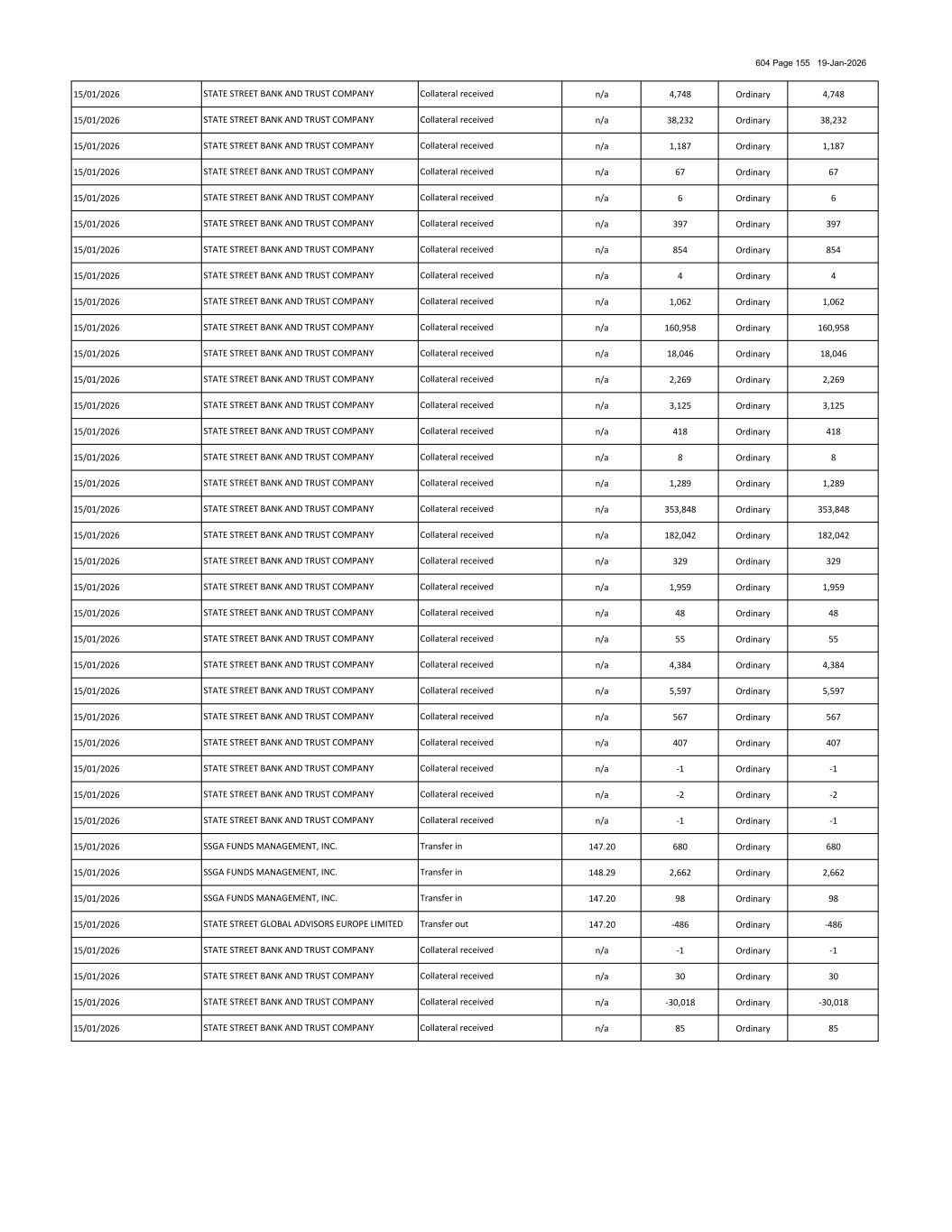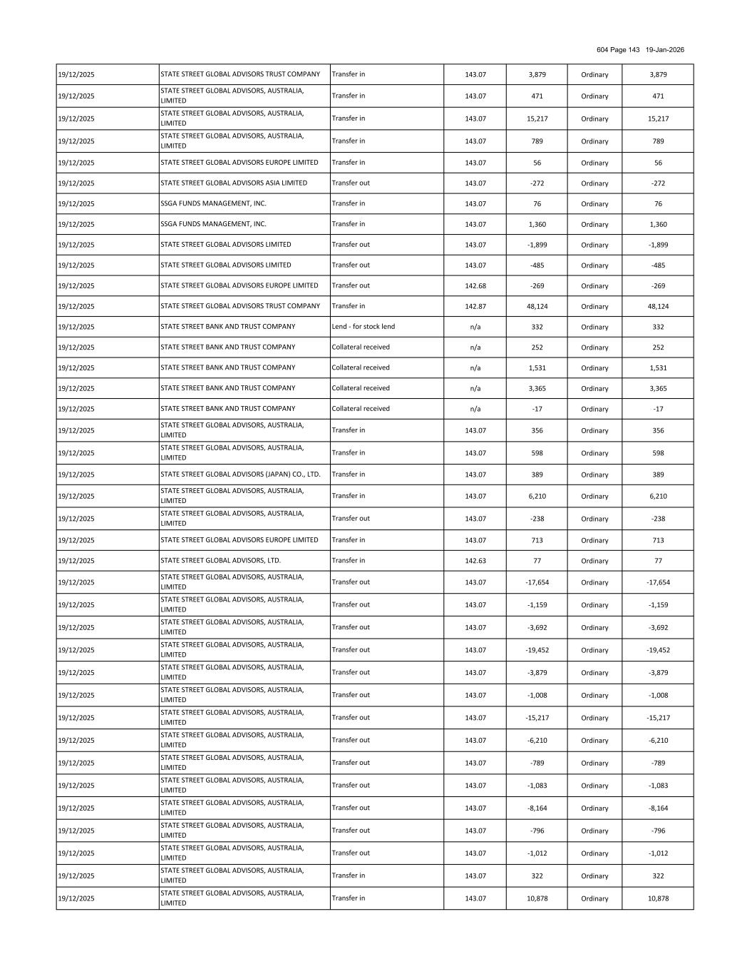 604 Page 155 19-Jan-2026 15/01/2026 n/a 4,748 Ordinary 4,748 15/01/2026 n/a 38,232 Ordinary 38,232 15/01/2026 n/a 1,187 Ordinary 1,187 15/01/2026 n/a 67 Ordinary 67 15/01/2026 n/a 6 Ordinary 6 15/01/2026 n/a 397 Ordinary 397 15/01/2026 n/a 854 Ordinary 854 15/01/2026 n/a 4 Ordinary 4 15/01/2026 n/a 1,062 Ordinary 1,062 15/01/2026 n/a 160,958 Ordinary 160,958 15/01/2026 n/a 18,046 Ordinary 18,046 15/01/2026 n/a 2,269 Ordinary 2,269 15/01/2026 n/a 3,125 Ordinary 3,125 15/01/2026 n/a 418 Ordinary 418 15/01/2026 n/a 8 Ordinary 8 15/01/2026 n/a 1,289 Ordinary 1,289 15/01/2026 n/a 353,848 Ordinary 353,848 15/01/2026 n/a 182,042 Ordinary 182,042 15/01/2026 n/a 329 Ordinary 329 15/01/2026 n/a 1,959 Ordinary 1,959 15/01/2026 n/a 48 Ordinary 48 15/01/2026 n/a 55 Ordinary 55 15/01/2026 n/a 4,384 Ordinary 4,384 15/01/2026 n/a 5,597 Ordinary 5,597 15/01/2026 n/a 567 Ordinary 567 15/01/2026 n/a 407 Ordinary 407 15/01/2026 n/a -1 Ordinary -1 15/01/2026 n/a -2 Ordinary -2 15/01/2026 n/a -1 Ordinary -1 15/01/2026 147.20 680 Ordinary 680 15/01/2026 148.29 2,662 Ordinary 2,662 15/01/2026 147.20 98 Ordinary 98 15/01/2026 147.20 -486 Ordinary -486 15/01/2026 n/a -1 Ordinary -1 15/01/2026 n/a 30 Ordinary 30 15/01/2026 n/a -30,018 Ordinary -30,018 15/01/2026 n/a 85 Ordinary 85 Transfer in STATE STREET BANK AND TRUST COMPANY STATE STREET BANK AND TRUST COMPANY Collateral received STATE STREET BANK AND TRUST COMPANY STATE STREET BANK AND TRUST COMPANY STATE STREET BANK AND TRUST COMPANY Collateral received Collateral received SSGA FUNDS MANAGEMENT, INC. Collateral received SSGA FUNDS MANAGEMENT, INC. Collateral received Collateral received Transfer out STATE STREET BANK AND TRUST COMPANY Collateral received STATE STREET BANK AND TRUST COMPANY Collateral received STATE STREET BANK AND TRUST COMPANY STATE STREET BANK AND TRUST COMPANY STATE STREET BANK AND TRUST COMPANY STATE STREET BANK AND TRUST COMPANY STATE STREET BANK AND TRUST COMPANY Collateral received Collateral received STATE STREET GLOBAL ADVISORS EUROPE LIMITED Collateral received Collateral received STATE STREET BANK AND TRUST COMPANY Collateral received STATE STREET BANK AND TRUST COMPANY Collateral received Collateral received Collateral received Collateral received STATE STREET BANK AND TRUST COMPANY STATE STREET BANK AND TRUST COMPANY STATE STREET BANK AND TRUST COMPANY Collateral received STATE STREET BANK AND TRUST COMPANY Collateral received STATE STREET BANK AND TRUST COMPANY STATE STREET BANK AND TRUST COMPANY Collateral received STATE STREET BANK AND TRUST COMPANY STATE STREET BANK AND TRUST COMPANY Collateral received STATE STREET BANK AND TRUST COMPANY Collateral received STATE STREET BANK AND TRUST COMPANY STATE STREET BANK AND TRUST COMPANY STATE STREET BANK AND TRUST COMPANY STATE STREET BANK AND TRUST COMPANY Collateral received Collateral receivedSTATE STREET BANK AND TRUST COMPANY Collateral received Collateral received Collateral received STATE STREET BANK AND TRUST COMPANY Transfer in STATE STREET BANK AND TRUST COMPANY STATE STREET BANK AND TRUST COMPANY Collateral received Collateral received STATE STREET BANK AND TRUST COMPANY STATE STREET BANK AND TRUST COMPANY Collateral received Collateral received SSGA FUNDS MANAGEMENT, INC. Collateral received Collateral received Transfer in