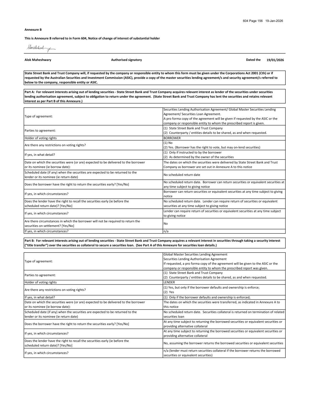 604 Page 156 19-Jan-2026 Annexure B This is Annexure B referred to in Form 604, Notice of change of interest of substantial holder 19/01/2026 Does the lender have the right to recall the securities early (ie before the scheduled return date)? [Yes/No] No, assuming the borrower returns the borrowed securities or equivalent securities If yes, in which circumstances? n/a (lender must return securities collateral if the borrower returns the borrowed securities or equivalent securities) Scheduled date (if any) when the securities are expected to be returned to the lender or its nominee (ie return date) No scheduled return date. Securities collateral is returned on termination of related securities loan Does the borrower have the right to return the securities early? [Yes/No] At any time subject to returning the borrowed securities or equivalent securities or providing alternative collateral If yes, in which circumstances? At any time subject to returning the borrowed securities or equivalent securities or providing alternative collateral Are there any restrictions on voting rights? (1) Yes, but only if the borrower defaults and ownership is enforce; (2) Yes If yes, in what detail? (1) Only if the borrower defaults and ownership is enforced; Date on which the securities were (or are) expected to be delivered to the borrower or its nominee (ie borrow date): The dates on which the securities were transferred, as indicated in Annexure A to this notice Part B: For relevant interests arising out of lending securities - State Street Bank and Trust Company acquires a relevant interest in securities through taking a security interest (“title transfer”) over the securities as collateral to secure a securities loan. (See Part A of this Annexure for securities loan details.) Type of agreement: Global Master Securities Lending Agreement Securities Lending Authorisation Agreement If requested, a pro forma copy of the agreement will be given to the ASIC or the company or responsible entity to whom the prescribed report was given. Parties to agreement: (1) State Street Bank and Trust Company (2) Counterparty / entities details to be shared, as and when requested. Holder of voting rights LENDER If yes, in which circumstances? Lender can require return of securities or equivalent securities at any time subject to giving notice Are there circumstances in which the borrower will not be required to return the securities on settlement? [Yes/No] No If yes, in which circumstances? n/a Does the borrower have the right to return the securities early? [Yes/No] No scheduled return date. Borrower can return securities or equivalent securities at any time subject to giving notice If yes, in which circumstances? Borrower can return securities or equivalent securities at any time subject to giving notice Does the lender have the right to recall the securities early (ie before the scheduled return date)? [Yes/No] No scheduled return date. Lender can require return of securities or equivalent securities at any time subject to giving notice If yes, in what detail? (1) Only if instructed to by the borrower (2) As determined by the owner of the securities Date on which the securities were (or are) expected to be delivered to the borrower or its nominee (ie borrow date): The dates on which the securities were delivered by State Street Bank and Trust Company as borrower are set out in Annexure A to this notice Scheduled date (if any) when the securities are expected to be returned to the lender or its nominee (ie return date) No scheduled return date Parties to agreement: (1) State Street Bank and Trust Company (2) Counterparty / entities details to be shared, as and when requested. Holder of voting rights BORROWER Are there any restrictions on voting rights? (1) No (2) Yes. (Borrower has the right to vote, but may on-lend securities) Alok Maheshwary Authorised signatory Dated the State Street Bank and Trust Company will, if requested by the company or responsible entity to whom this form must be given under the Corporations Act 2001 (Cth) or if requested by the Australian Securities and Investment Commission (ASIC), provide a copy of the master securities lending agreement/s and security agreement/s referred to below to the company, responsible entity or ASIC. Part A: For relevant interests arising out of lending securities - State Street Bank and Trust Company acquires relevant interest as lender of the securities under securities lending authorisation agreement, subject to obligation to return under the agreement. (State Street Bank and Trust Company has lent the securities and retains relevant interest as per Part B of this Annexure.) Type of agreement: Securities Lending Authorisation Agreement/ Global Master Securities Lending Agreement/ Securities Loan Agreement. A pro forma copy of the agreement will be given if requested by the ASIC or the company or responsible entity to whom the prescribed report is given.