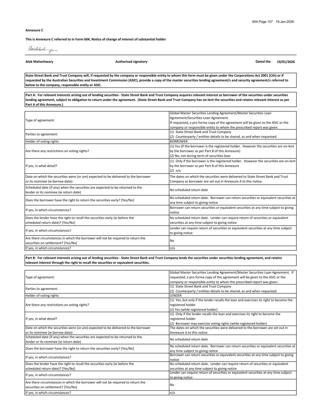 604 Page 157 19-Jan-2026 Annexure C This is Annexure C referred to in Form 604, Notice of change of interest of substantial holder 19/01/2026 If yes, in which circumstances? n/a Does the lender have the right to recall the securities early (ie before the scheduled return date)? [Yes/No] No scheduled return date. Lender can require return of securities or equivalent securities at any time subject to giving notice If yes, in which circumstances? Lender can require return of securities or equivalent securities at any time subject to giving notice Are there circumstances in which the borrower will not be required to return the securities on settlement? [Yes/No] No Scheduled date (if any) when the securities are expected to be returned to the lender or its nominee (ie return date) No scheduled return date Does the borrower have the right to return the securities early? [Yes/No] No scheduled return date. Borrower can return securities or equivalent securities at any time subject to giving notice If yes, in which circumstances? Borrower can return securities or equivalent securities at any time subject to giving notice Are there any restrictions on voting rights? (1) Yes, but only if the lender recalls the loan and exercises its right to become the registered holder (2) Yes (while registered holder) If yes, in what detail? (1) Only if the lender recalls the loan and exercises its right to become the registered holder (2) Borrower may exercise voting rights (while registered holder) Date on which the securities were (or are) expected to be delivered to the borrower or its nominee (ie borrow date): The dates on which the securities were delivered to the borrower are set out in Annexure A to this notice Part B: For relevant interests arising out of lending securities - State Street Bank and Trust Company lends the securities under securities lending agreement, and retains relevant interest through the right to recall the securities or equivalent securities. Type of agreement: Global Master Securities Lending Agreement/Master Securities Loan Agreement. If requested, a pro forma copy of the agreement will be given to the ASIC or the company or responsible entity to whom the prescribed report was given. Parties to agreement: (1) State Street Bank and Trust Company (2) Counterparty / entities details to be shared, as and when requested. Holder of voting rights LENDER If yes, in which circumstances? Lender can require return of securities or equivalent securities at any time subject to giving notice Are there circumstances in which the borrower will not be required to return the securities on settlement? [Yes/No] No If yes, in which circumstances? n/a Does the borrower have the right to return the securities early? [Yes/No] No scheduled return date. Borrower can return securities or equivalent securities at any time subject to giving notice If yes, in which circumstances? Borrower can return securities or equivalent securities at any time subject to giving notice Does the lender have the right to recall the securities early (ie before the scheduled return date)? [Yes/No] No scheduled return date. Lender can require return of securities or equivalent securities at any time subject to giving notice If yes, in what detail? (1) Only if the borrower is the registered holder. However the securities are on-lent by the borrower as per Part B of this Annexure (2) n/a Date on which the securities were (or are) expected to be delivered to the borrower or its nominee (ie borrow date): The dates on which the securities were delivered to State Street Bank and Trust Company as borrower are set out in Annexure A to this notice Scheduled date (if any) when the securities are expected to be returned to the lender or its nominee (ie return date) No scheduled return date Parties to agreement: (1) State Street Bank and Trust Company (2) Counterparty / entities details to be shared, as and when requested. Holder of voting rights BORROWER Are there any restrictions on voting rights? (1) Yes (if the borrower is the registered holder. However the securities are on-lent by the borrower as per Part B of this Annexure) (2) No, not during term of securities loan Alok Maheshwary Authorised signatory Dated the State Street Bank and Trust Company will, if requested by the company or responsible entity to whom this form must be given under the Corporations Act 2001 (Cth) or if requested by the Australian Securities and Investment Commission (ASIC), provide a copy of the master securities lending agreement/s and security agreement/s referred to below to the company, responsible entity or ASIC. Part A: For relevant interests arising out of lending securities - State Street Bank and Trust Company acquires relevant interest as borrower of the securities under securities lending agreement, subject to obligation to return under the agreement. (State Street Bank and Trust Company has on-lent the securities and retains relevant interest as per Part A of this Annexure.) Type of agreement: Global Master Securities Lending Agreement/Master Securities Loan Agreement/Securities Loan Agreement. If requested, a pro forma copy of the agreement will be given to the ASIC or the company or responsible entity to whom the prescribed report was given.
