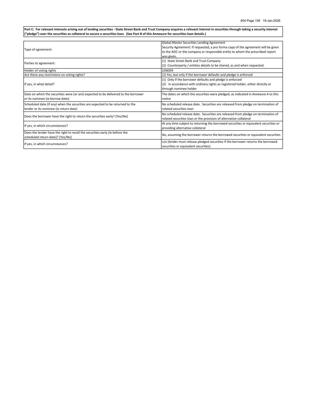 604 Page 158 19-Jan-2026 If yes, in which circumstances? At any time subject to returning the borrowed securities or equivalent securities or providing alternative collateral Does the lender have the right to recall the securities early (ie before the scheduled return date)? [Yes/No] No, assuming the borrower returns the borrowed securities or equivalent securities If yes, in which circumstances? n/a (lender must release pledged securities if the borrower returns the borrowed securities or equivalent securities) Date on which the securities were (or are) expected to be delivered to the borrower or its nominee (ie borrow date): The dates on which the securities were pledged, as indicated in Annexure A to this notice Scheduled date (if any) when the securities are expected to be returned to the lender or its nominee (ie return date) No scheduled release date. Securities are released from pledge on termination of related securities loan Does the borrower have the right to return the securities early? [Yes/No] No scheduled release date. Securities are released from pledge on termination of related securities loan or the provision of alternative collateral Holder of voting rights LENDER Are there any restrictions on voting rights? (1) Yes, but only if the borrower defaults and pledge is enforced If yes, in what detail? (1) Only if the borrower defaults and pledge is enforced (2) In accordance with ordinary rights as registered holder, either directly or through nominee holder Part C: For relevant interests arising out of lending securities - State Street Bank and Trust Company acquires a relevant interest in securities through taking a security interest (“pledge”) over the securities as collateral to secure a securities loan. (See Part B of this Annexure for securities loan details.) Type of agreement: Global Master Securities Lending Agreement Security Agreement: If requested, a pro forma copy of the agreement will be given to the ASIC or the company or responsible entity to whom the prescribed report was given. Parties to agreement: (1) State Street Bank and Trust Company (2) Counterparty / entities details to be shared, as and when requested.