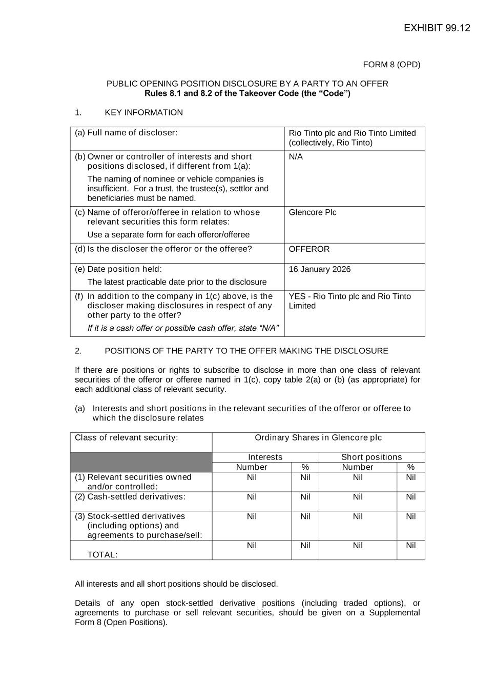 FORM 8 (OPD) PUBLIC OPENING POSITION DISCLOSURE BY A PARTY TO AN OFFER Rules 8.1 and 8.2 of the Takeover Code (the “Code”) 1. KEY INFORMATION (a) Full name of discloser: Rio Tinto plc and Rio Tinto Limited (collectively, Rio Tinto) (b) Owner or controller of interests and short positions disclosed, if different from 1(a): The naming of nominee or vehicle companies is insufficient. For a trust, the trustee(s), settlor and beneficiaries must be named. N/A (c) Name of offeror/offeree in relation to whose relevant securities this form relates: Use a separate form for each offeror/offeree Glencore Plc (d) Is the discloser the offeror or the offeree? OFFEROR (e) Date position held: The latest practicable date prior to the disclosure 16 January 2026 (f) In addition to the company in 1(c) above, is the discloser making disclosures in respect of any other party to the offer? If it is a cash offer or possible cash offer, state “N/A” YES - Rio Tinto plc and Rio Tinto Limited 2. POSITIONS OF THE PARTY TO THE OFFER MAKING THE DISCLOSURE If there are positions or rights to subscribe to disclose in more than one class of relevant securities of the offeror or offeree named in 1(c), copy table 2(a) or (b) (as appropriate) for each additional class of relevant security. (a) Interests and short positions in the relevant securities of the offeror or offeree to which the disclosure relates Class of relevant security: Ordinary Shares in Glencore plc Interests Short positions Number % Number % (1) Relevant securities owned and/or controlled: Nil Nil Nil Nil (2) Cash-settled derivatives: Nil Nil Nil Nil (3) Stock-settled derivatives (including options) and agreements to purchase/sell: Nil Nil Nil Nil TOTAL: Nil Nil Nil Nil All interests and all short positions should be disclosed. Details of any open stock-settled derivative positions (including traded options), or agreements to purchase or sell relevant securities, should be given on a Supplemental Form 8 (Open Positions). EXHIBIT 99.12