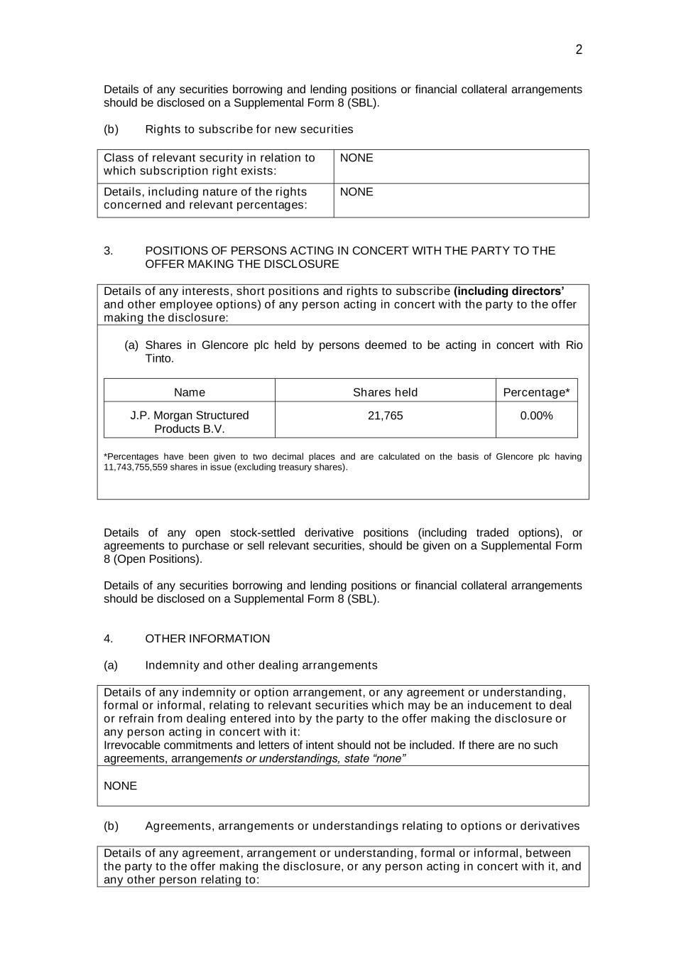 2 Details of any securities borrowing and lending positions or financial collateral arrangements should be disclosed on a Supplemental Form 8 (SBL). (b) Rights to subscribe for new securities Class of relevant security in relation to which subscription right exists: NONE Details, including nature of the rights concerned and relevant percentages: NONE 3. POSITIONS OF PERSONS ACTING IN CONCERT WITH THE PARTY TO THE OFFER MAKING THE DISCLOSURE Details of any interests, short positions and rights to subscribe (including directors’ and other employee options) of any person acting in concert with the party to the offer making the disclosure: (a) Shares in Glencore plc held by persons deemed to be acting in concert with Rio Tinto. Name Shares held Percentage* J.P. Morgan Structured Products B.V. 21,765 0.00% *Percentages have been given to two decimal places and are calculated on the basis of Glencore plc having 11,743,755,559 shares in issue (excluding treasury shares). Details of any open stock-settled derivative positions (including traded options), or agreements to purchase or sell relevant securities, should be given on a Supplemental Form 8 (Open Positions). Details of any securities borrowing and lending positions or financial collateral arrangements should be disclosed on a Supplemental Form 8 (SBL). 4. OTHER INFORMATION (a) Indemnity and other dealing arrangements Details of any indemnity or option arrangement, or any agreement or understanding, formal or informal, relating to relevant securities which may be an inducement to deal or refrain from dealing entered into by the party to the offer making the disclosure or any person acting in concert with it: Irrevocable commitments and letters of intent should not be included. If there are no such agreements, arrangements or understandings, state “none” NONE (b) Agreements, arrangements or understandings relating to options or derivatives Details of any agreement, arrangement or understanding, formal or informal, between the party to the offer making the disclosure, or any person acting in concert with it, and any other person relating to: