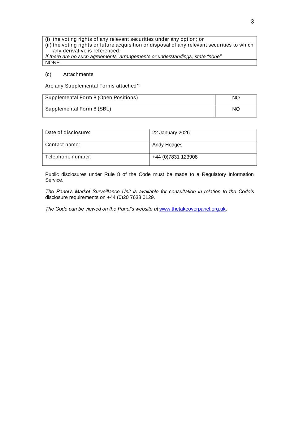 3 (i) the voting rights of any relevant securities under any option; or (ii) the voting rights or future acquisition or disposal of any relevant securities to which any derivative is referenced: If there are no such agreements, arrangements or understandings, state “none” NONE (c) Attachments Are any Supplemental Forms attached? Supplemental Form 8 (Open Positions) NO Supplemental Form 8 (SBL) NO Date of disclosure: 22 January 2026 Contact name: Andy Hodges Telephone number: +44 (0)7831 123908 Public disclosures under Rule 8 of the Code must be made to a Regulatory Information Service. The Panel’s Market Surveillance Unit is available for consultation in relation to the Code’s disclosure requirements on +44 (0)20 7638 0129. The Code can be viewed on the Panel’s website at www.thetakeoverpanel.org.uk.