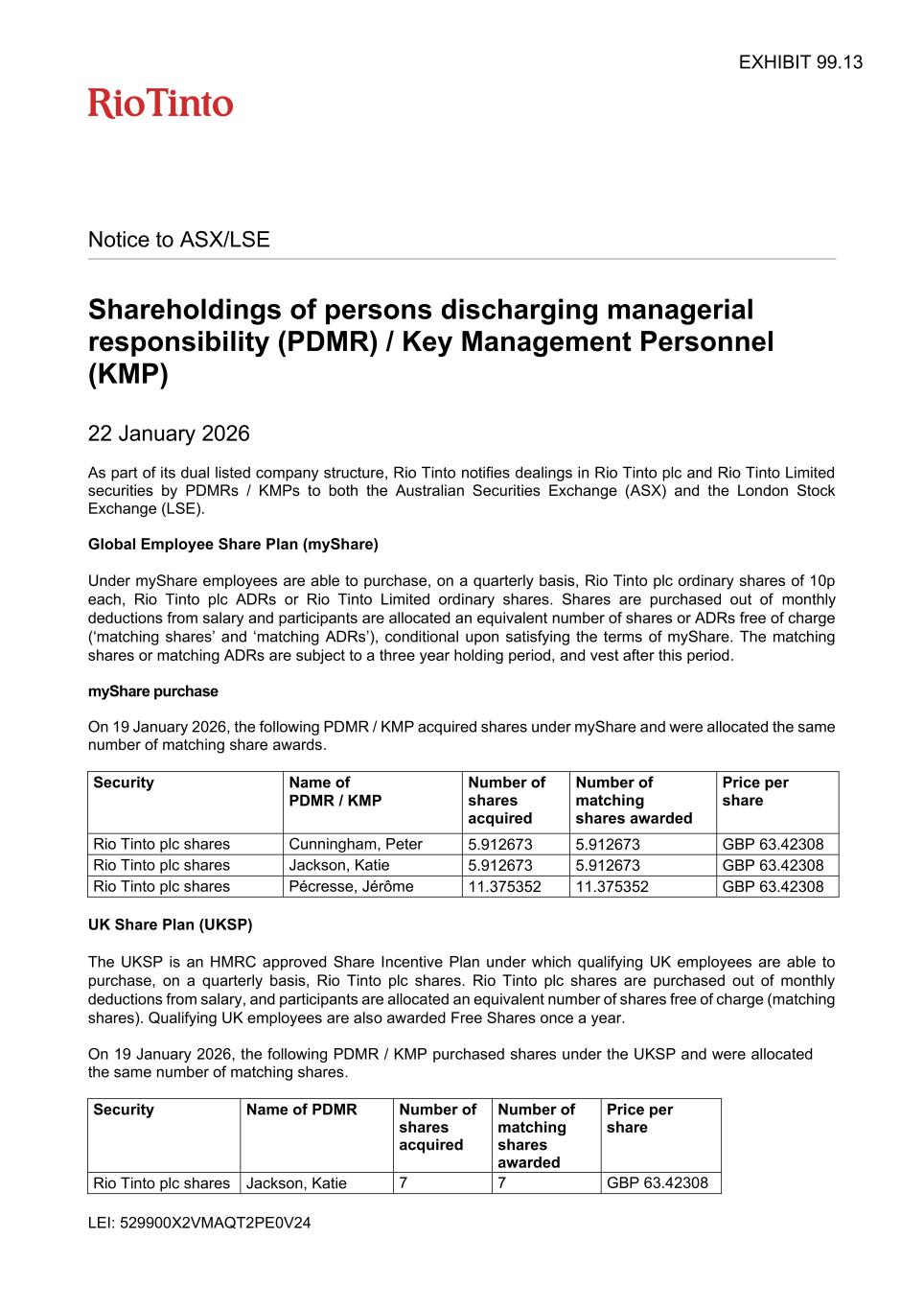 Notice to ASX/LSE Shareholdings of persons discharging managerial responsibility (PDMR) / Key Management Personnel (KMP) 22 January 2026 As part of its dual listed company structure, Rio Tinto notifies dealings in Rio Tinto plc and Rio Tinto Limited securities by PDMRs / KMPs to both the Australian Securities Exchange (ASX) and the London Stock Exchange (LSE). Global Employee Share Plan (myShare) Under myShare employees are able to purchase, on a quarterly basis, Rio Tinto plc ordinary shares of 10p each, Rio Tinto plc ADRs or Rio Tinto Limited ordinary shares. Shares are purchased out of monthly deductions from salary and participants are allocated an equivalent number of shares or ADRs free of charge (‘matching shares’ and ‘matching ADRs’), conditional upon satisfying the terms of myShare. The matching shares or matching ADRs are subject to a three year holding period, and vest after this period. myShare purchase On 19 January 2026, the following PDMR / KMP acquired shares under myShare and were allocated the same number of matching share awards. Security Name of PDMR / KMP Number of shares acquired Number of matching shares awarded Price per share Rio Tinto plc shares Cunningham, Peter 5.912673 5.912673 GBP 63.42308 Rio Tinto plc shares Jackson, Katie 5.912673 5.912673 GBP 63.42308 Rio Tinto plc shares Pécresse, Jérôme 11.375352 11.375352 GBP 63.42308 UK Share Plan (UKSP) The UKSP is an HMRC approved Share Incentive Plan under which qualifying UK employees are able to purchase, on a quarterly basis, Rio Tinto plc shares. Rio Tinto plc shares are purchased out of monthly deductions from salary, and participants are allocated an equivalent number of shares free of charge (matching shares). Qualifying UK employees are also awarded Free Shares once a year. On 19 January 2026, the following PDMR / KMP purchased shares under the UKSP and were allocated the same number of matching shares. Security Name of PDMR Number of shares acquired Number of matching shares awarded Price per share Rio Tinto plc shares Jackson, Katie 7 7 GBP 63.42308 LEI: 529900X2VMAQT2PE0V24 EXHIBIT 99.13
