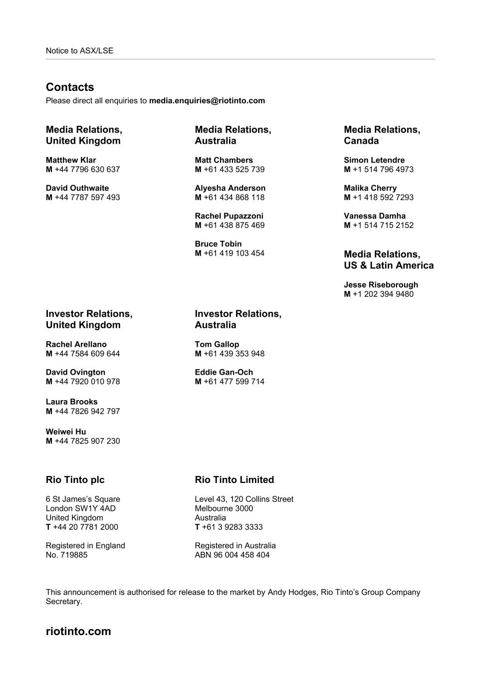 Notice to ASX/LSE Contacts Please direct all enquiries to media.enquiries@riotinto.com Media Relations, United Kingdom Matthew Klar M +44 7796 630 637 David Outhwaite M +44 7787 597 493 Media Relations, Australia Matt Chambers M +61 433 525 739 Alyesha Anderson M +61 434 868 118 Rachel Pupazzoni M +61 438 875 469 Bruce Tobin  M +61 419 103 454 Media Relations, Canada Simon Letendre M +1 514 796 4973 Malika Cherry M +1 418 592 7293 Vanessa Damha M +1 514 715 2152 Media Relations, US & Latin America Jesse Riseborough M +1 202 394 9480 Investor Relations, United Kingdom Rachel Arellano M +44 7584 609 644 David Ovington M +44 7920 010 978 Laura Brooks M +44 7826 942 797 Weiwei Hu M +44 7825 907 230 Investor Relations, Australia Tom Gallop M +61 439 353 948 Eddie Gan-Och M +61 477 599 714 Rio Tinto plc 6 St James’s Square London SW1Y 4AD United Kingdom T +44 20 7781 2000 Registered in England No. 719885 Rio Tinto Limited Level 43, 120 Collins Street Melbourne 3000 Australia T +61 3 9283 3333 Registered in Australia ABN 96 004 458 404 This announcement is authorised for release to the market by Andy Hodges, Rio Tinto’s Group Company Secretary. riotinto.com