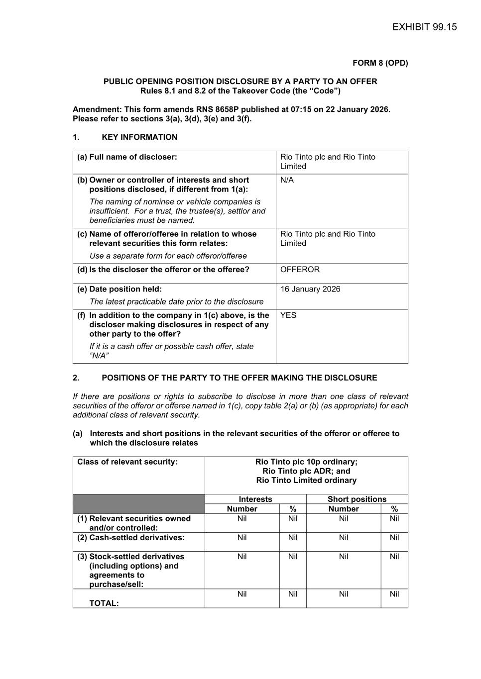 FORM 8 (OPD) PUBLIC OPENING POSITION DISCLOSURE BY A PARTY TO AN OFFER Rules 8.1 and 8.2 of the Takeover Code (the “Code”) Amendment: This form amends RNS 8658P published at 07:15 on 22 January 2026. Please refer to sections 3(a), 3(d), 3(e) and 3(f). 1. KEY INFORMATION (a) Full name of discloser: Rio Tinto plc and Rio Tinto Limited (b) Owner or controller of interests and short positions disclosed, if different from 1(a): The naming of nominee or vehicle companies is insufficient. For a trust, the trustee(s), settlor and beneficiaries must be named. N/A (c) Name of offeror/offeree in relation to whose relevant securities this form relates: Use a separate form for each offeror/offeree Rio Tinto plc and Rio Tinto Limited (d) Is the discloser the offeror or the offeree? OFFEROR (e) Date position held: The latest practicable date prior to the disclosure 16 January 2026 (f) In addition to the company in 1(c) above, is the discloser making disclosures in respect of any other party to the offer? If it is a cash offer or possible cash offer, state “N/A” YES 2. POSITIONS OF THE PARTY TO THE OFFER MAKING THE DISCLOSURE If there are positions or rights to subscribe to disclose in more than one class of relevant securities of the offeror or offeree named in 1(c), copy table 2(a) or (b) (as appropriate) for each additional class of relevant security. (a) Interests and short positions in the relevant securities of the offeror or offeree to which the disclosure relates Class of relevant security: Rio Tinto plc 10p ordinary; Rio Tinto plc ADR; and Rio Tinto Limited ordinary Interests Short positions Number % Number % (1) Relevant securities owned and/or controlled: Nil Nil Nil Nil (2) Cash-settled derivatives: Nil Nil Nil Nil (3) Stock-settled derivatives (including options) and agreements to purchase/sell: Nil Nil Nil Nil TOTAL: Nil Nil Nil Nil EXHIBIT 99.15