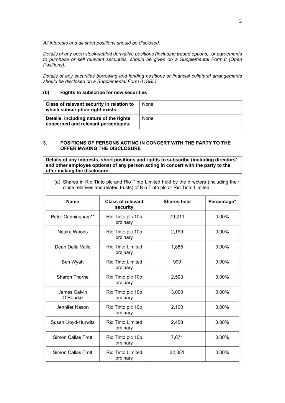 2 All interests and all short positions should be disclosed. Details of any open stock-settled derivative positions (including traded options), or agreements to purchase or sell relevant securities, should be given on a Supplemental Form 8 (Open Positions). Details of any securities borrowing and lending positions or financial collateral arrangements should be disclosed on a Supplemental Form 8 (SBL). (b) Rights to subscribe for new securities Class of relevant security in relation to which subscription right exists: None Details, including nature of the rights concerned and relevant percentages: None 3. POSITIONS OF PERSONS ACTING IN CONCERT WITH THE PARTY TO THE OFFER MAKING THE DISCLOSURE Details of any interests, short positions and rights to subscribe (including directors’ and other employee options) of any person acting in concert with the party to the offer making the disclosure: (a) Shares in Rio Tinto plc and Rio Tinto Limited held by the directors (including their close relatives and related trusts) of Rio Tinto plc or Rio Tinto Limited. Name Class of relevant security Shares held Percentage* Peter Cunningham** Rio Tinto plc 10p ordinary 79,211 0.00% Ngaire Woods Rio Tinto plc 10p ordinary 2,199 0.00% Dean Dalla Valle Rio Tinto Limited ordinary 1,885 0.00% Ben Wyatt Rio Tinto Limited ordinary 900 0.00% Sharon Thorne Rio Tinto plc 10p ordinary 2,593 0.00% James Calvin O’Rourke Rio Tinto plc 10p ordinary 3,000 0.00% Jennifer Nason Rio Tinto plc 10p ordinary 2,100 0.00% Susan Lloyd-Hurwitz Rio Tinto Limited ordinary 2,458 0.00% Simon Callas Trott Rio Tinto plc 10p ordinary 7,671 0.00% Simon Callas Trott Rio Tinto Limited ordinary 32,351 0.00%
