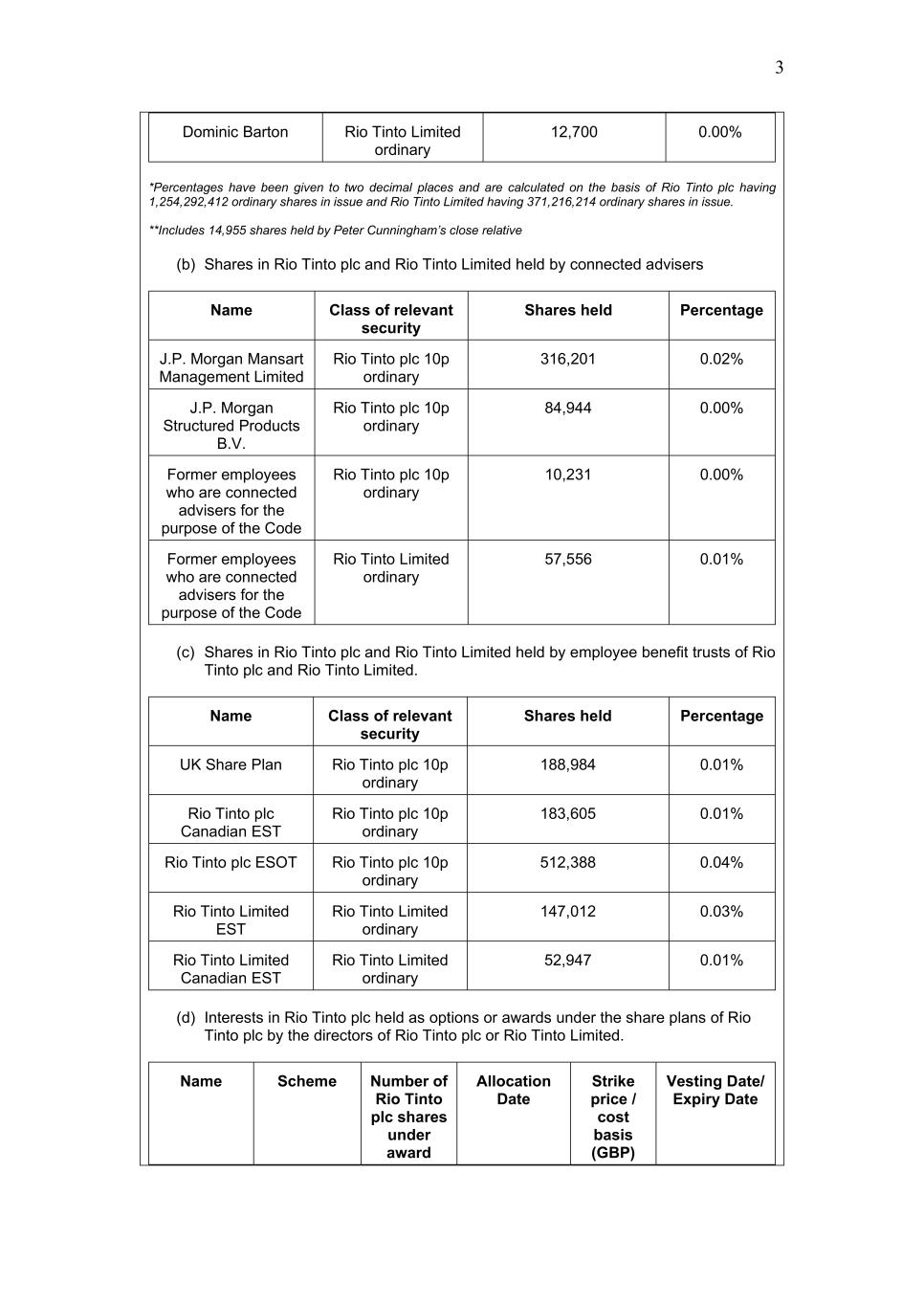 3 Dominic Barton Rio Tinto Limited ordinary 12,700 0.00% *Percentages have been given to two decimal places and are calculated on the basis of Rio Tinto plc having 1,254,292,412 ordinary shares in issue and Rio Tinto Limited having 371,216,214 ordinary shares in issue. **Includes 14,955 shares held by Peter Cunningham’s close relative (b) Shares in Rio Tinto plc and Rio Tinto Limited held by connected advisers Name Class of relevant security Shares held Percentage J.P. Morgan Mansart Management Limited Rio Tinto plc 10p ordinary 316,201 0.02% J.P. Morgan Structured Products B.V. Rio Tinto plc 10p ordinary 84,944 0.00% Former employees who are connected advisers for the purpose of the Code Rio Tinto plc 10p ordinary 10,231 0.00% Former employees who are connected advisers for the purpose of the Code Rio Tinto Limited ordinary 57,556 0.01% (c) Shares in Rio Tinto plc and Rio Tinto Limited held by employee benefit trusts of Rio Tinto plc and Rio Tinto Limited. Name Class of relevant security Shares held Percentage UK Share Plan Rio Tinto plc 10p ordinary 188,984 0.01% Rio Tinto plc Canadian EST Rio Tinto plc 10p ordinary 183,605 0.01% Rio Tinto plc ESOT Rio Tinto plc 10p ordinary 512,388 0.04% Rio Tinto Limited EST Rio Tinto Limited ordinary 147,012 0.03% Rio Tinto Limited Canadian EST Rio Tinto Limited ordinary 52,947 0.01% (d) Interests in Rio Tinto plc held as options or awards under the share plans of Rio Tinto plc by the directors of Rio Tinto plc or Rio Tinto Limited. Name Scheme Number of Rio Tinto plc shares under award Allocation Date Strike price / cost basis (GBP) Vesting Date/ Expiry Date