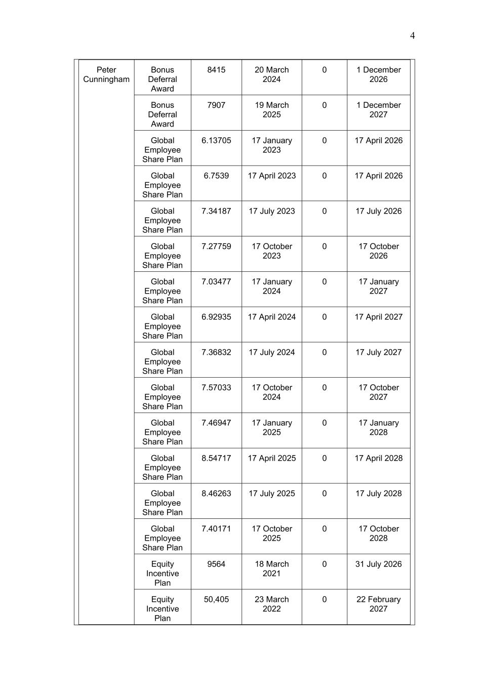 4 Peter Cunningham Bonus Deferral Award 8415 20 March 2024 0 1 December 2026 Bonus Deferral Award 7907 19 March 2025 0 1 December 2027 Global Employee Share Plan 6.13705 17 January 2023 0 17 April 2026 Global Employee Share Plan 6.7539 17 April 2023 0 17 April 2026 Global Employee Share Plan 7.34187 17 July 2023 0 17 July 2026 Global Employee Share Plan 7.27759 17 October 2023 0 17 October 2026 Global Employee Share Plan 7.03477 17 January 2024 0 17 January 2027 Global Employee Share Plan 6.92935 17 April 2024 0 17 April 2027 Global Employee Share Plan 7.36832 17 July 2024 0 17 July 2027 Global Employee Share Plan 7.57033 17 October 2024 0 17 October 2027 Global Employee Share Plan 7.46947 17 January 2025 0 17 January 2028 Global Employee Share Plan 8.54717 17 April 2025 0 17 April 2028 Global Employee Share Plan 8.46263 17 July 2025 0 17 July 2028 Global Employee Share Plan 7.40171 17 October 2025 0 17 October 2028 Equity Incentive Plan 9564 18 March 2021 0 31 July 2026 Equity Incentive Plan 50,405 23 March 2022 0 22 February 2027