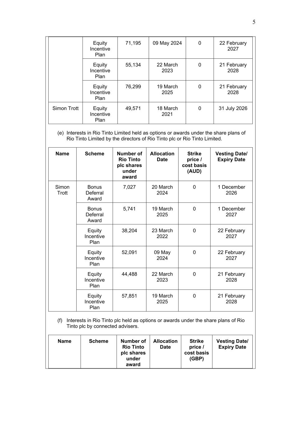5 Equity Incentive Plan 71,195 09 May 2024 0 22 February 2027 Equity Incentive Plan 55,134 22 March 2023 0 21 February 2028 Equity Incentive Plan 76,299 19 March 2025 0 21 February 2028 Simon Trott Equity Incentive Plan 49,571 18 March 2021 0 31 July 2026 (e) Interests in Rio Tinto Limited held as options or awards under the share plans of Rio Tinto Limited by the directors of Rio Tinto plc or Rio Tinto Limited. Name Scheme Number of Rio Tinto plc shares under award Allocation Date Strike price / cost basis (AUD) Vesting Date/ Expiry Date Simon Trott Bonus Deferral Award 7,027 20 March 2024 0 1 December 2026 Bonus Deferral Award 5,741 19 March 2025 0 1 December 2027 Equity Incentive Plan 38,204 23 March 2022 0 22 February 2027 Equity Incentive Plan 52,091 09 May 2024 0 22 February 2027 Equity Incentive Plan 44,488 22 March 2023 0 21 February 2028 Equity Incentive Plan 57,851 19 March 2025 0 21 February 2028 (f) Interests in Rio Tinto plc held as options or awards under the share plans of Rio Tinto plc by connected advisers. Name Scheme Number of Rio Tinto plc shares under award Allocation Date Strike price / cost basis (GBP) Vesting Date/ Expiry Date
