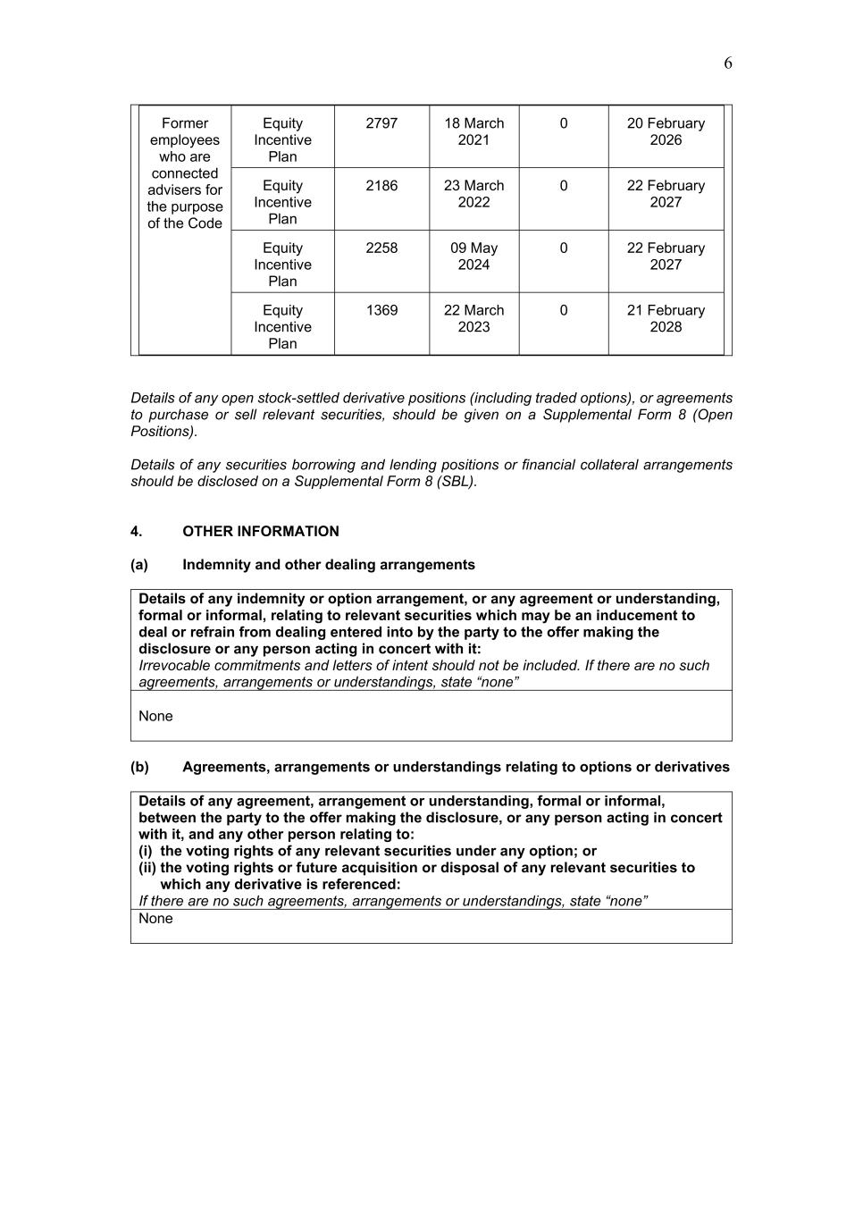 6 Former employees who are connected advisers for the purpose of the Code Equity Incentive Plan 2797 18 March 2021 0 20 February 2026 Equity Incentive Plan 2186 23 March 2022 0 22 February 2027 Equity Incentive Plan 2258 09 May 2024 0 22 February 2027 Equity Incentive Plan 1369 22 March 2023 0 21 February 2028 Details of any open stock-settled derivative positions (including traded options), or agreements to purchase or sell relevant securities, should be given on a Supplemental Form 8 (Open Positions). Details of any securities borrowing and lending positions or financial collateral arrangements should be disclosed on a Supplemental Form 8 (SBL). 4. OTHER INFORMATION (a) Indemnity and other dealing arrangements Details of any indemnity or option arrangement, or any agreement or understanding, formal or informal, relating to relevant securities which may be an inducement to deal or refrain from dealing entered into by the party to the offer making the disclosure or any person acting in concert with it: Irrevocable commitments and letters of intent should not be included. If there are no such agreements, arrangements or understandings, state “none” None (b) Agreements, arrangements or understandings relating to options or derivatives Details of any agreement, arrangement or understanding, formal or informal, between the party to the offer making the disclosure, or any person acting in concert with it, and any other person relating to: (i) the voting rights of any relevant securities under any option; or (ii) the voting rights or future acquisition or disposal of any relevant securities to which any derivative is referenced: If there are no such agreements, arrangements or understandings, state “none” None