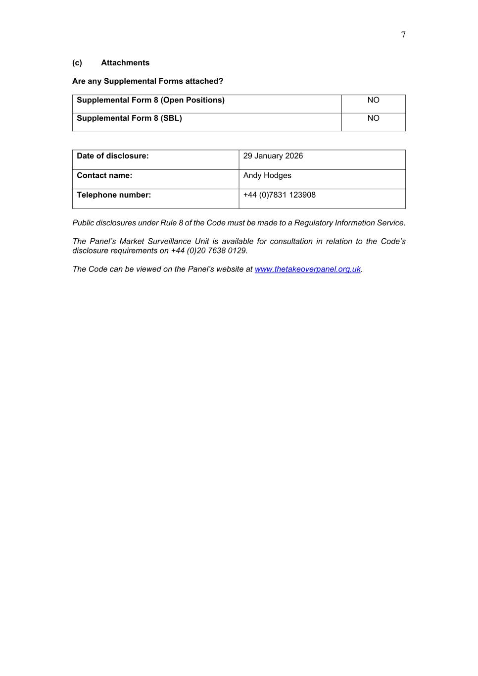 7 (c) Attachments Are any Supplemental Forms attached? Supplemental Form 8 (Open Positions) NO Supplemental Form 8 (SBL) NO Date of disclosure: 29 January 2026 Contact name: Andy Hodges Telephone number: +44 (0)7831 123908 Public disclosures under Rule 8 of the Code must be made to a Regulatory Information Service. The Panel’s Market Surveillance Unit is available for consultation in relation to the Code’s disclosure requirements on +44 (0)20 7638 0129. The Code can be viewed on the Panel’s website at www.thetakeoverpanel.org.uk.