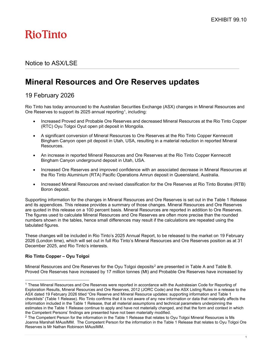 1 Notice to ASX/LSE Mineral Resources and Ore Reserves updates 19 February 2026 Rio Tinto has today announced to the Australian Securities Exchange (ASX) changes in Mineral Resources and Ore Reserves to support its 2025 annual reporting1, including: • Increased Proved and Probable Ore Reserves and decreased Mineral Resources at the Rio Tinto Copper (RTC) Oyu Tolgoi Oyut open pit deposit in Mongolia. • A significant conversion of Mineral Resources to Ore Reserves at the Rio Tinto Copper Kennecott Bingham Canyon open pit deposit in Utah, USA, resulting in a material reduction in reported Mineral Resources. • An increase in reported Mineral Resources and Ore Reserves at the Rio Tinto Copper Kennecott Bingham Canyon underground deposit in Utah, USA. • Increased Ore Reserves and improved confidence with an associated decrease in Mineral Resources at the Rio Tinto Aluminium (RTA) Pacific Operations Amrun deposit in Queensland, Australia. • Increased Mineral Resources and revised classification for the Ore Reserves at Rio Tinto Borates (RTB) Boron deposit. Supporting information for the changes in Mineral Resources and Ore Reserves is set out in the Table 1 Release and its appendices. This release provides a summary of those changes. Mineral Resources and Ore Reserves are quoted in this release on a 100 percent basis. Mineral Resources are reported in addition to Ore Reserves. The figures used to calculate Mineral Resources and Ore Reserves are often more precise than the rounded numbers shown in the tables, hence small differences may result if the calculations are repeated using the tabulated figures. These changes will be included in Rio Tinto’s 2025 Annual Report, to be released to the market on 19 February 2026 (London time), which will set out in full Rio Tinto’s Mineral Resources and Ore Reserves position as at 31 December 2025, and Rio Tinto’s interests. Rio Tinto Copper – Oyu Tolgoi Mineral Resources and Ore Reserves for the Oyu Tolgoi deposits2 are presented in Table A and Table B. Proved Ore Reserves have increased by 17 million tonnes (Mt) and Probable Ore Reserves have increased by 1 These Mineral Resources and Ore Reserves were reported in accordance with the Australasian Code for Reporting of Exploration Results, Mineral Resources and Ore Reserves, 2012 (JORC Code) and the ASX Listing Rules in a release to the ASX dated 19 February 2026 titled “Ore Reserve and Mineral Resource updates: supporting information and Table 1 checklists” (Table 1 Release). Rio Tinto confirms that it is not aware of any new information or data that materially affects the information included in the Table 1 Release, that all material assumptions and technical parameters underpinning the estimates in the Table 1 Release continue to apply and have not materially changed, and that the form and context in which the Competent Persons’ findings are presented have not been materially modified. 2 The Competent Person for the information in the Table 1 Release that relates to Oyu Tolgoi Mineral Resources is Ms Joanna Marshall MAusIMM. The Competent Person for the information in the Table 1 Release that relates to Oyu Tolgoi Ore Reserves is Mr Nathan Robinson MAusIMM. EXHIBIT 99.10