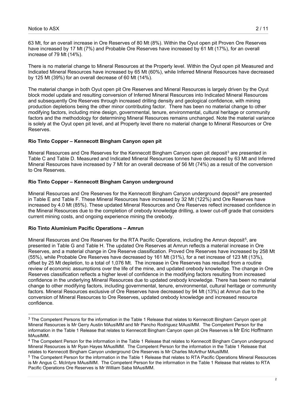Notice to ASX 2 / 11 2 63 Mt, for an overall increase in Ore Reserves of 80 Mt (8%). Within the Oyut open pit Proven Ore Reserves have increased by 17 Mt (7%) and Probable Ore Reserves have increased by 61 Mt (17%), for an overall increase of 79 Mt (14%). There is no material change to Mineral Resources at the Property level. Within the Oyut open pit Measured and Indicated Mineral Resources have increased by 65 Mt (60%), while Inferred Mineral Resources have decreased by 125 Mt (39%) for an overall decrease of 60 Mt (14%). The material change in both Oyut open pit Ore Reserves and Mineral Resources is largely driven by the Oyut block model update and resulting conversion of Inferred Mineral Resources into Indicated Mineral Resources and subsequently Ore Reserves through increased drilling density and geological confidence, with mining production depletions being the other minor contributing factor. There has been no material change to other modifying factors, including mine design, governmental, tenure, environmental, cultural heritage or community factors and the methodology for determining Mineral Resources remains unchanged. Note the material variance is solely at the Oyut open pit level, and at Property level there no material change to Mineral Resources or Ore Reserves. Rio Tinto Copper – Kennecott Bingham Canyon open pit Mineral Resources and Ore Reserves for the Kennecott Bingham Canyon open pit deposit3 are presented in Table C and Table D. Measured and Indicated Mineral Resources tonnes have decreased by 63 Mt and Inferred Mineral Resources have increased by 7 Mt for an overall decrease of 56 Mt (74%) as a result of the conversion to Ore Reserves. Rio Tinto Copper – Kennecott Bingham Canyon underground Mineral Resources and Ore Reserves for the Kennecott Bingham Canyon underground deposit4 are presented in Table E and Table F. These Mineral Resources have increased by 32 Mt (122%) and Ore Reserves have increased by 4.0 Mt (85%). These updated Mineral Resources and Ore Reserves reflect increased confidence in the Mineral Resources due to the completion of orebody knowledge drilling, a lower cut-off grade that considers current mining costs, and ongoing experience mining the orebody. Rio Tinto Aluminium Pacific Operations – Amrun Mineral Resources and Ore Reserves for the RTA Pacific Operations, including the Amrun deposit5, are presented in Table G and Table H. The updated Ore Reserves at Amrun reflects a material increase in Ore Reserves, and a material change in Ore Reserve classification. Proved Ore Reserves have increased by 258 Mt (55%), while Probable Ore Reserves have decreased by 161 Mt (31%), for a net increase of 123 Mt (13%), offset by 25 Mt depletion, to a total of 1,076 Mt. The increase in Ore Reserves has resulted from a routine review of economic assumptions over the life of the mine, and updated orebody knowledge. The change in Ore Reserves classification reflects a higher level of confidence in the modifying factors resulting from increased confidence in the underlying Mineral Resources due to updated orebody knowledge. There has been no material change to other modifying factors, including governmental, tenure, environmental, cultural heritage or community factors. Mineral Resources exclusive of Ore Reserves have decreased by 94 Mt (13%) at Amrun due to the conversion of Mineral Resources to Ore Reserves, updated orebody knowledge and increased resource confidence. 3 The Competent Persons for the information in the Table 1 Release that relates to Kennecott Bingham Canyon open pit Mineral Resources is Mr Gerry Austin MAusIMM and Mr Pancho Rodriguez MAusIMM. The Competent Person for the information in the Table 1 Release that relates to Kennecott Bingham Canyon open pit Ore Reserves is Mr Eric Hoffmann MAusIMM. 4 The Competent Person for the information in the Table 1 Release that relates to Kennecott Bingham Canyon underground Mineral Resources is Mr Ryan Hayes MAusIMM. The Competent Person for the information in the Table 1 Release that relates to Kennecott Bingham Canyon underground Ore Reserves is Mr Charles McArthur MAusIMM. 5 The Competent Person for the information in the Table 1 Release that relates to RTA Pacific Operations Mineral Resources is Mr Angus C. McIntyre MAusIMM. The Competent Person for the information in the Table 1 Release that relates to RTA Pacific Operations Ore Reserves is Mr William Saba MAusIMM.