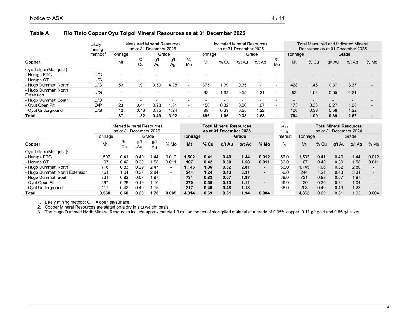 Notice to ASX 4 / 11 4 Table A Rio Tinto Copper Oyu Tolgoi Mineral Resources as at 31 December 2025 Likely mining method1 Measured Mineral Resources as at 31 December 2025 Indicated Mineral Resources as at 31 December 2025 Total Measured and Indicated Mineral Resources as at 31 December 2025 Tonnage Grade Tonnage Grade Tonnage Grade Copper Mt % Cu g/t Au g/t Ag % Mo Mt % Cu g/t Au g/t Ag % Mo Mt % Cu g/t Au g/t Ag % Mo Oyu Tolgoi (Mongolia)2 - Heruga ETG U/G - - - - - - - - - - - - - - - - Heruga OT U/G - - - - - - - - - - - - - - - - Hugo Dummett North3 U/G 53 1.91 0.50 4.28 - 375 1.39 0.35 - - 428 1.45 0.37 3.37 - - Hugo Dummett North Extension U/G - - - - - 83 1.63 0.55 4.21 - 83 1.62 0.55 4.21 - - Hugo Dummett South U/G - - - - - - - - - - - - - - - - Oyut Open Pit O/P 23 0.41 0.28 1.01 - 150 0.32 0.26 1.07 - 173 0.33 0.27 1.06 - - Oyut Underground U/G 12 0.46 0.85 1.24 - 88 0.38 0.55 1.22 - 100 0.39 0.58 1.22 - Total 87 1.32 0.49 3.02 - 696 1.06 0.38 2.63 - 784 1.09 0.39 2.67 - Inferred Mineral Resources as at 31 December 2025 Total Mineral Resources as at 31 December 2025 Rio Tinto interest Total Mineral Resources as at 31 December 2024 Tonnage Grade Tonnage Grade Tonnage Grade Copper Mt % Cu g/t Au g/t Ag % Mo Mt % Cu g/t Au g/t Ag % Mo % Mt % Cu g/t Au g/t Ag % Mo Oyu Tolgoi (Mongolia)2 - Heruga ETG 1,502 0.41 0.40 1.44 0.012 1,502 0.41 0.40 1.44 0.012 56.0 1,502 0.41 0.40 1.44 0.012 - Heruga OT 107 0.42 0.30 1.58 0.011 107 0.42 0.30 1.58 0.011 66.0 107 0.42 0.30 1.58 0.011 - Hugo Dummett North3 716 0.83 0.29 2.47 - 1,143 1.06 0.32 2.81 - 66.0 1,145 1.06 0.32 2.80 - - Hugo Dummett North Extension 161 1.04 0.37 2.84 - 244 1.24 0.43 3.31 - 56.0 244 1.24 0.43 3.31 - - Hugo Dummett South 731 0.83 0.07 1.87 - 731 0.83 0.07 1.87 - 66.0 731 0.83 0.07 1.87 - - Oyut Open Pit 197 0.28 0.19 1.16 - 370 0.30 0.23 1.11 - 66.0 430 0.30 0.21 1.04 - - Oyut Underground 117 0.42 0.40 1.15 - 217 0.40 0.48 1.18 - 66.0 203 0.40 0.49 1.23 - Total 3,530 0.60 0.29 1.78 0.005 4,314 0.69 0.31 1.94 0.004 4,362 0.69 0.31 1.93 0.004 1. Likely mining method: O/P = open pit/surface. 2. Copper Mineral Resources are stated on a dry in situ weight basis. 3. The Hugo Dummett North Mineral Resources include approximately 1.3 million tonnes of stockpiled material at a grade of 0.35% copper, 0.11 g/t gold and 0.85 g/t silver.
