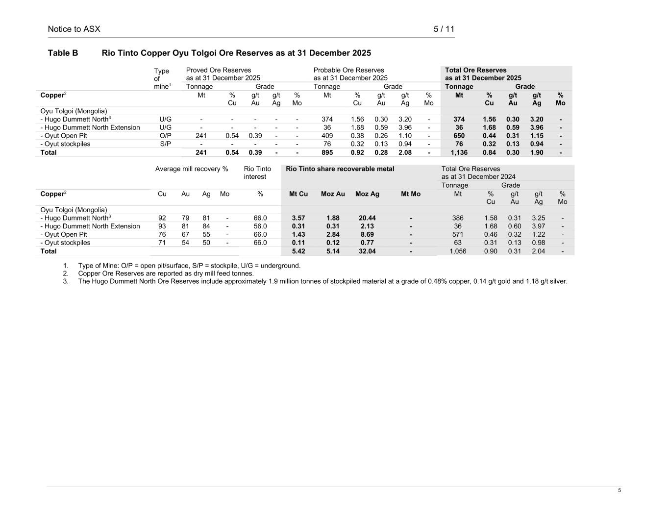 Notice to ASX 5 / 11 5 Table B Rio Tinto Copper Oyu Tolgoi Ore Reserves as at 31 December 2025 Type of mine1 Proved Ore Reserves as at 31 December 2025 Probable Ore Reserves as at 31 December 2025 Total Ore Reserves as at 31 December 2025 Tonnage Grade Tonnage Grade Tonnage Grade Copper2 Mt % Cu g/t Au g/t Ag % Mo Mt % Cu g/t Au g/t Ag % Mo Mt % Cu g/t Au g/t Ag % Mo Oyu Tolgoi (Mongolia) - Hugo Dummett North3 U/G - - - - - 374 1.56 0.30 3.20 - 374 1.56 0.30 3.20 - - Hugo Dummett North Extension U/G - - - - - 36 1.68 0.59 3.96 - 36 1.68 0.59 3.96 - - Oyut Open Pit O/P 241 0.54 0.39 - - 409 0.38 0.26 1.10 - 650 0.44 0.31 1.15 - - Oyut stockpiles S/P - - - - - 76 0.32 0.13 0.94 - 76 0.32 0.13 0.94 - Total 241 0.54 0.39 - - 895 0.92 0.28 2.08 - 1,136 0.84 0.30 1.90 - Average mill recovery % Rio Tinto interest Rio Tinto share recoverable metal Total Ore Reserves as at 31 December 2024 Tonnage Grade Copper2 Cu Au Ag Mo % Mt Cu Moz Au Moz Ag Mt Mo Mt % Cu g/t Au g/t Ag % Mo Oyu Tolgoi (Mongolia) - Hugo Dummett North3 92 79 81 - 66.0 3.57 1.88 20.44 - 386 1.58 0.31 3.25 - - Hugo Dummett North Extension 93 81 84 - 56.0 0.31 0.31 2.13 - 36 1.68 0.60 3.97 - - Oyut Open Pit 76 67 55 - 66.0 1.43 2.84 8.69 - 571 0.46 0.32 1.22 - - Oyut stockpiles 71 54 50 - 66.0 0.11 0.12 0.77 - 63 0.31 0.13 0.98 - Total 5.42 5.14 32.04 - 1,056 0.90 0.31 2.04 - 1. Type of Mine: O/P = open pit/surface, S/P = stockpile, U/G = underground. 2. Copper Ore Reserves are reported as dry mill feed tonnes. 3. The Hugo Dummett North Ore Reserves include approximately 1.9 million tonnes of stockpiled material at a grade of 0.48% copper, 0.14 g/t gold and 1.18 g/t silver.