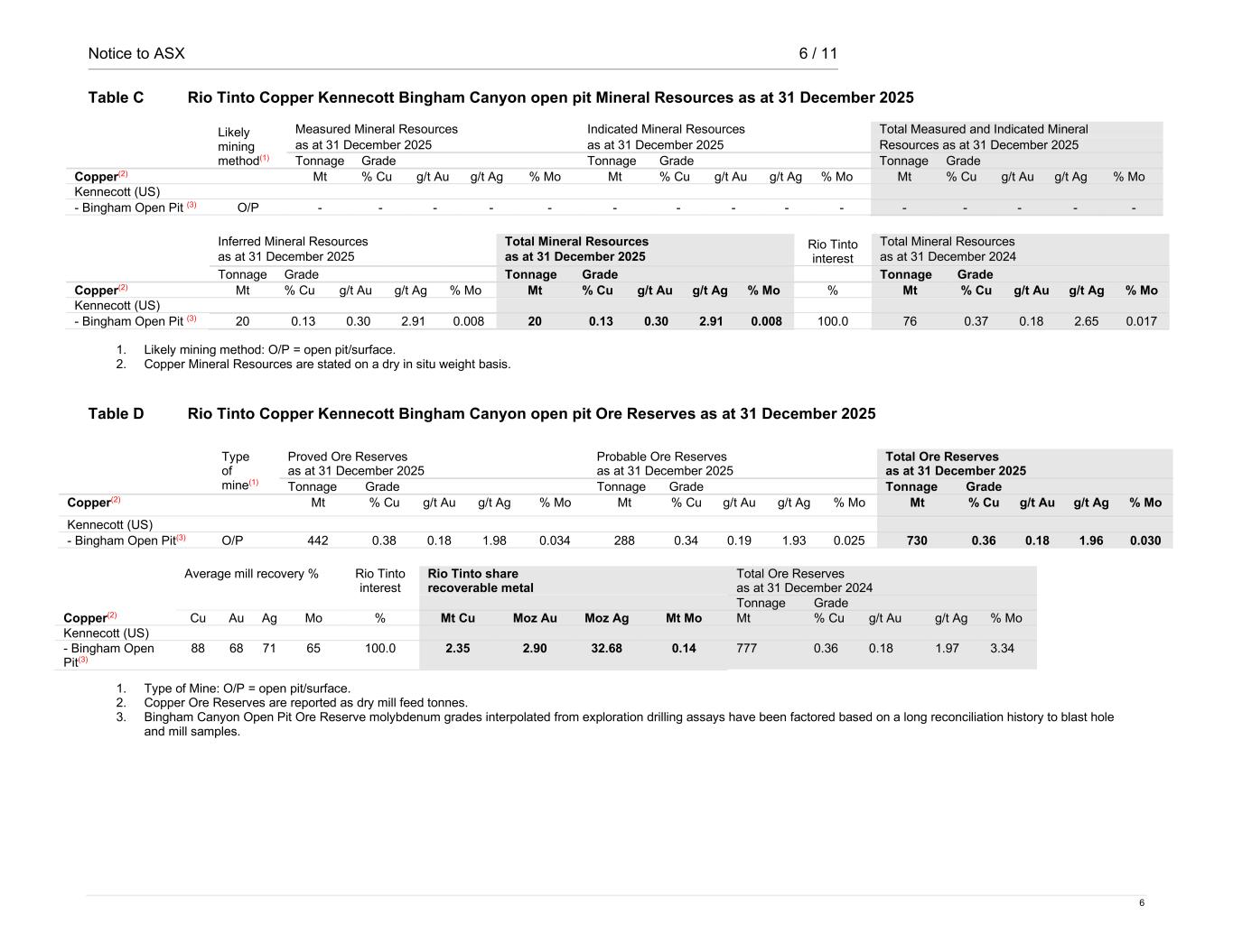 Notice to ASX 6 / 11 6 Table C Rio Tinto Copper Kennecott Bingham Canyon open pit Mineral Resources as at 31 December 2025 Likely mining method(1) Measured Mineral Resources Indicated Mineral Resources Total Measured and Indicated Mineral as at 31 December 2025 as at 31 December 2025 Resources as at 31 December 2025 Tonnage Grade Tonnage Grade Tonnage Grade Copper(2) Mt % Cu g/t Au g/t Ag % Mo Mt % Cu g/t Au g/t Ag % Mo Mt % Cu g/t Au g/t Ag % Mo Kennecott (US) - Bingham Open Pit (3) O/P - - - - - - - - - - - - - - - Inferred Mineral Resources Total Mineral Resources Rio Tinto interest Total Mineral Resources as at 31 December 2025 as at 31 December 2025 as at 31 December 2024 Tonnage Grade Tonnage Grade Tonnage Grade Copper(2) Mt % Cu g/t Au g/t Ag % Mo Mt % Cu g/t Au g/t Ag % Mo % Mt % Cu g/t Au g/t Ag % Mo Kennecott (US) - Bingham Open Pit (3) 20 0.13 0.30 2.91 0.008 20 0.13 0.30 2.91 0.008 100.0 76 0.37 0.18 2.65 0.017 1. Likely mining method: O/P = open pit/surface. 2. Copper Mineral Resources are stated on a dry in situ weight basis. Table D Rio Tinto Copper Kennecott Bingham Canyon open pit Ore Reserves as at 31 December 2025 Average mill recovery % Rio Tinto interest Rio Tinto share recoverable metal Total Ore Reserves as at 31 December 2024 Tonnage Grade Copper(2) Cu Au Ag Mo % Mt Cu Moz Au Moz Ag Mt Mo Mt % Cu g/t Au g/t Ag % Mo Kennecott (US) - Bingham Open Pit(3) 88 68 71 65 100.0 2.35 2.90 32.68 0.14 777 0.36 0.18 1.97 3.34 1. Type of Mine: O/P = open pit/surface. 2. Copper Ore Reserves are reported as dry mill feed tonnes. 3. Bingham Canyon Open Pit Ore Reserve molybdenum grades interpolated from exploration drilling assays have been factored based on a long reconciliation history to blast hole and mill samples. Type of mine(1) Proved Ore Reserves as at 31 December 2025 Probable Ore Reserves as at 31 December 2025 Total Ore Reserves as at 31 December 2025 Tonnage Grade Tonnage Grade Tonnage Grade Copper(2) Mt % Cu g/t Au g/t Ag % Mo Mt % Cu g/t Au g/t Ag % Mo Mt % Cu g/t Au g/t Ag % Mo Kennecott (US) - Bingham Open Pit(3) O/P 442 0.38 0.18 1.98 0.034 288 0.34 0.19 1.93 0.025 730 0.36 0.18 1.96 0.030