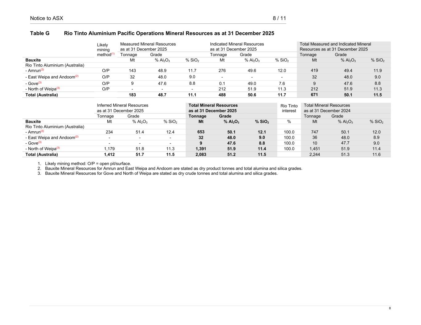 Notice to ASX 8 / 11 8 Table G Rio Tinto Aluminium Pacific Operations Mineral Resources as at 31 December 2025 Likely mining method(1) Measured Mineral Resources Indicated Mineral Resources Total Measured and Indicated Mineral as at 31 December 2025 as at 31 December 2025 Resources as at 31 December 2025 Tonnage Grade Tonnage Grade Tonnage Grade Bauxite Mt % Al2O3 % SiO2 Mt % Al2O3 % SiO2 Mt % Al2O3 % SiO2 Rio Tinto Aluminium (Australia) - Amrun(2) O/P 143 48.9 11.7 276 49.6 12.0 419 49.4 11.9 - East Weipa and Andoom(2) O/P 32 48.0 9.0 - - - 32 48.0 9.0 - Gove(3) O/P 9 47.6 8.8 0.1 49.0 7.6 9 47.6 8.8 - North of Weipa(3) O/P - - - 212 51.9 11.3 212 51.9 11.3 Total (Australia) 183 48.7 11.1 488 50.6 11.7 671 50.1 11.5 Inferred Mineral Resources Total Mineral Resources Rio Tinto interest Total Mineral Resources as at 31 December 2025 as at 31 December 2025 as at 31 December 2024 Tonnage Grade Tonnage Grade Tonnage Grade Bauxite Mt % Al2O3 % SiO2 Mt % Al2O3 % SiO2 % Mt % Al2O3 % SiO2 Rio Tinto Aluminium (Australia) - Amrun(2) 234 51.4 12.4 653 50.1 12.1 100.0 747 50.1 12.0 - East Weipa and Andoom(2) - - - 32 48.0 9.0 100.0 36 48.0 8.9 - Gove(3) - - - 9 47.6 8.8 100.0 10 47.7 9.0 - North of Weipa(3) 1,179 51.8 11.3 1,391 51.9 11.4 100.0 1,451 51.9 11.4 Total (Australia) 1,412 51.7 11.5 2,083 51.2 11.5 2,244 51.3 11.6 1. Likely mining method: O/P = open pit/surface. 2. Bauxite Mineral Resources for Amrun and East Weipa and Andoom are stated as dry product tonnes and total alumina and silica grades. 3. Bauxite Mineral Resources for Gove and North of Weipa are stated as dry crude tonnes and total alumina and silica grades.