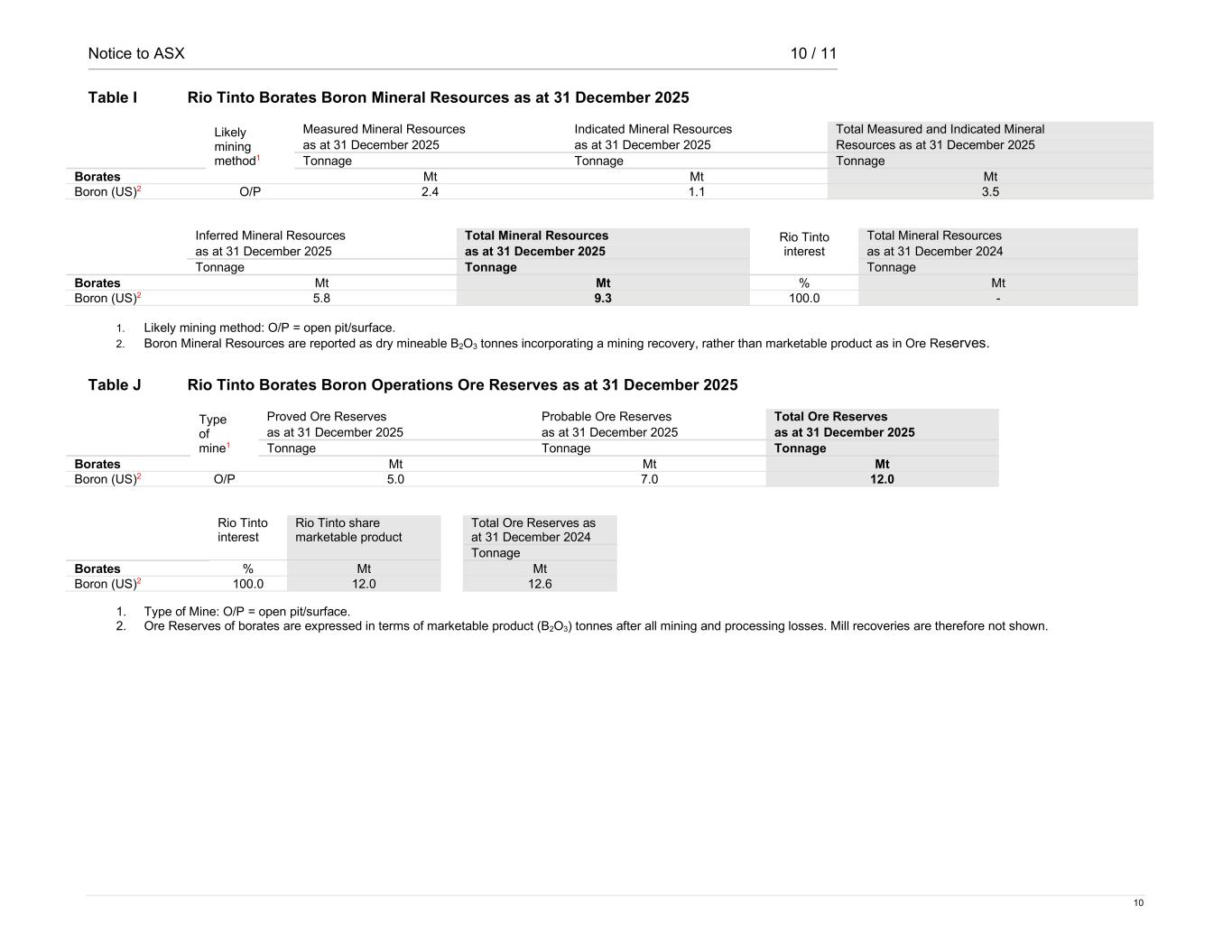 Notice to ASX 10 / 11 10 Table I Rio Tinto Borates Boron Mineral Resources as at 31 December 2025 Likely mining method1 Measured Mineral Resources Indicated Mineral Resources Total Measured and Indicated Mineral as at 31 December 2025 as at 31 December 2025 Resources as at 31 December 2025 Tonnage Tonnage Tonnage Borates Mt Mt Mt Boron (US)2 O/P 2.4 1.1 3.5 Inferred Mineral Resources Total Mineral Resources Rio Tinto interest Total Mineral Resources as at 31 December 2025 as at 31 December 2025 as at 31 December 2024 Tonnage Tonnage Tonnage Borates Mt Mt % Mt Boron (US)2 5.8 9.3 100.0 - 1. Likely mining method: O/P = open pit/surface. 2. Boron Mineral Resources are reported as dry mineable B2O3 tonnes incorporating a mining recovery, rather than marketable product as in Ore Reserves. Table J Rio Tinto Borates Boron Operations Ore Reserves as at 31 December 2025 Type of mine1 Proved Ore Reserves Probable Ore Reserves Total Ore Reserves as at 31 December 2025 as at 31 December 2025 as at 31 December 2025 Tonnage Tonnage Tonnage Borates Mt Mt Mt Boron (US)2 O/P 5.0 7.0 12.0 Rio Tinto interest Rio Tinto share marketable product Total Ore Reserves as at 31 December 2024 Tonnage Borates % Mt Mt Boron (US)2 100.0 12.0 12.6 1. Type of Mine: O/P = open pit/surface. 2. Ore Reserves of borates are expressed in terms of marketable product (B2O3) tonnes after all mining and processing losses. Mill recoveries are therefore not shown.