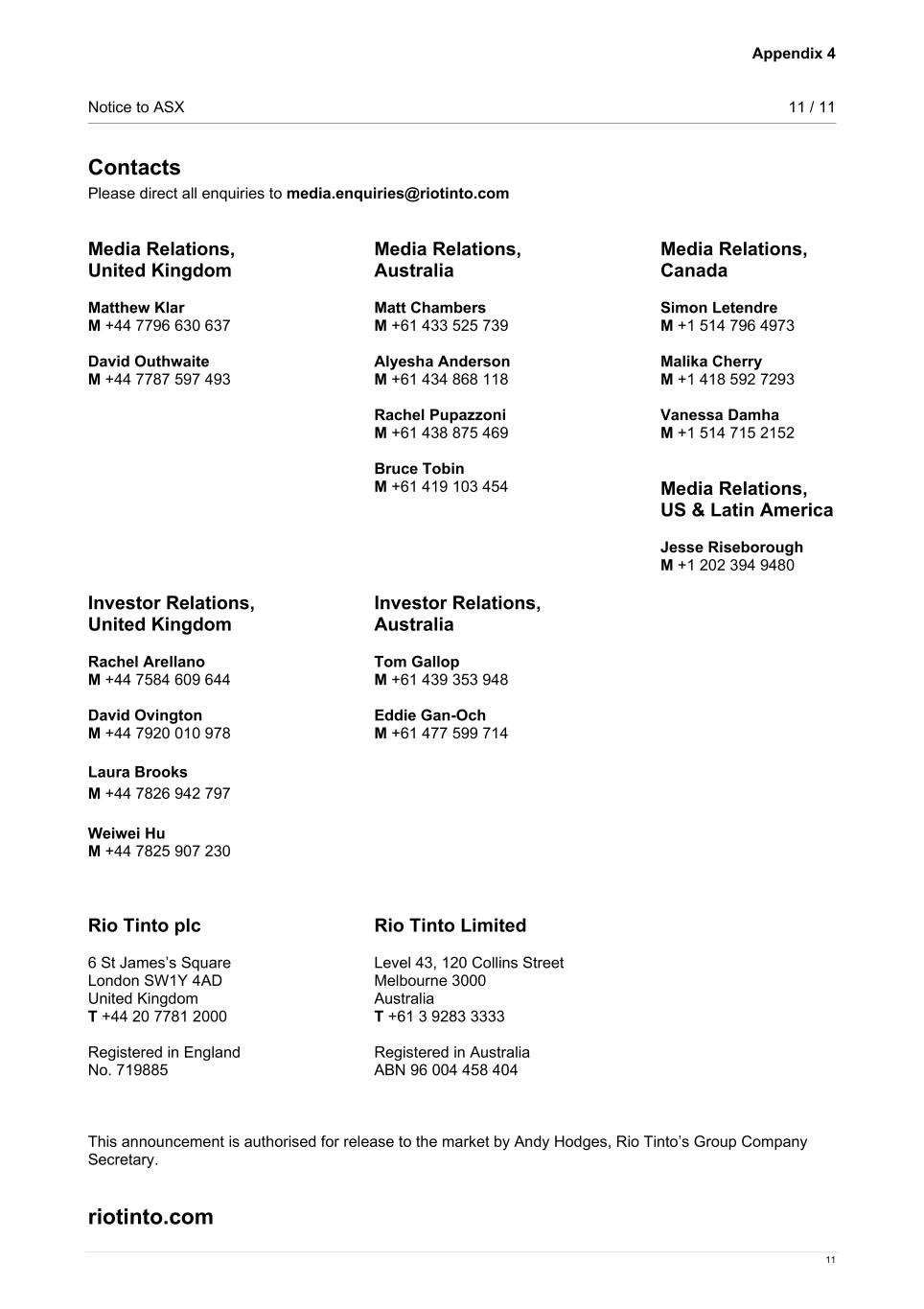 Appendix 4 Notice to ASX 11 / 11 11 Contacts Please direct all enquiries to media.enquiries@riotinto.com Media Relations, United Kingdom Matthew Klar M +44 7796 630 637 David Outhwaite M +44 7787 597 493 Media Relations, Australia Matt Chambers M +61 433 525 739 Alyesha Anderson M +61 434 868 118 Rachel Pupazzoni M +61 438 875 469 Bruce Tobin  M +61 419 103 454 Media Relations, Canada Simon Letendre M +1 514 796 4973 Malika Cherry M +1 418 592 7293 Vanessa Damha M +1 514 715 2152 Media Relations, US & Latin America Jesse Riseborough M +1 202 394 9480 Investor Relations, United Kingdom Rachel Arellano M +44 7584 609 644 David Ovington M +44 7920 010 978 Laura Brooks M +44 7826 942 797 Weiwei Hu M +44 7825 907 230 Investor Relations, Australia Tom Gallop M +61 439 353 948 Eddie Gan-Och M +61 477 599 714 Rio Tinto plc 6 St James’s Square London SW1Y 4AD United Kingdom T +44 20 7781 2000 Registered in England No. 719885 Rio Tinto Limited Level 43, 120 Collins Street Melbourne 3000 Australia T +61 3 9283 3333 Registered in Australia ABN 96 004 458 404 This announcement is authorised for release to the market by Andy Hodges, Rio Tinto’s Group Company Secretary. riotinto.com