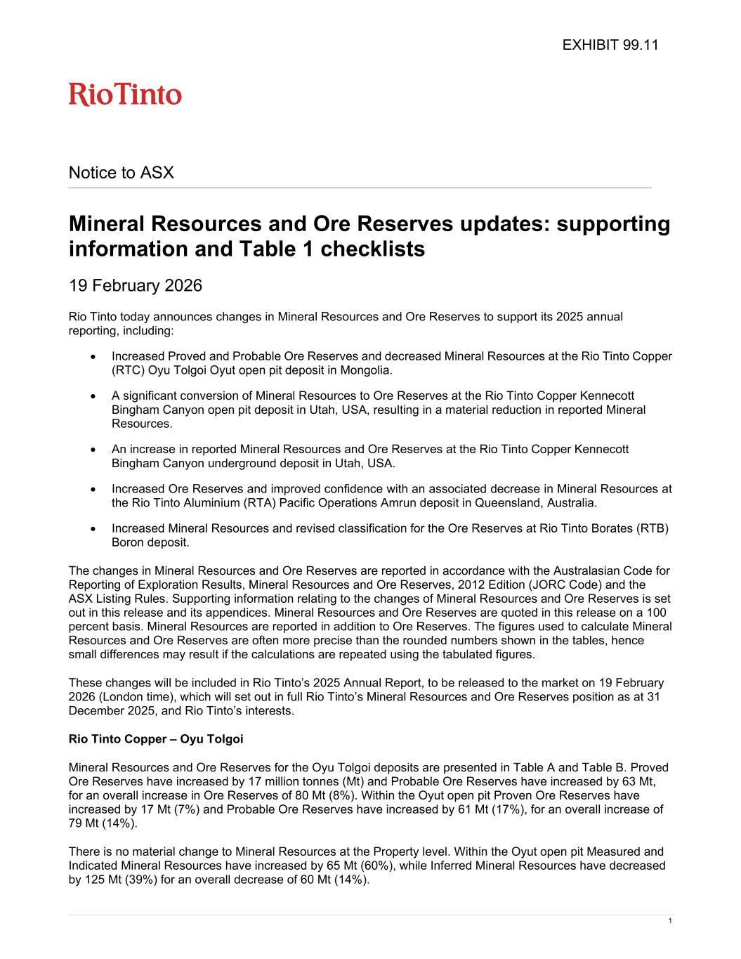 1 Notice to ASX Mineral Resources and Ore Reserves updates: supporting information and Table 1 checklists 19 February 2026 Rio Tinto today announces changes in Mineral Resources and Ore Reserves to support its 2025 annual reporting, including: • Increased Proved and Probable Ore Reserves and decreased Mineral Resources at the Rio Tinto Copper (RTC) Oyu Tolgoi Oyut open pit deposit in Mongolia. • A significant conversion of Mineral Resources to Ore Reserves at the Rio Tinto Copper Kennecott Bingham Canyon open pit deposit in Utah, USA, resulting in a material reduction in reported Mineral Resources. • An increase in reported Mineral Resources and Ore Reserves at the Rio Tinto Copper Kennecott Bingham Canyon underground deposit in Utah, USA. • Increased Ore Reserves and improved confidence with an associated decrease in Mineral Resources at the Rio Tinto Aluminium (RTA) Pacific Operations Amrun deposit in Queensland, Australia. • Increased Mineral Resources and revised classification for the Ore Reserves at Rio Tinto Borates (RTB) Boron deposit. The changes in Mineral Resources and Ore Reserves are reported in accordance with the Australasian Code for Reporting of Exploration Results, Mineral Resources and Ore Reserves, 2012 Edition (JORC Code) and the ASX Listing Rules. Supporting information relating to the changes of Mineral Resources and Ore Reserves is set out in this release and its appendices. Mineral Resources and Ore Reserves are quoted in this release on a 100 percent basis. Mineral Resources are reported in addition to Ore Reserves. The figures used to calculate Mineral Resources and Ore Reserves are often more precise than the rounded numbers shown in the tables, hence small differences may result if the calculations are repeated using the tabulated figures. These changes will be included in Rio Tinto’s 2025 Annual Report, to be released to the market on 19 February 2026 (London time), which will set out in full Rio Tinto’s Mineral Resources and Ore Reserves position as at 31 December 2025, and Rio Tinto’s interests. Rio Tinto Copper – Oyu Tolgoi Mineral Resources and Ore Reserves for the Oyu Tolgoi deposits are presented in Table A and Table B. Proved Ore Reserves have increased by 17 million tonnes (Mt) and Probable Ore Reserves have increased by 63 Mt, for an overall increase in Ore Reserves of 80 Mt (8%). Within the Oyut open pit Proven Ore Reserves have increased by 17 Mt (7%) and Probable Ore Reserves have increased by 61 Mt (17%), for an overall increase of 79 Mt (14%). There is no material change to Mineral Resources at the Property level. Within the Oyut open pit Measured and Indicated Mineral Resources have increased by 65 Mt (60%), while Inferred Mineral Resources have decreased by 125 Mt (39%) for an overall decrease of 60 Mt (14%). EXHIBIT 99.11