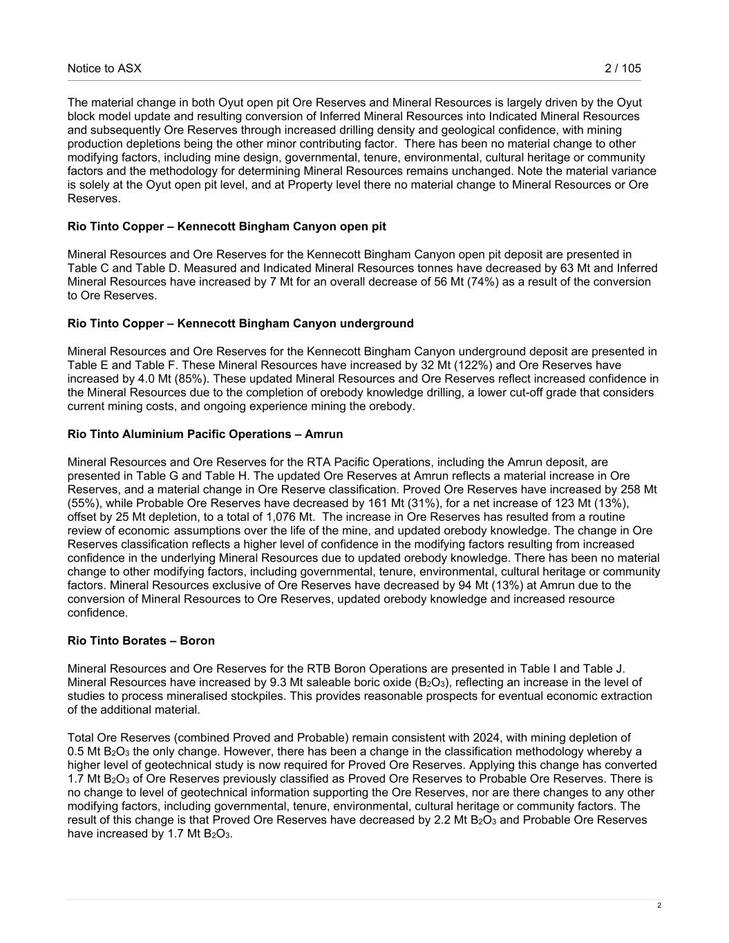 Notice to ASX 2 / 105 2 The material change in both Oyut open pit Ore Reserves and Mineral Resources is largely driven by the Oyut block model update and resulting conversion of Inferred Mineral Resources into Indicated Mineral Resources and subsequently Ore Reserves through increased drilling density and geological confidence, with mining production depletions being the other minor contributing factor. There has been no material change to other modifying factors, including mine design, governmental, tenure, environmental, cultural heritage or community factors and the methodology for determining Mineral Resources remains unchanged. Note the material variance is solely at the Oyut open pit level, and at Property level there no material change to Mineral Resources or Ore Reserves. Rio Tinto Copper – Kennecott Bingham Canyon open pit Mineral Resources and Ore Reserves for the Kennecott Bingham Canyon open pit deposit are presented in Table C and Table D. Measured and Indicated Mineral Resources tonnes have decreased by 63 Mt and Inferred Mineral Resources have increased by 7 Mt for an overall decrease of 56 Mt (74%) as a result of the conversion to Ore Reserves. Rio Tinto Copper – Kennecott Bingham Canyon underground Mineral Resources and Ore Reserves for the Kennecott Bingham Canyon underground deposit are presented in Table E and Table F. These Mineral Resources have increased by 32 Mt (122%) and Ore Reserves have increased by 4.0 Mt (85%). These updated Mineral Resources and Ore Reserves reflect increased confidence in the Mineral Resources due to the completion of orebody knowledge drilling, a lower cut-off grade that considers current mining costs, and ongoing experience mining the orebody. Rio Tinto Aluminium Pacific Operations – Amrun Mineral Resources and Ore Reserves for the RTA Pacific Operations, including the Amrun deposit, are presented in Table G and Table H. The updated Ore Reserves at Amrun reflects a material increase in Ore Reserves, and a material change in Ore Reserve classification. Proved Ore Reserves have increased by 258 Mt (55%), while Probable Ore Reserves have decreased by 161 Mt (31%), for a net increase of 123 Mt (13%), offset by 25 Mt depletion, to a total of 1,076 Mt. The increase in Ore Reserves has resulted from a routine review of economic assumptions over the life of the mine, and updated orebody knowledge. The change in Ore Reserves classification reflects a higher level of confidence in the modifying factors resulting from increased confidence in the underlying Mineral Resources due to updated orebody knowledge. There has been no material change to other modifying factors, including governmental, tenure, environmental, cultural heritage or community factors. Mineral Resources exclusive of Ore Reserves have decreased by 94 Mt (13%) at Amrun due to the conversion of Mineral Resources to Ore Reserves, updated orebody knowledge and increased resource confidence. Rio Tinto Borates – Boron Mineral Resources and Ore Reserves for the RTB Boron Operations are presented in Table I and Table J. Mineral Resources have increased by 9.3 Mt saleable boric oxide (B2O3), reflecting an increase in the level of studies to process mineralised stockpiles. This provides reasonable prospects for eventual economic extraction of the additional material. Total Ore Reserves (combined Proved and Probable) remain consistent with 2024, with mining depletion of 0.5 Mt B2O3 the only change. However, there has been a change in the classification methodology whereby a higher level of geotechnical study is now required for Proved Ore Reserves. Applying this change has converted 1.7 Mt B2O3 of Ore Reserves previously classified as Proved Ore Reserves to Probable Ore Reserves. There is no change to level of geotechnical information supporting the Ore Reserves, nor are there changes to any other modifying factors, including governmental, tenure, environmental, cultural heritage or community factors. The result of this change is that Proved Ore Reserves have decreased by 2.2 Mt B2O3 and Probable Ore Reserves have increased by 1.7 Mt B2O3.