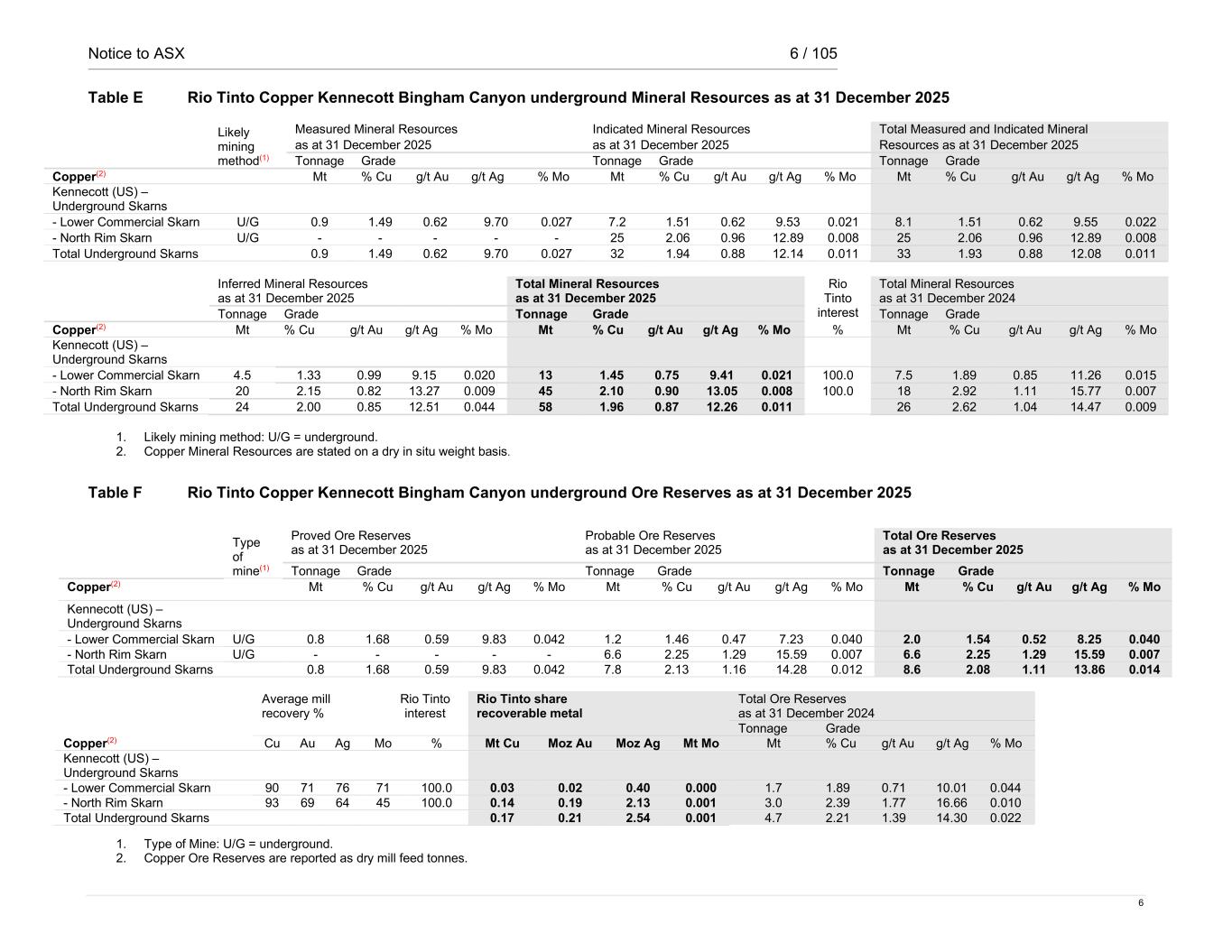 Notice to ASX 6 / 105 6 Table E Rio Tinto Copper Kennecott Bingham Canyon underground Mineral Resources as at 31 December 2025 Likely mining method(1) Measured Mineral Resources Indicated Mineral Resources Total Measured and Indicated Mineral as at 31 December 2025 as at 31 December 2025 Resources as at 31 December 2025 Tonnage Grade Tonnage Grade Tonnage Grade Copper(2) Mt % Cu g/t Au g/t Ag % Mo Mt % Cu g/t Au g/t Ag % Mo Mt % Cu g/t Au g/t Ag % Mo Kennecott (US) – Underground Skarns - Lower Commercial Skarn U/G 0.9 1.49 0.62 9.70 0.027 7.2 1.51 0.62 9.53 0.021 8.1 1.51 0.62 9.55 0.022 - North Rim Skarn U/G - - - - - 25 2.06 0.96 12.89 0.008 25 2.06 0.96 12.89 0.008 Total Underground Skarns 0.9 1.49 0.62 9.70 0.027 32 1.94 0.88 12.14 0.011 33 1.93 0.88 12.08 0.011 Inferred Mineral Resources Total Mineral Resources Rio Tinto interest Total Mineral Resources as at 31 December 2025 as at 31 December 2025 as at 31 December 2024 Tonnage Grade Tonnage Grade Tonnage Grade Copper(2) Mt % Cu g/t Au g/t Ag % Mo Mt % Cu g/t Au g/t Ag % Mo % Mt % Cu g/t Au g/t Ag % Mo Kennecott (US) – Underground Skarns - Lower Commercial Skarn 4.5 1.33 0.99 9.15 0.020 13 1.45 0.75 9.41 0.021 100.0 7.5 1.89 0.85 11.26 0.015 - North Rim Skarn 20 2.15 0.82 13.27 0.009 45 2.10 0.90 13.05 0.008 100.0 18 2.92 1.11 15.77 0.007 Total Underground Skarns 24 2.00 0.85 12.51 0.044 58 1.96 0.87 12.26 0.011 26 2.62 1.04 14.47 0.009 1. Likely mining method: U/G = underground. 2. Copper Mineral Resources are stated on a dry in situ weight basis. Table F Rio Tinto Copper Kennecott Bingham Canyon underground Ore Reserves as at 31 December 2025 Average mill recovery % Rio Tinto interest Rio Tinto share recoverable metal Total Ore Reserves as at 31 December 2024 Tonnage Grade Copper(2) Cu Au Ag Mo % Mt Cu Moz Au Moz Ag Mt Mo Mt % Cu g/t Au g/t Ag % Mo Kennecott (US) – Underground Skarns - Lower Commercial Skarn 90 71 76 71 100.0 0.03 0.02 0.40 0.000 1.7 1.89 0.71 10.01 0.044 - North Rim Skarn 93 69 64 45 100.0 0.14 0.19 2.13 0.001 3.0 2.39 1.77 16.66 0.010 Total Underground Skarns 0.17 0.21 2.54 0.001 4.7 2.21 1.39 14.30 0.022 1. Type of Mine: U/G = underground. 2. Copper Ore Reserves are reported as dry mill feed tonnes. Type of mine(1) Proved Ore Reserves as at 31 December 2025 Probable Ore Reserves as at 31 December 2025 Total Ore Reserves as at 31 December 2025 Tonnage Grade Tonnage Grade Tonnage Grade Copper(2) Mt % Cu g/t Au g/t Ag % Mo Mt % Cu g/t Au g/t Ag % Mo Mt % Cu g/t Au g/t Ag % Mo Kennecott (US) – Underground Skarns - Lower Commercial Skarn U/G 0.8 1.68 0.59 9.83 0.042 1.2 1.46 0.47 7.23 0.040 2.0 1.54 0.52 8.25 0.040 - North Rim Skarn U/G - - - - - 6.6 2.25 1.29 15.59 0.007 6.6 2.25 1.29 15.59 0.007 Total Underground Skarns 0.8 1.68 0.59 9.83 0.042 7.8 2.13 1.16 14.28 0.012 8.6 2.08 1.11 13.86 0.014