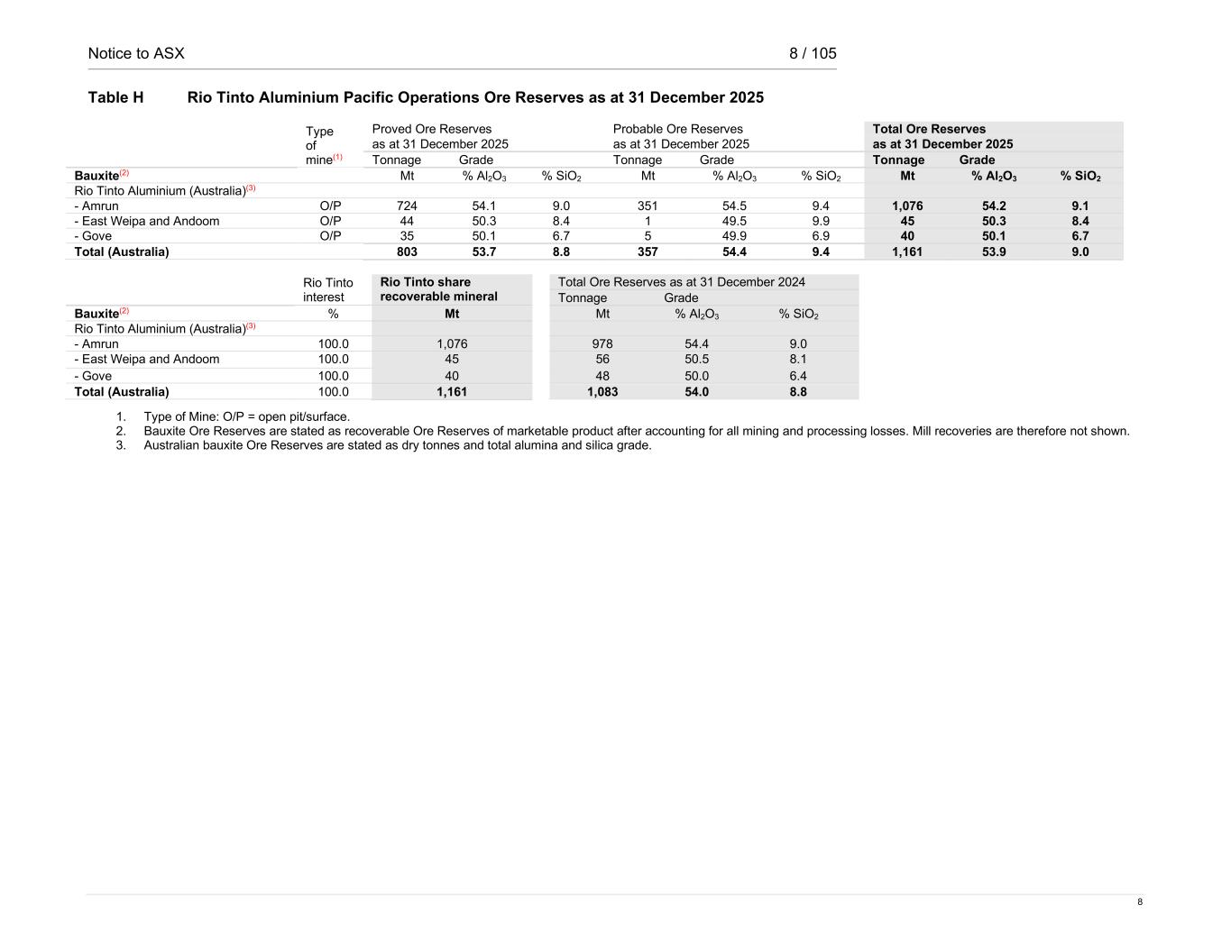 Notice to ASX 8 / 105 8 Table H Rio Tinto Aluminium Pacific Operations Ore Reserves as at 31 December 2025 Type of mine(1) Proved Ore Reserves Probable Ore Reserves Total Ore Reserves as at 31 December 2025 as at 31 December 2025 as at 31 December 2025 Tonnage Grade Tonnage Grade Tonnage Grade Bauxite(2) Mt % Al2O3 % SiO2 Mt % Al2O3 % SiO2 Mt % Al2O3 % SiO2 Rio Tinto Aluminium (Australia)(3) - Amrun O/P 724 54.1 9.0 351 54.5 9.4 1,076 54.2 9.1 - East Weipa and Andoom O/P 44 50.3 8.4 1 49.5 9.9 45 50.3 8.4 - Gove O/P 35 50.1 6.7 5 49.9 6.9 40 50.1 6.7 Total (Australia) 803 53.7 8.8 357 54.4 9.4 1,161 53.9 9.0 Rio Tinto interest Rio Tinto share recoverable mineral Total Ore Reserves as at 31 December 2024 Tonnage Grade Bauxite(2) % Mt Mt % Al2O3 % SiO2 Rio Tinto Aluminium (Australia)(3) - Amrun 100.0 1,076 978 54.4 9.0 - East Weipa and Andoom 100.0 45 56 50.5 8.1 - Gove 100.0 40 48 50.0 6.4 Total (Australia) 100.0 1,161 1,083 54.0 8.8 1. Type of Mine: O/P = open pit/surface. 2. Bauxite Ore Reserves are stated as recoverable Ore Reserves of marketable product after accounting for all mining and processing losses. Mill recoveries are therefore not shown. 3. Australian bauxite Ore Reserves are stated as dry tonnes and total alumina and silica grade.