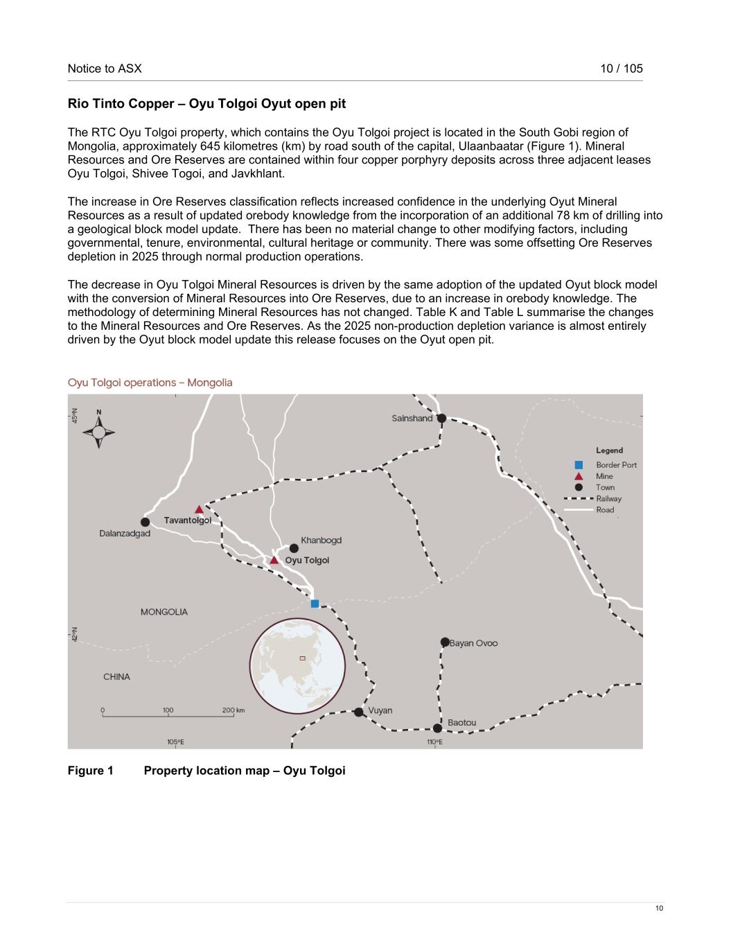 Notice to ASX 10 / 105 10 Rio Tinto Copper – Oyu Tolgoi Oyut open pit The RTC Oyu Tolgoi property, which contains the Oyu Tolgoi project is located in the South Gobi region of Mongolia, approximately 645 kilometres (km) by road south of the capital, Ulaanbaatar (Figure 1). Mineral Resources and Ore Reserves are contained within four copper porphyry deposits across three adjacent leases Oyu Tolgoi, Shivee Togoi, and Javkhlant. The increase in Ore Reserves classification reflects increased confidence in the underlying Oyut Mineral Resources as a result of updated orebody knowledge from the incorporation of an additional 78 km of drilling into a geological block model update. There has been no material change to other modifying factors, including governmental, tenure, environmental, cultural heritage or community. There was some offsetting Ore Reserves depletion in 2025 through normal production operations. The decrease in Oyu Tolgoi Mineral Resources is driven by the same adoption of the updated Oyut block model with the conversion of Mineral Resources into Ore Reserves, due to an increase in orebody knowledge. The methodology of determining Mineral Resources has not changed. Table K and Table L summarise the changes to the Mineral Resources and Ore Reserves. As the 2025 non-production depletion variance is almost entirely driven by the Oyut block model update this release focuses on the Oyut open pit. Figure 1 Property location map – Oyu Tolgoi