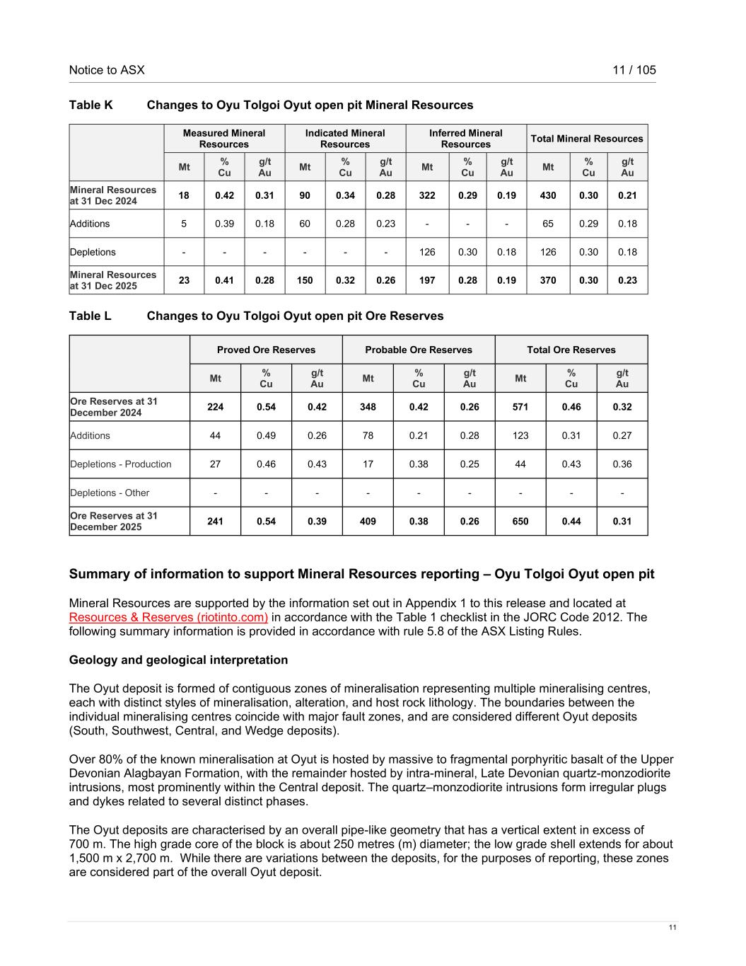 Notice to ASX 11 / 105 11 Table K Changes to Oyu Tolgoi Oyut open pit Mineral Resources Measured Mineral Resources Indicated Mineral Resources Inferred Mineral Resources Total Mineral Resources Mt % Cu g/t Au Mt % Cu g/t Au Mt % Cu g/t Au Mt % Cu g/t Au Mineral Resources at 31 Dec 2024 18 0.42 0.31 90 0.34 0.28 322 0.29 0.19 430 0.30 0.21 Additions 5 0.39 0.18 60 0.28 0.23 - - - 65 0.29 0.18 Depletions - - - - - - 126 0.30 0.18 126 0.30 0.18 Mineral Resources at 31 Dec 2025 23 0.41 0.28 150 0.32 0.26 197 0.28 0.19 370 0.30 0.23 Table L Changes to Oyu Tolgoi Oyut open pit Ore Reserves Proved Ore Reserves Probable Ore Reserves Total Ore Reserves Mt % Cu g/t Au Mt % Cu g/t Au Mt % Cu g/t Au Ore Reserves at 31 December 2024 224 0.54 0.42 348 0.42 0.26 571 0.46 0.32 Additions 44 0.49 0.26 78 0.21 0.28 123 0.31 0.27 Depletions - Production 27 0.46 0.43 17 0.38 0.25 44 0.43 0.36 Depletions - Other - - - - - - - - - Ore Reserves at 31 December 2025 241 0.54 0.39 409 0.38 0.26 650 0.44 0.31 Summary of information to support Mineral Resources reporting – Oyu Tolgoi Oyut open pit Mineral Resources are supported by the information set out in Appendix 1 to this release and located at Resources & Reserves (riotinto.com) in accordance with the Table 1 checklist in the JORC Code 2012. The following summary information is provided in accordance with rule 5.8 of the ASX Listing Rules. Geology and geological interpretation The Oyut deposit is formed of contiguous zones of mineralisation representing multiple mineralising centres, each with distinct styles of mineralisation, alteration, and host rock lithology. The boundaries between the individual mineralising centres coincide with major fault zones, and are considered different Oyut deposits (South, Southwest, Central, and Wedge deposits). Over 80% of the known mineralisation at Oyut is hosted by massive to fragmental porphyritic basalt of the Upper Devonian Alagbayan Formation, with the remainder hosted by intra-mineral, Late Devonian quartz-monzodiorite intrusions, most prominently within the Central deposit. The quartz–monzodiorite intrusions form irregular plugs and dykes related to several distinct phases. The Oyut deposits are characterised by an overall pipe-like geometry that has a vertical extent in excess of 700 m. The high grade core of the block is about 250 metres (m) diameter; the low grade shell extends for about 1,500 m x 2,700 m. While there are variations between the deposits, for the purposes of reporting, these zones are considered part of the overall Oyut deposit.