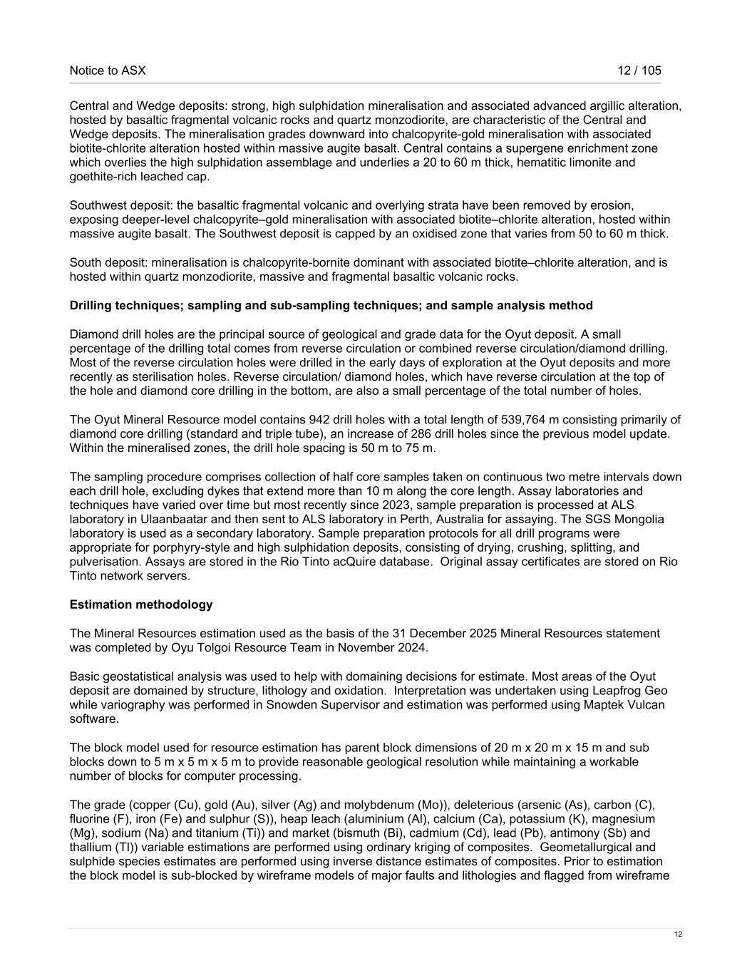 Notice to ASX 12 / 105 12 Central and Wedge deposits: strong, high sulphidation mineralisation and associated advanced argillic alteration, hosted by basaltic fragmental volcanic rocks and quartz monzodiorite, are characteristic of the Central and Wedge deposits. The mineralisation grades downward into chalcopyrite-gold mineralisation with associated biotite-chlorite alteration hosted within massive augite basalt. Central contains a supergene enrichment zone which overlies the high sulphidation assemblage and underlies a 20 to 60 m thick, hematitic limonite and goethite-rich leached cap. Southwest deposit: the basaltic fragmental volcanic and overlying strata have been removed by erosion, exposing deeper-level chalcopyrite–gold mineralisation with associated biotite–chlorite alteration, hosted within massive augite basalt. The Southwest deposit is capped by an oxidised zone that varies from 50 to 60 m thick. South deposit: mineralisation is chalcopyrite-bornite dominant with associated biotite–chlorite alteration, and is hosted within quartz monzodiorite, massive and fragmental basaltic volcanic rocks. Drilling techniques; sampling and sub-sampling techniques; and sample analysis method Diamond drill holes are the principal source of geological and grade data for the Oyut deposit. A small percentage of the drilling total comes from reverse circulation or combined reverse circulation/diamond drilling. Most of the reverse circulation holes were drilled in the early days of exploration at the Oyut deposits and more recently as sterilisation holes. Reverse circulation/ diamond holes, which have reverse circulation at the top of the hole and diamond core drilling in the bottom, are also a small percentage of the total number of holes. The Oyut Mineral Resource model contains 942 drill holes with a total length of 539,764 m consisting primarily of diamond core drilling (standard and triple tube), an increase of 286 drill holes since the previous model update. Within the mineralised zones, the drill hole spacing is 50 m to 75 m. The sampling procedure comprises collection of half core samples taken on continuous two metre intervals down each drill hole, excluding dykes that extend more than 10 m along the core length. Assay laboratories and techniques have varied over time but most recently since 2023, sample preparation is processed at ALS laboratory in Ulaanbaatar and then sent to ALS laboratory in Perth, Australia for assaying. The SGS Mongolia laboratory is used as a secondary laboratory. Sample preparation protocols for all drill programs were appropriate for porphyry-style and high sulphidation deposits, consisting of drying, crushing, splitting, and pulverisation. Assays are stored in the Rio Tinto acQuire database. Original assay certificates are stored on Rio Tinto network servers. Estimation methodology The Mineral Resources estimation used as the basis of the 31 December 2025 Mineral Resources statement was completed by Oyu Tolgoi Resource Team in November 2024. Basic geostatistical analysis was used to help with domaining decisions for estimate. Most areas of the Oyut deposit are domained by structure, lithology and oxidation. Interpretation was undertaken using Leapfrog Geo while variography was performed in Snowden Supervisor and estimation was performed using Maptek Vulcan software. The block model used for resource estimation has parent block dimensions of 20 m x 20 m x 15 m and sub blocks down to 5 m x 5 m x 5 m to provide reasonable geological resolution while maintaining a workable number of blocks for computer processing. The grade (copper (Cu), gold (Au), silver (Ag) and molybdenum (Mo)), deleterious (arsenic (As), carbon (C), fluorine (F), iron (Fe) and sulphur (S)), heap leach (aluminium (Al), calcium (Ca), potassium (K), magnesium (Mg), sodium (Na) and titanium (Ti)) and market (bismuth (Bi), cadmium (Cd), lead (Pb), antimony (Sb) and thallium (Tl)) variable estimations are performed using ordinary kriging of composites. Geometallurgical and sulphide species estimates are performed using inverse distance estimates of composites. Prior to estimation the block model is sub-blocked by wireframe models of major faults and lithologies and flagged from wireframe