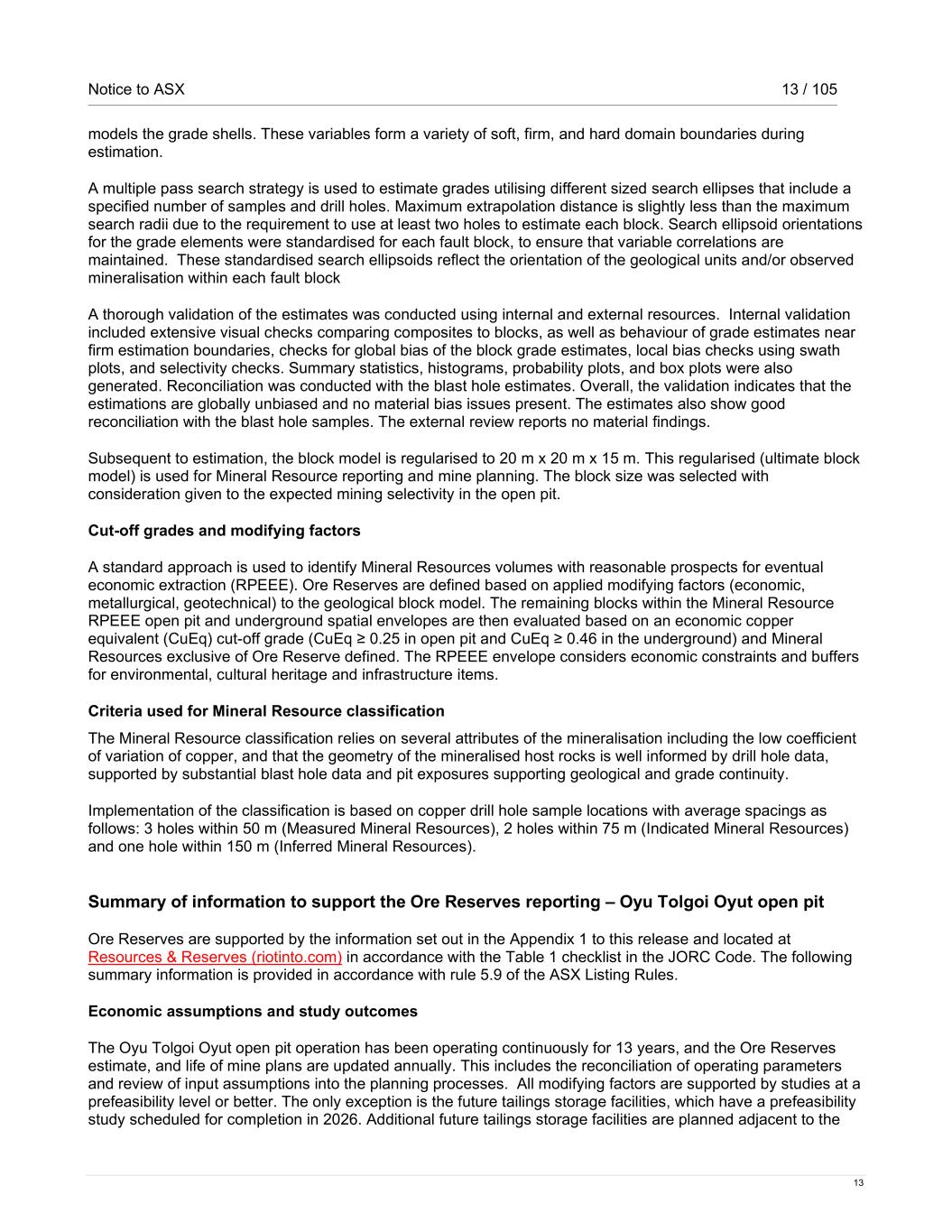 Notice to ASX 13 / 105 13 models the grade shells. These variables form a variety of soft, firm, and hard domain boundaries during estimation. A multiple pass search strategy is used to estimate grades utilising different sized search ellipses that include a specified number of samples and drill holes. Maximum extrapolation distance is slightly less than the maximum search radii due to the requirement to use at least two holes to estimate each block. Search ellipsoid orientations for the grade elements were standardised for each fault block, to ensure that variable correlations are maintained. These standardised search ellipsoids reflect the orientation of the geological units and/or observed mineralisation within each fault block A thorough validation of the estimates was conducted using internal and external resources. Internal validation included extensive visual checks comparing composites to blocks, as well as behaviour of grade estimates near firm estimation boundaries, checks for global bias of the block grade estimates, local bias checks using swath plots, and selectivity checks. Summary statistics, histograms, probability plots, and box plots were also generated. Reconciliation was conducted with the blast hole estimates. Overall, the validation indicates that the estimations are globally unbiased and no material bias issues present. The estimates also show good reconciliation with the blast hole samples. The external review reports no material findings. Subsequent to estimation, the block model is regularised to 20 m x 20 m x 15 m. This regularised (ultimate block model) is used for Mineral Resource reporting and mine planning. The block size was selected with consideration given to the expected mining selectivity in the open pit. Cut-off grades and modifying factors A standard approach is used to identify Mineral Resources volumes with reasonable prospects for eventual economic extraction (RPEEE). Ore Reserves are defined based on applied modifying factors (economic, metallurgical, geotechnical) to the geological block model. The remaining blocks within the Mineral Resource RPEEE open pit and underground spatial envelopes are then evaluated based on an economic copper equivalent (CuEq) cut-off grade (CuEq ≥ 0.25 in open pit and CuEq ≥ 0.46 in the underground) and Mineral Resources exclusive of Ore Reserve defined. The RPEEE envelope considers economic constraints and buffers for environmental, cultural heritage and infrastructure items. Criteria used for Mineral Resource classification The Mineral Resource classification relies on several attributes of the mineralisation including the low coefficient of variation of copper, and that the geometry of the mineralised host rocks is well informed by drill hole data, supported by substantial blast hole data and pit exposures supporting geological and grade continuity. Implementation of the classification is based on copper drill hole sample locations with average spacings as follows: 3 holes within 50 m (Measured Mineral Resources), 2 holes within 75 m (Indicated Mineral Resources) and one hole within 150 m (Inferred Mineral Resources). Summary of information to support the Ore Reserves reporting – Oyu Tolgoi Oyut open pit Ore Reserves are supported by the information set out in the Appendix 1 to this release and located at Resources & Reserves (riotinto.com) in accordance with the Table 1 checklist in the JORC Code. The following summary information is provided in accordance with rule 5.9 of the ASX Listing Rules. Economic assumptions and study outcomes The Oyu Tolgoi Oyut open pit operation has been operating continuously for 13 years, and the Ore Reserves estimate, and life of mine plans are updated annually. This includes the reconciliation of operating parameters and review of input assumptions into the planning processes. All modifying factors are supported by studies at a prefeasibility level or better. The only exception is the future tailings storage facilities, which have a prefeasibility study scheduled for completion in 2026. Additional future tailings storage facilities are planned adjacent to the