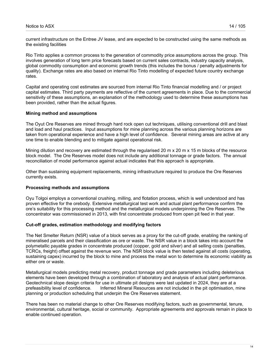 Notice to ASX 14 / 105 14 current infrastructure on the Entree JV lease, and are expected to be constructed using the same methods as the existing facilities Rio Tinto applies a common process to the generation of commodity price assumptions across the group. This involves generation of long term price forecasts based on current sales contracts, industry capacity analysis, global commodity consumption and economic growth trends (this includes the bonus / penalty adjustments for quality). Exchange rates are also based on internal Rio Tinto modelling of expected future country exchange rates. Capital and operating cost estimates are sourced from internal Rio Tinto financial modelling and / or project capital estimates. Third party payments are reflective of the current agreements in place. Due to the commercial sensitivity of these assumptions, an explanation of the methodology used to determine these assumptions has been provided, rather than the actual figures. Mining method and assumptions The Oyut Ore Reserves are mined through hard rock open cut techniques, utilising conventional drill and blast and load and haul practices. Input assumptions for mine planning across the various planning horizons are taken from operational experience and have a high level of confidence. Several mining areas are active at any one time to enable blending and to mitigate against operational risk. Mining dilution and recovery are estimated through the regularised 20 m x 20 m x 15 m blocks of the resource block model. The Ore Reserves model does not include any additional tonnage or grade factors. The annual reconciliation of model performance against actual indicates that this approach is appropriate. Other than sustaining equipment replacements, mining infrastructure required to produce the Ore Reserves currently exists. Processing methods and assumptions Oyu Tolgoi employs a conventional crushing, milling, and flotation process, which is well understood and has proven effective for the orebody. Extensive metallurgical test work and actual plant performance confirm the ore’s suitability for this processing method and the metallurgical models underpinning the Ore Reserves. The concentrator was commissioned in 2013, with first concentrate produced from open pit feed in that year. Cut-off grades, estimation methodology and modifying factors The Net Smelter Return (NSR) value of a block serves as a proxy for the cut-off grade, enabling the ranking of mineralised parcels and their classification as ore or waste. The NSR value in a block takes into account the polymetallic payable grades in concentrate produced (copper, gold and silver) and all selling costs (penalties, TCRCs, freight) offset against the revenue won. The NSR block value is then tested against all costs (operating, sustaining capex) incurred by the block to mine and process the metal won to determine its economic viability as either ore or waste. Metallurgical models predicting metal recovery, product tonnage and grade parameters including deleterious elements have been developed through a combination of laboratory and analysis of actual plant performance. Geotechnical slope design criteria for use in ultimate pit designs were last updated in 2024, they are at a prefeasibility level of confidence. Inferred Mineral Resources are not included in the pit optimisation, mine planning or production scheduling that underpin the Ore Reserves statement. There has been no material change to other Ore Reserves modifying factors, such as governmental, tenure, environmental, cultural heritage, social or community. Appropriate agreements and approvals remain in place to enable continued operation.