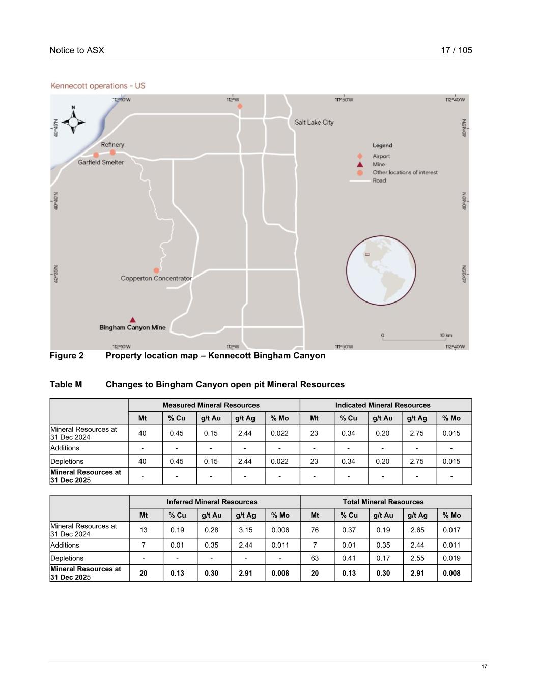 Notice to ASX 17 / 105 17 Figure 2 Property location map – Kennecott Bingham Canyon Table M Changes to Bingham Canyon open pit Mineral Resources Measured Mineral Resources Indicated Mineral Resources Mt % Cu g/t Au g/t Ag % Mo Mt % Cu g/t Au g/t Ag % Mo Mineral Resources at 31 Dec 2024 40 0.45 0.15 2.44 0.022 23 0.34 0.20 2.75 0.015 Additions - - - - - - - - - - Depletions 40 0.45 0.15 2.44 0.022 23 0.34 0.20 2.75 0.015 Mineral Resources at 31 Dec 2025 - - - - - - - - - - Inferred Mineral Resources Total Mineral Resources Mt % Cu g/t Au g/t Ag % Mo Mt % Cu g/t Au g/t Ag % Mo Mineral Resources at 31 Dec 2024 13 0.19 0.28 3.15 0.006 76 0.37 0.19 2.65 0.017 Additions 7 0.01 0.35 2.44 0.011 7 0.01 0.35 2.44 0.011 Depletions - - - - - 63 0.41 0.17 2.55 0.019 Mineral Resources at 31 Dec 2025 20 0.13 0.30 2.91 0.008 20 0.13 0.30 2.91 0.008