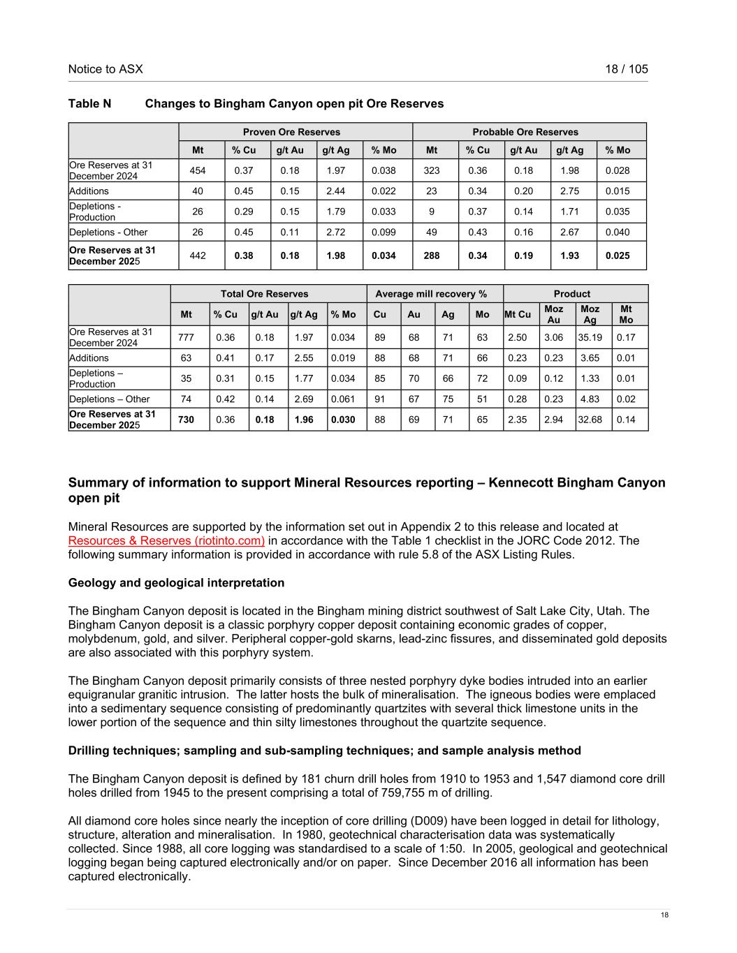 Notice to ASX 18 / 105 18 Table N Changes to Bingham Canyon open pit Ore Reserves Proven Ore Reserves Probable Ore Reserves Mt % Cu g/t Au g/t Ag % Mo Mt % Cu g/t Au g/t Ag % Mo Ore Reserves at 31 December 2024 454 0.37 0.18 1.97 0.038 323 0.36 0.18 1.98 0.028 Additions 40 0.45 0.15 2.44 0.022 23 0.34 0.20 2.75 0.015 Depletions - Production 26 0.29 0.15 1.79 0.033 9 0.37 0.14 1.71 0.035 Depletions - Other 26 0.45 0.11 2.72 0.099 49 0.43 0.16 2.67 0.040 Ore Reserves at 31 December 2025 442 0.38 0.18 1.98 0.034 288 0.34 0.19 1.93 0.025 Total Ore Reserves Average mill recovery % Product Mt % Cu g/t Au g/t Ag % Mo Cu Au Ag Mo Mt Cu Moz Au Moz Ag Mt Mo Ore Reserves at 31 December 2024 777 0.36 0.18 1.97 0.034 89 68 71 63 2.50 3.06 35.19 0.17 Additions 63 0.41 0.17 2.55 0.019 88 68 71 66 0.23 0.23 3.65 0.01 Depletions – Production 35 0.31 0.15 1.77 0.034 85 70 66 72 0.09 0.12 1.33 0.01 Depletions – Other 74 0.42 0.14 2.69 0.061 91 67 75 51 0.28 0.23 4.83 0.02 Ore Reserves at 31 December 2025 730 0.36 0.18 1.96 0.030 88 69 71 65 2.35 2.94 32.68 0.14 Summary of information to support Mineral Resources reporting – Kennecott Bingham Canyon open pit Mineral Resources are supported by the information set out in Appendix 2 to this release and located at Resources & Reserves (riotinto.com) in accordance with the Table 1 checklist in the JORC Code 2012. The following summary information is provided in accordance with rule 5.8 of the ASX Listing Rules. Geology and geological interpretation The Bingham Canyon deposit is located in the Bingham mining district southwest of Salt Lake City, Utah. The Bingham Canyon deposit is a classic porphyry copper deposit containing economic grades of copper, molybdenum, gold, and silver. Peripheral copper-gold skarns, lead-zinc fissures, and disseminated gold deposits are also associated with this porphyry system. The Bingham Canyon deposit primarily consists of three nested porphyry dyke bodies intruded into an earlier equigranular granitic intrusion. The latter hosts the bulk of mineralisation. The igneous bodies were emplaced into a sedimentary sequence consisting of predominantly quartzites with several thick limestone units in the lower portion of the sequence and thin silty limestones throughout the quartzite sequence. Drilling techniques; sampling and sub-sampling techniques; and sample analysis method The Bingham Canyon deposit is defined by 181 churn drill holes from 1910 to 1953 and 1,547 diamond core drill holes drilled from 1945 to the present comprising a total of 759,755 m of drilling. All diamond core holes since nearly the inception of core drilling (D009) have been logged in detail for lithology, structure, alteration and mineralisation. In 1980, geotechnical characterisation data was systematically collected. Since 1988, all core logging was standardised to a scale of 1:50. In 2005, geological and geotechnical logging began being captured electronically and/or on paper. Since December 2016 all information has been captured electronically.
